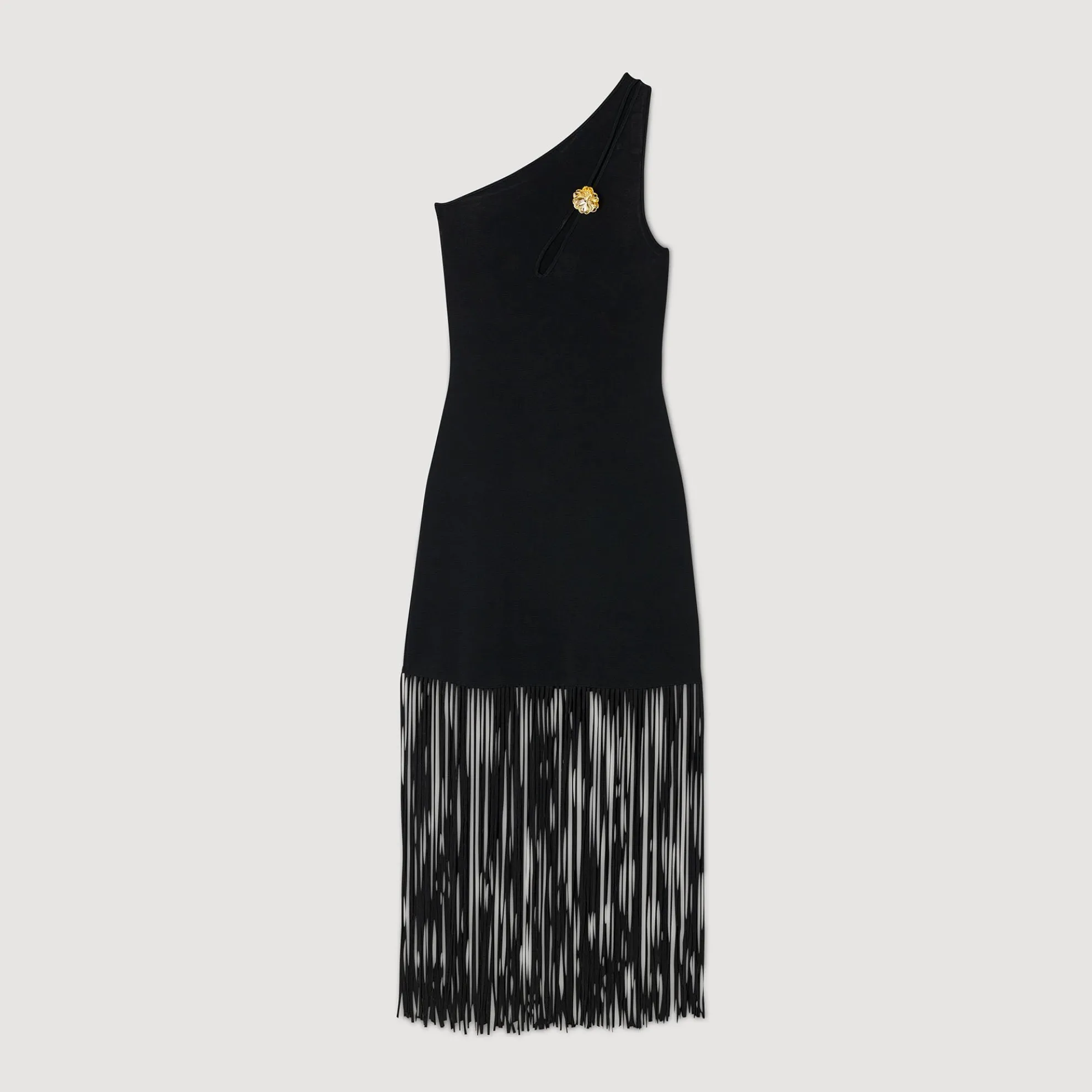 Asymmetrische gebreide midi jurk met dubbele schouderbandjes, een afneembare broche en rokgedeelte met franjes.