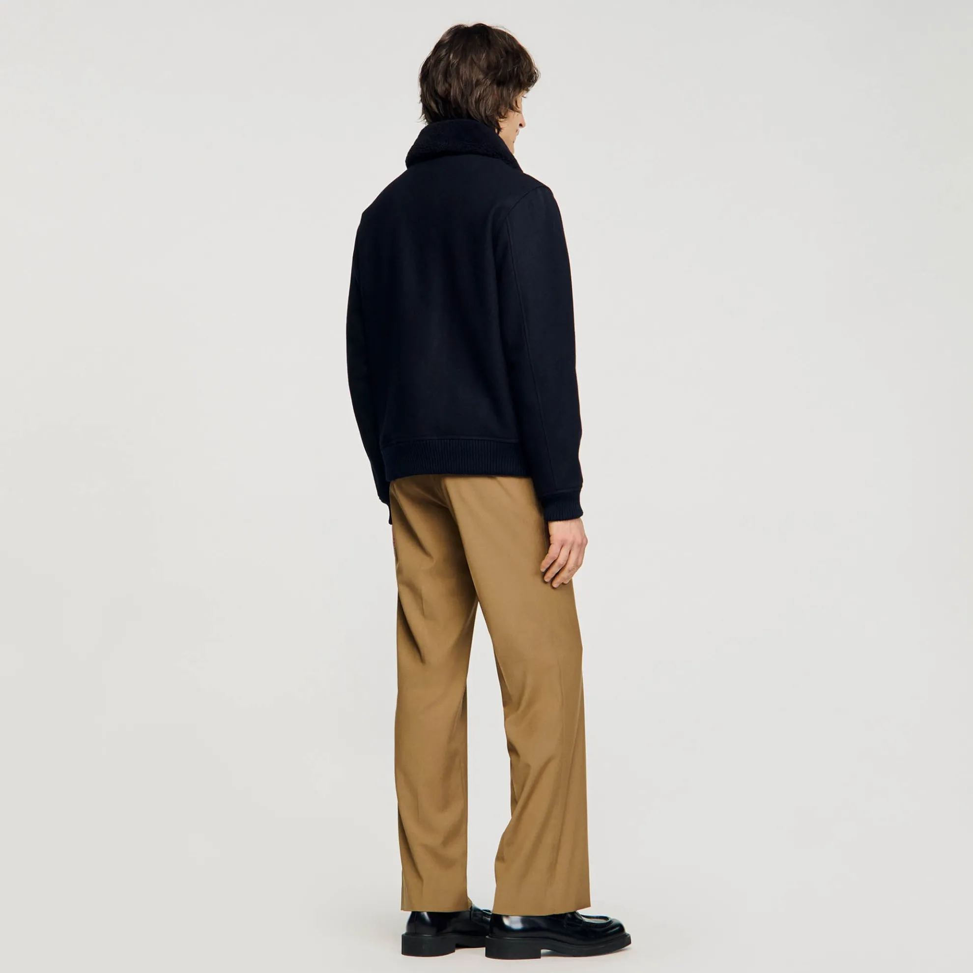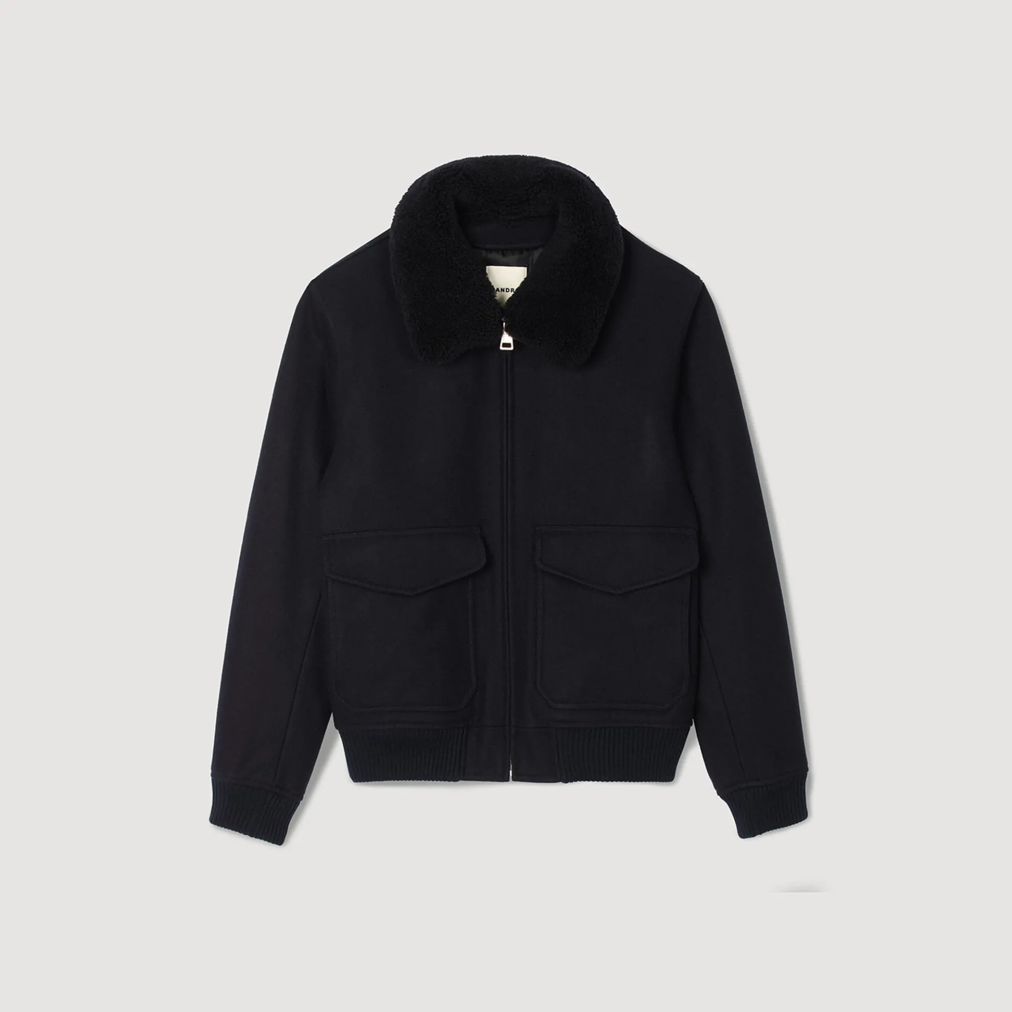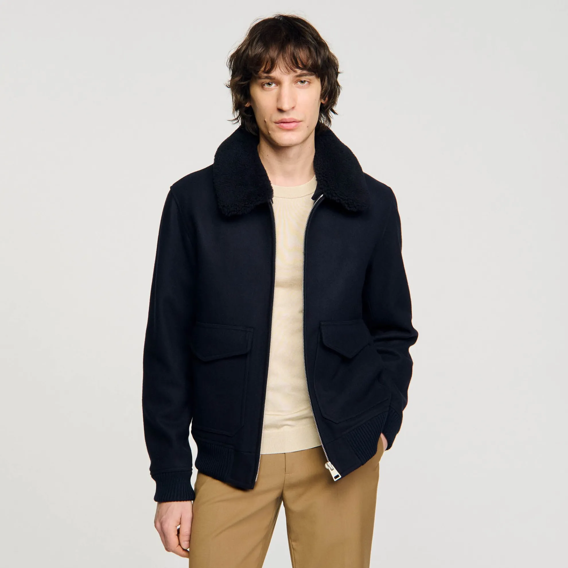 Aviator pilotenjack met Italiaanse wol, ritssluiting, een afneembare ton-sur-ton kraag van schapenvacht, lange mouwen en klepzakken.