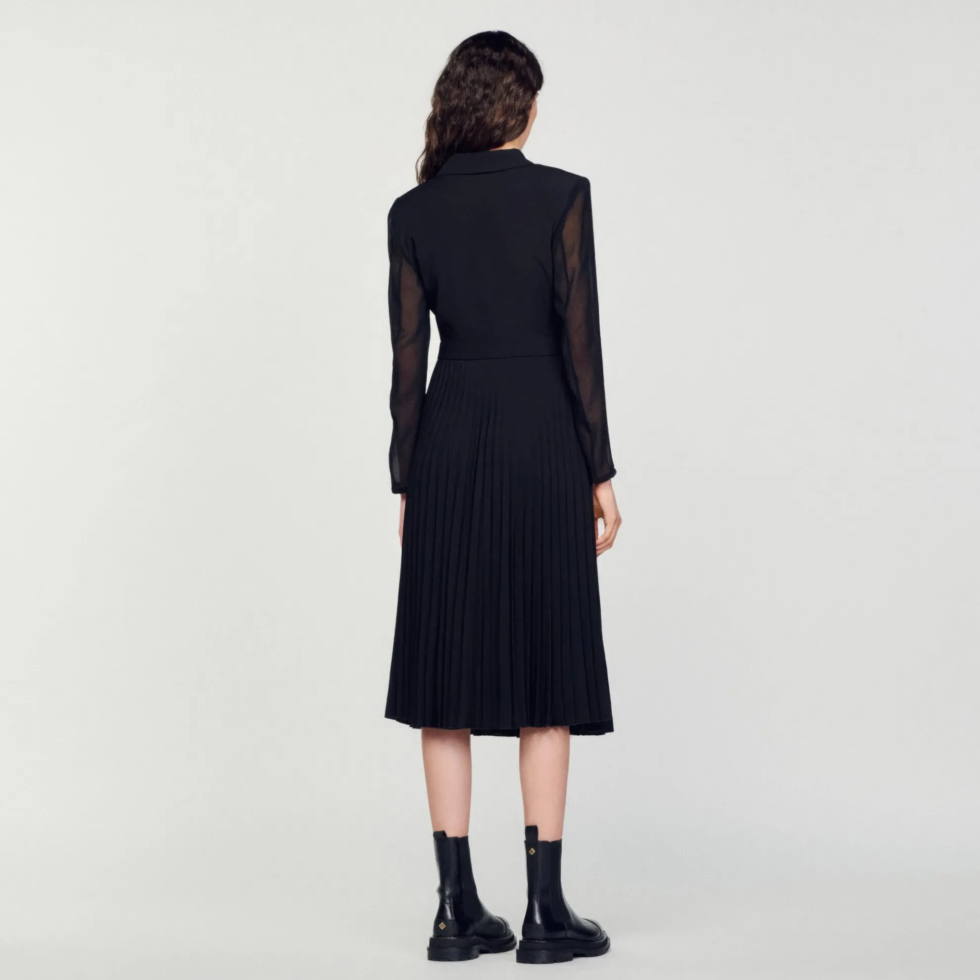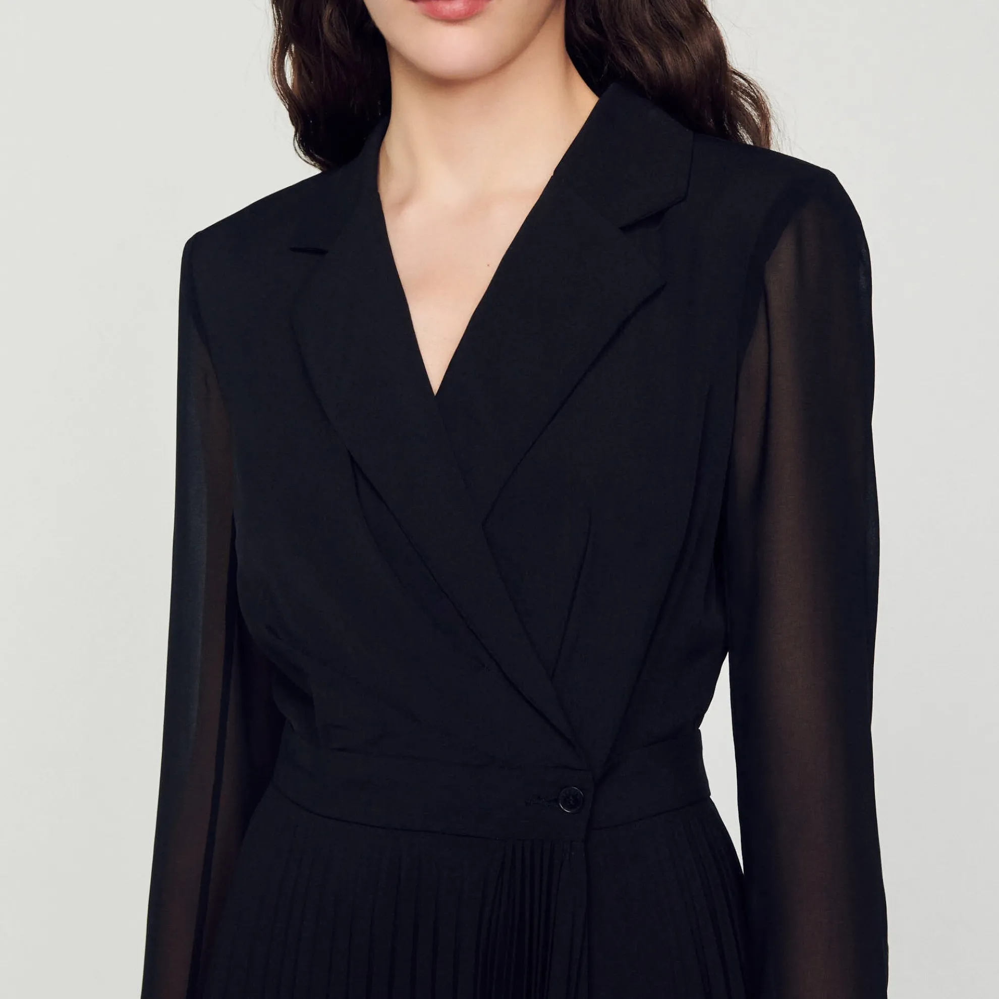 Damesjurk Sandro • Gekruiste reverskraag met knoop • Doorschijnende lange mouwen • Asymmetrische plooirok