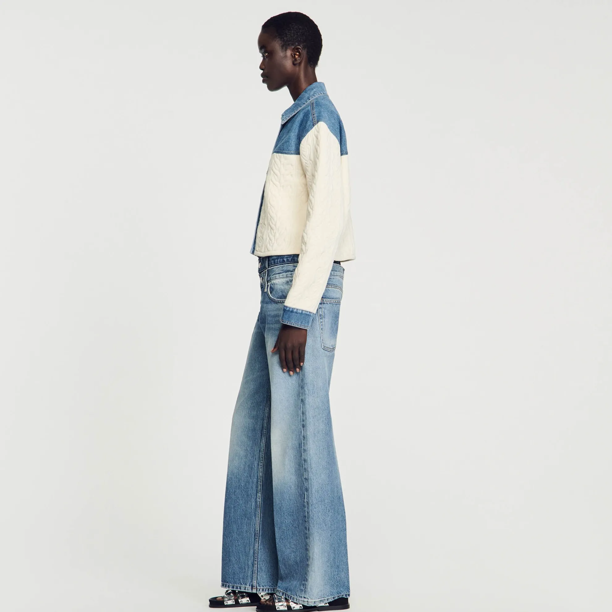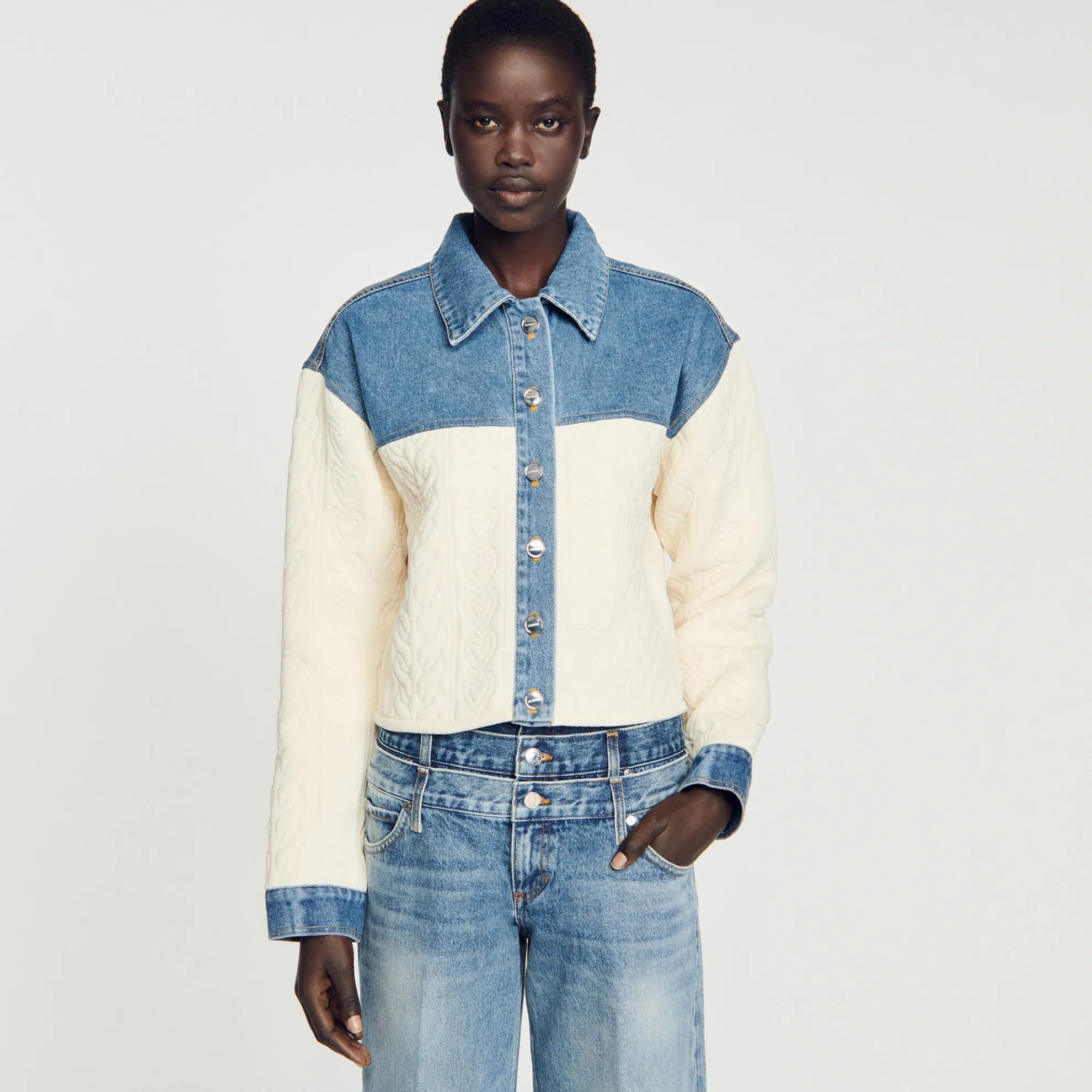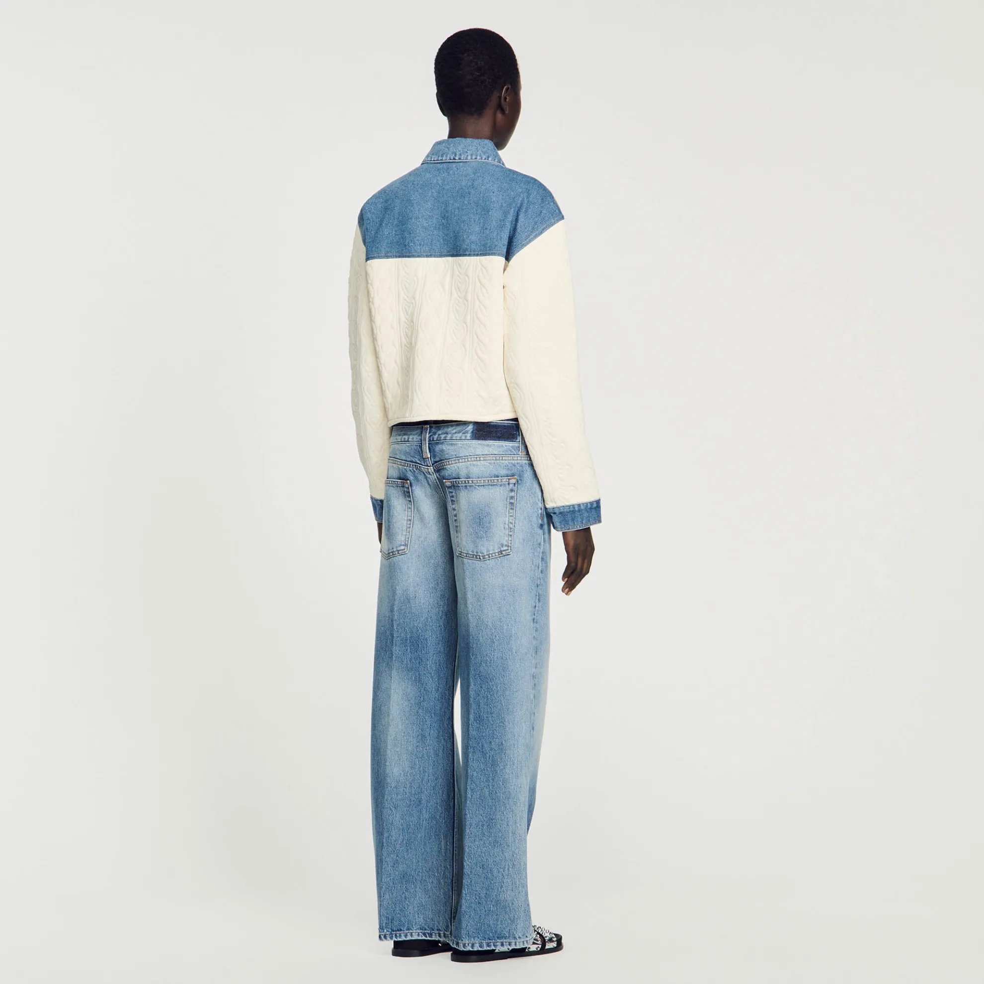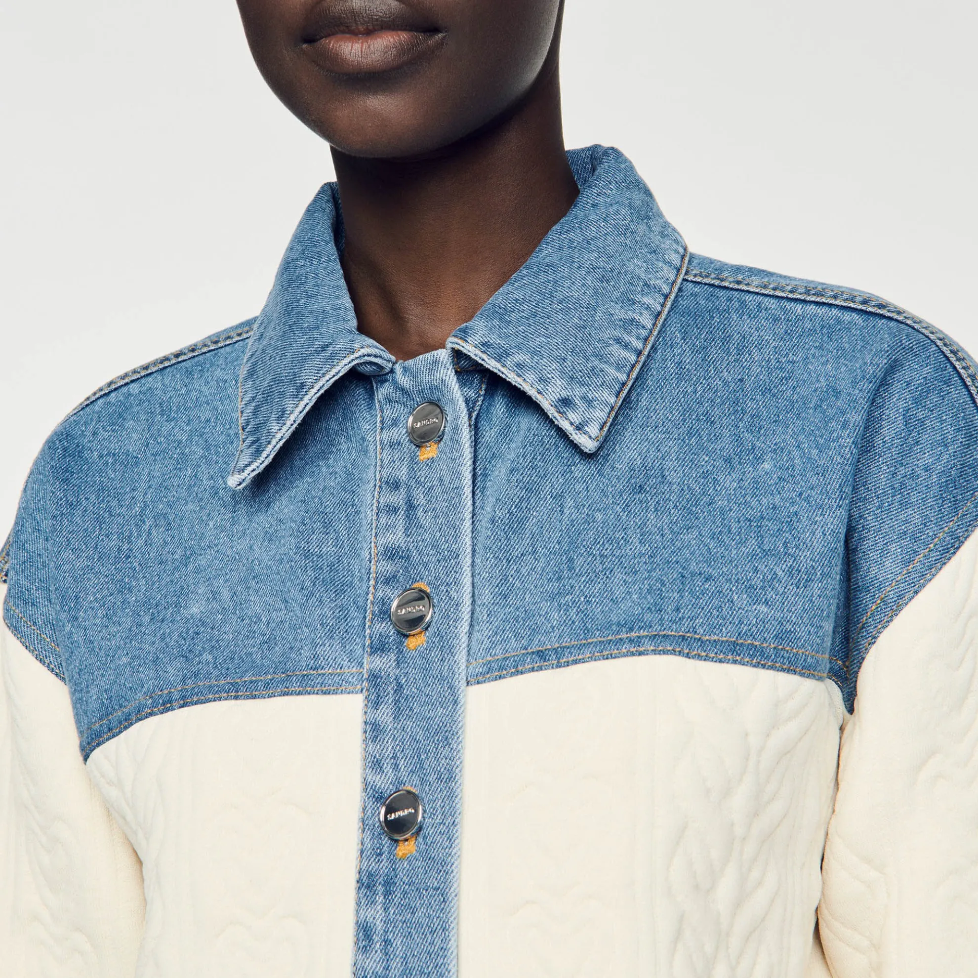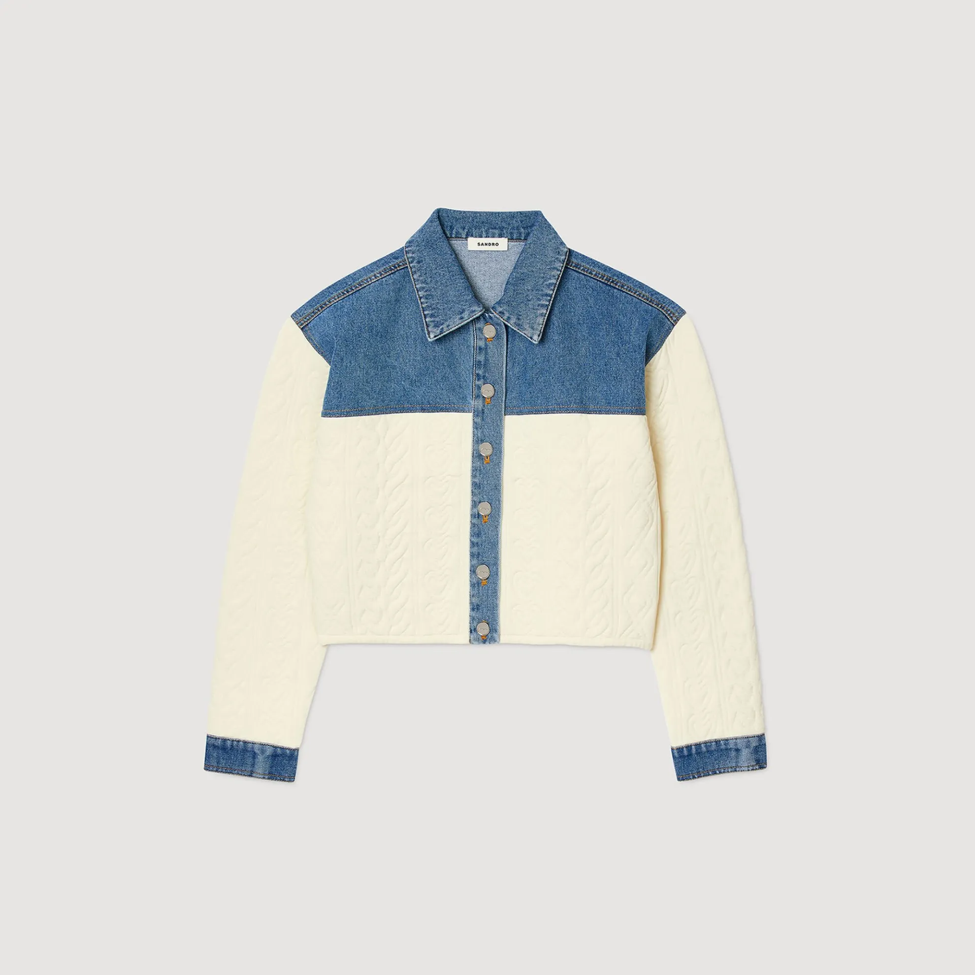 Korte cardicoat van twee stoffen met denim en doorgestikte gebreide inzetstukken met motieven van hartjes, overhemdkraag, lange mouwen en knoopsluiting.