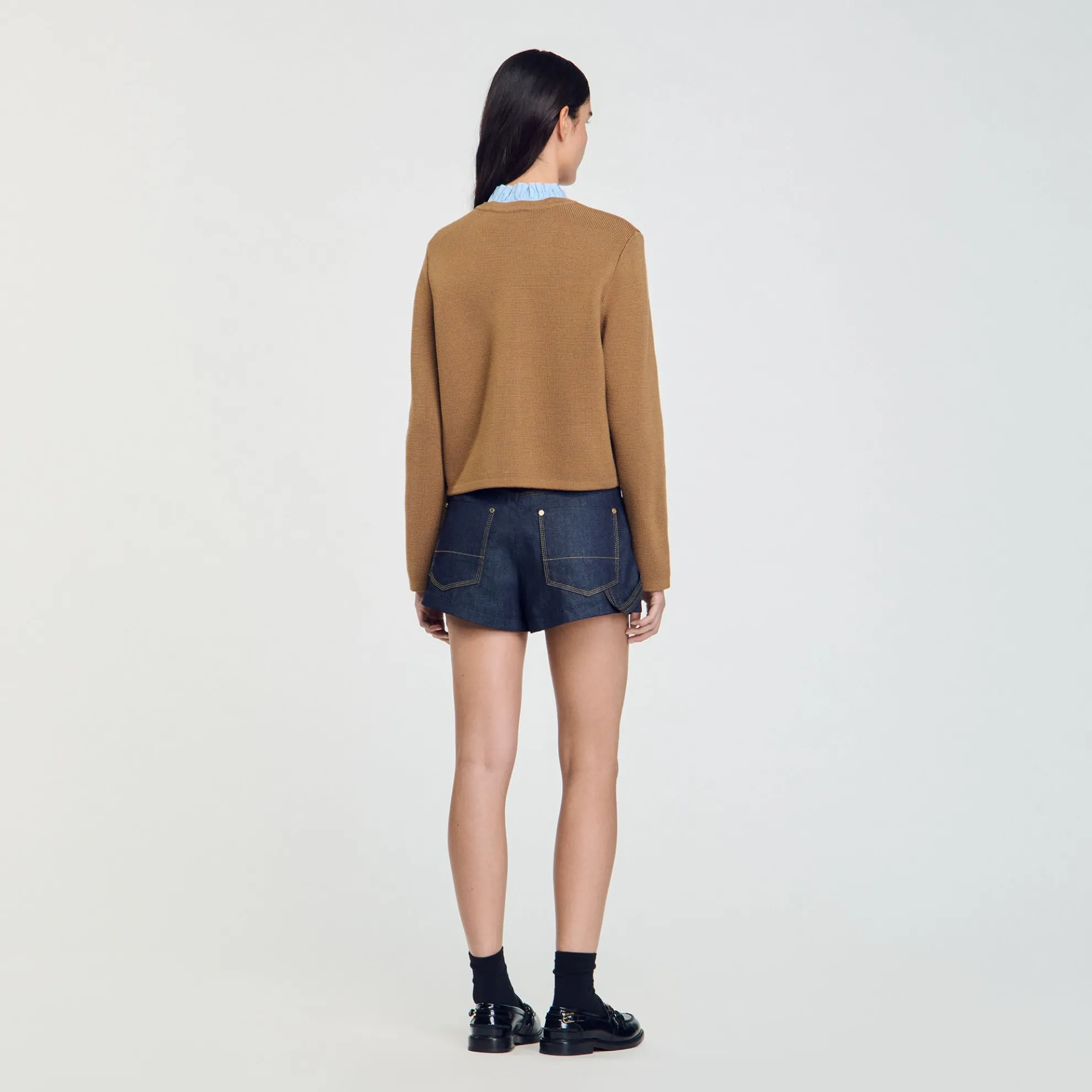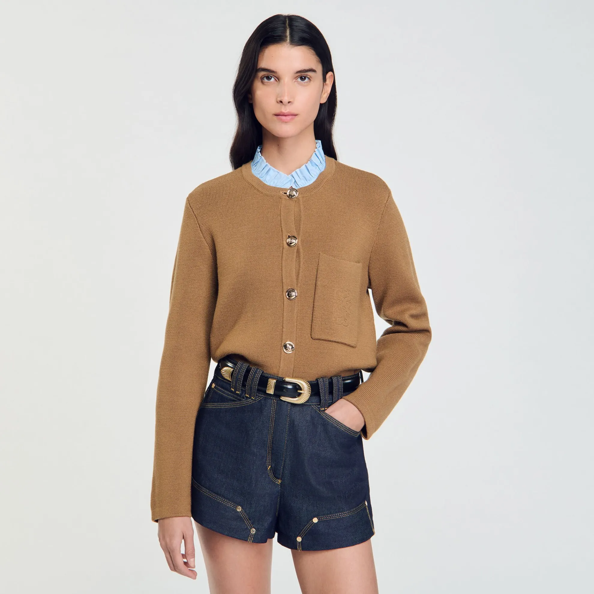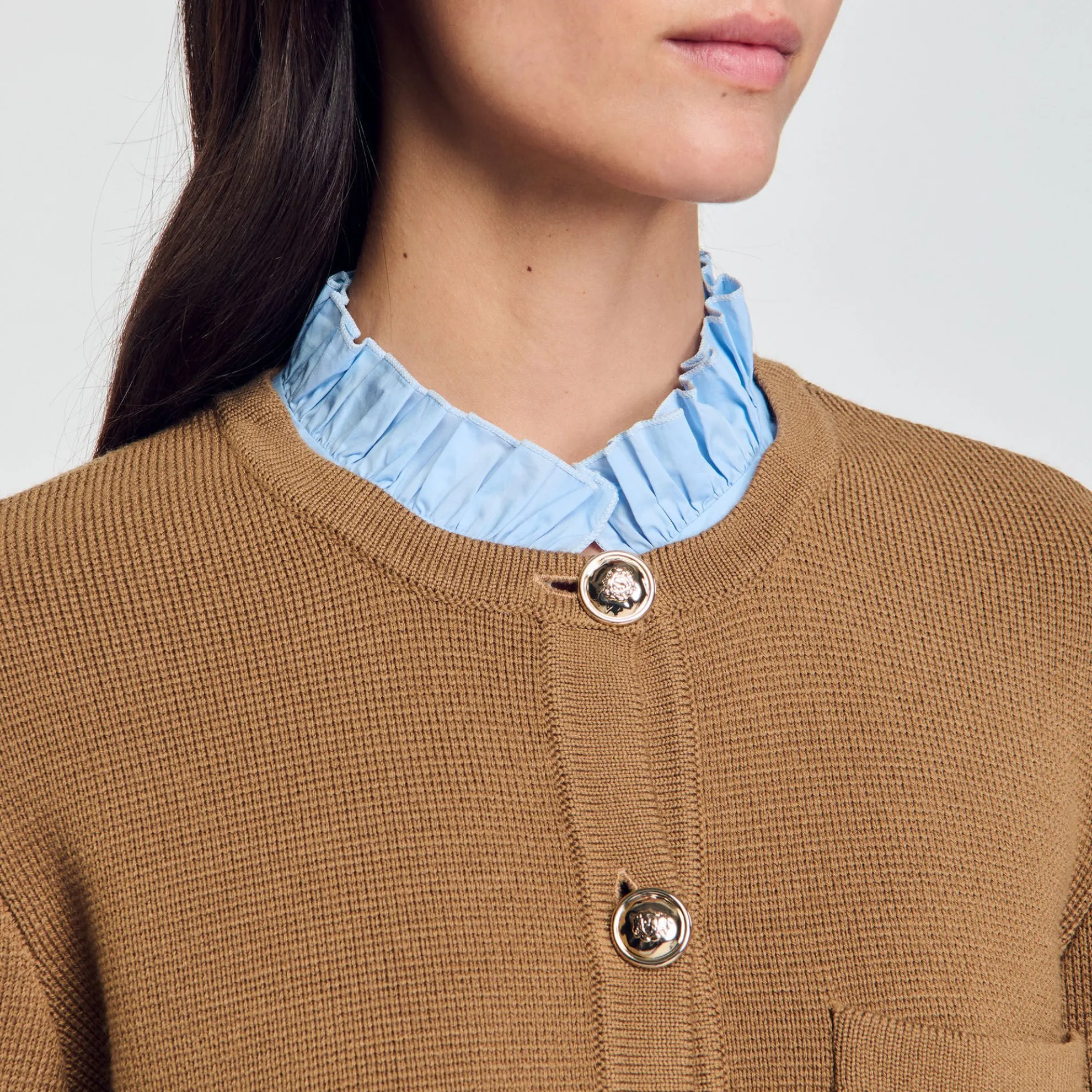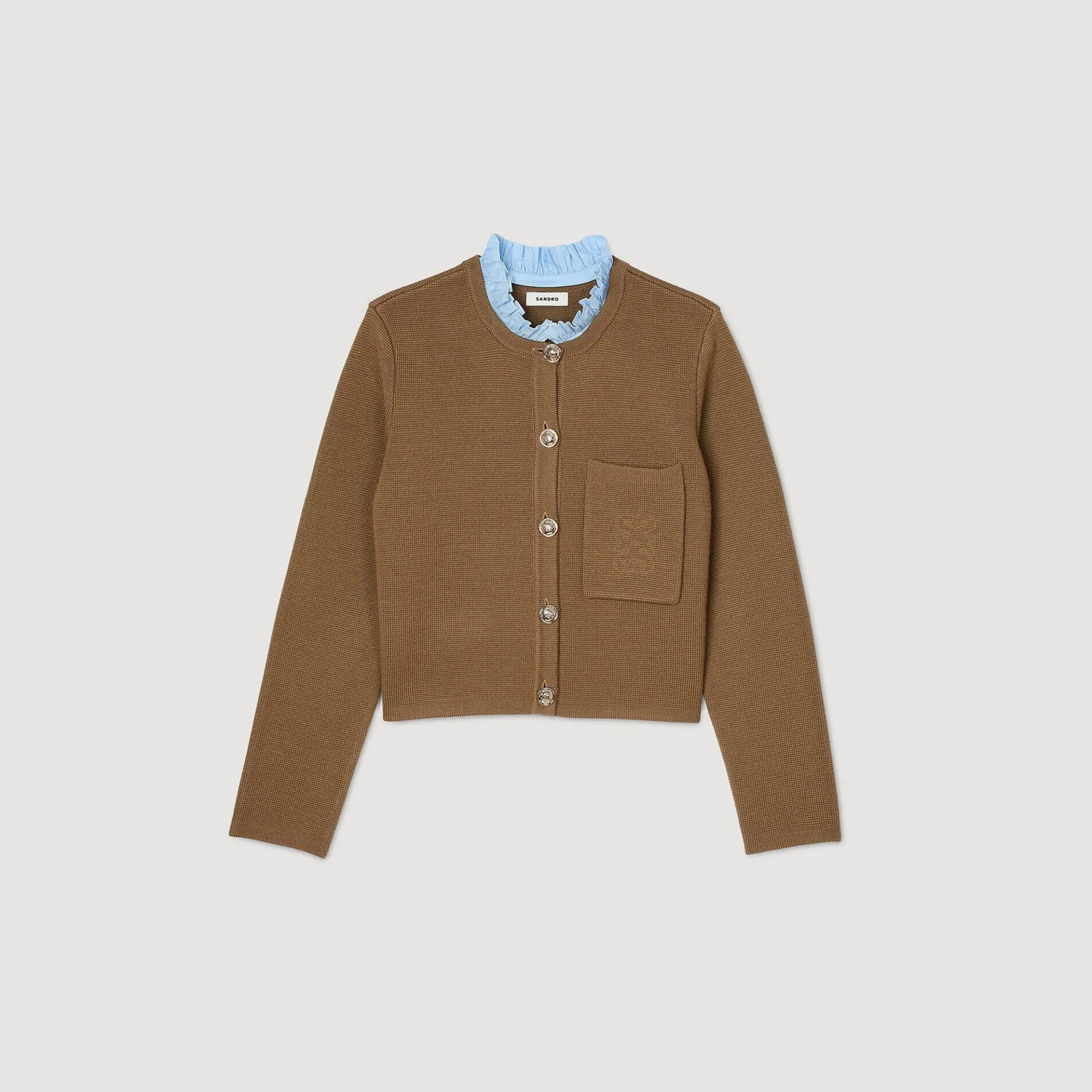 Cardigan met siersteek, hoge contrasterende kraag met ruches, lange mouwen, een opgestikte zak op de borst en een sluiting met vergulde knopen.