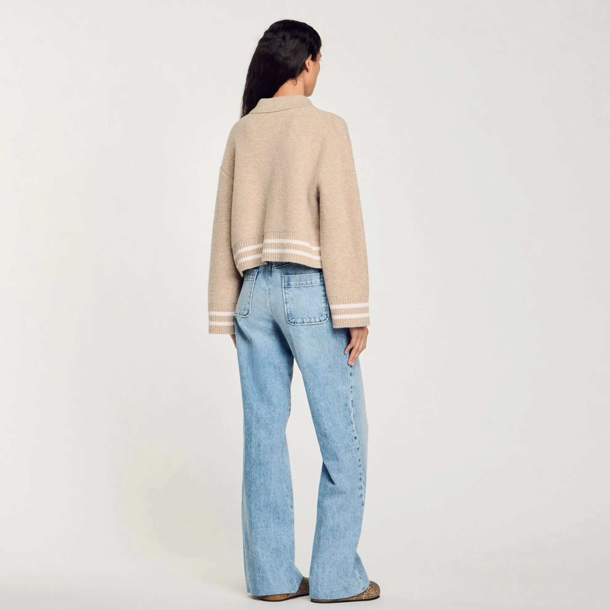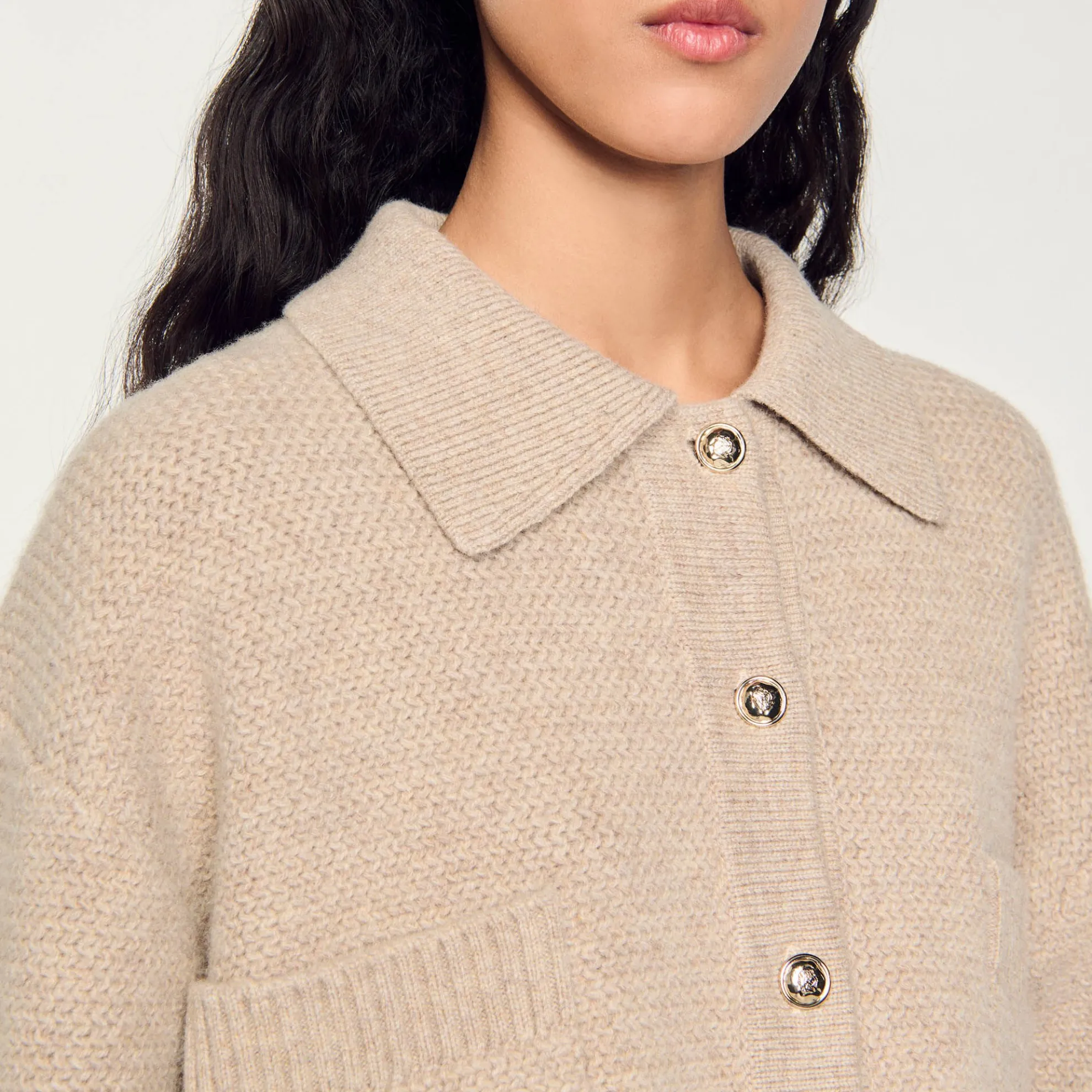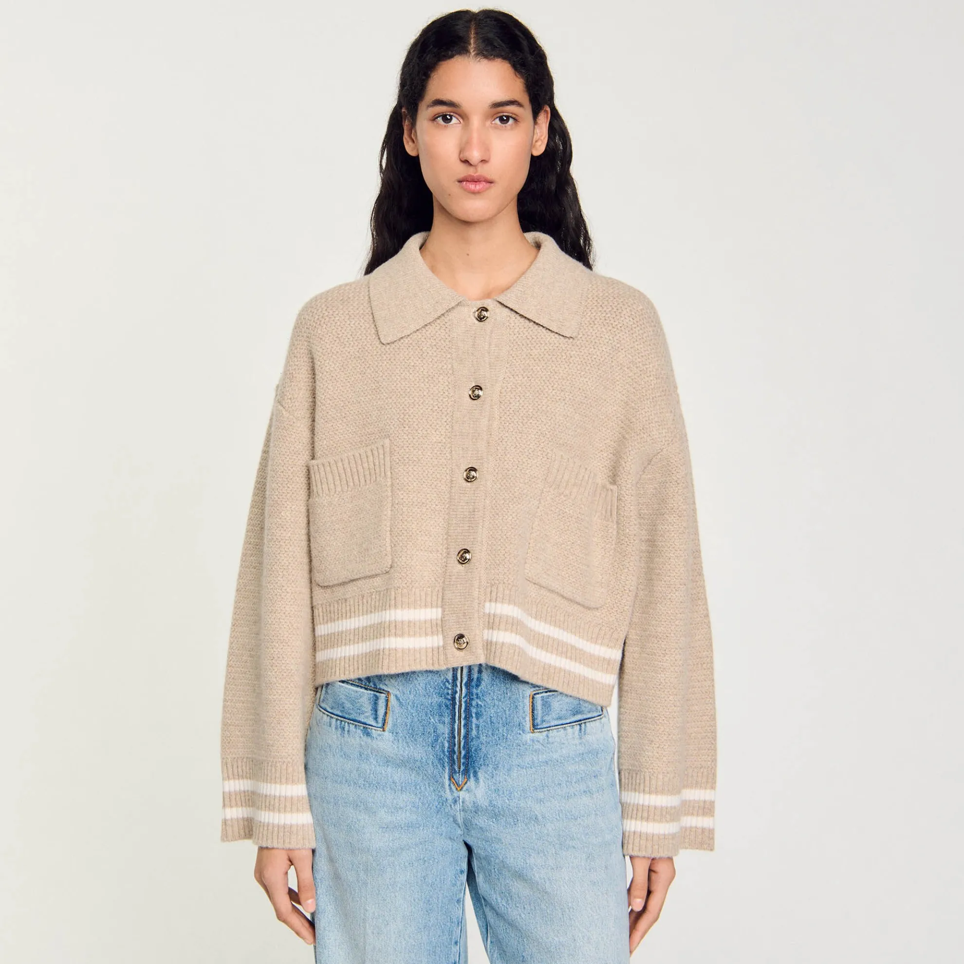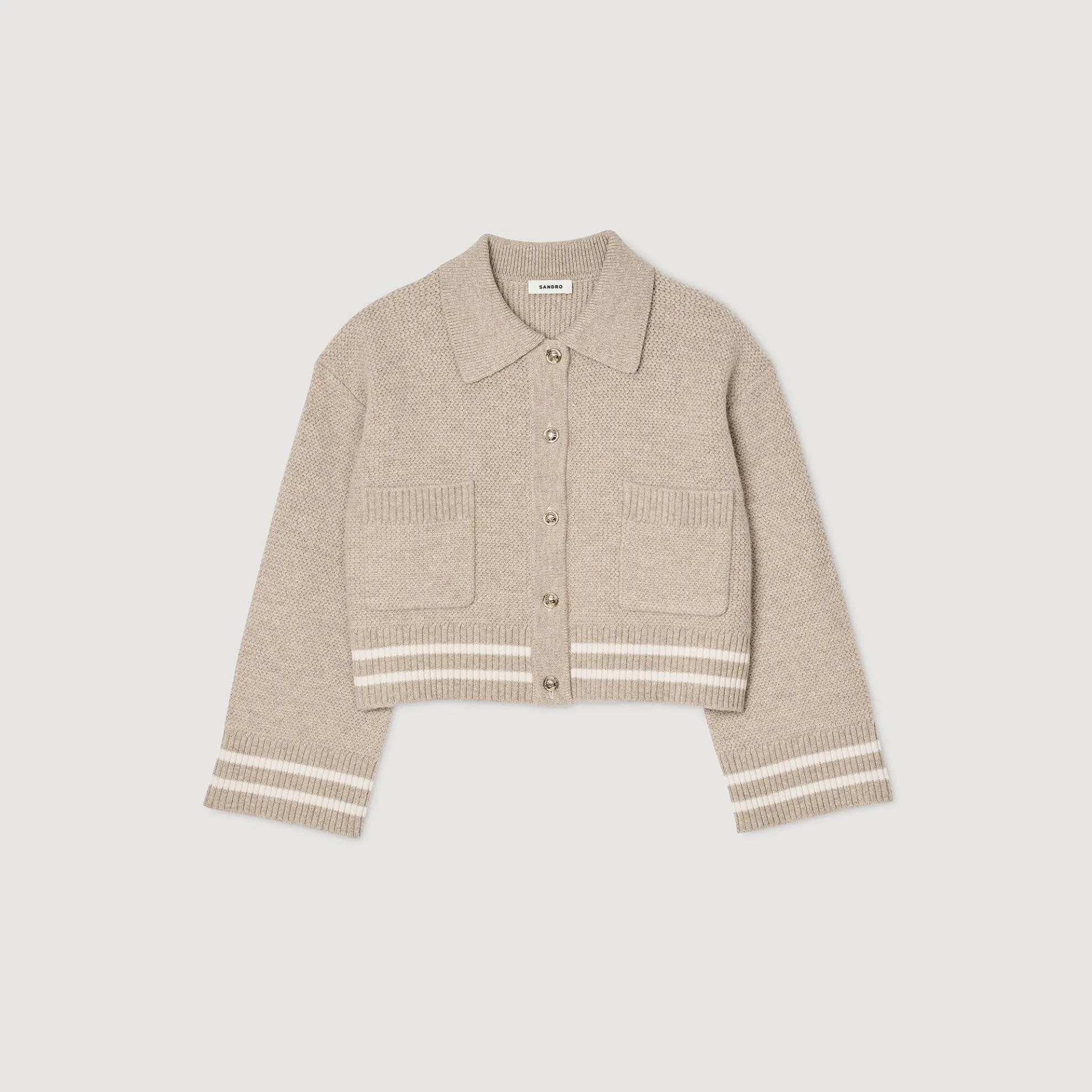 Kort ruim vest van dik tricot met siersteek met een overhemdkraag, lange mouwen, een vergulde knoopsluiting, opgestikte zakken en contrasterende biezen.