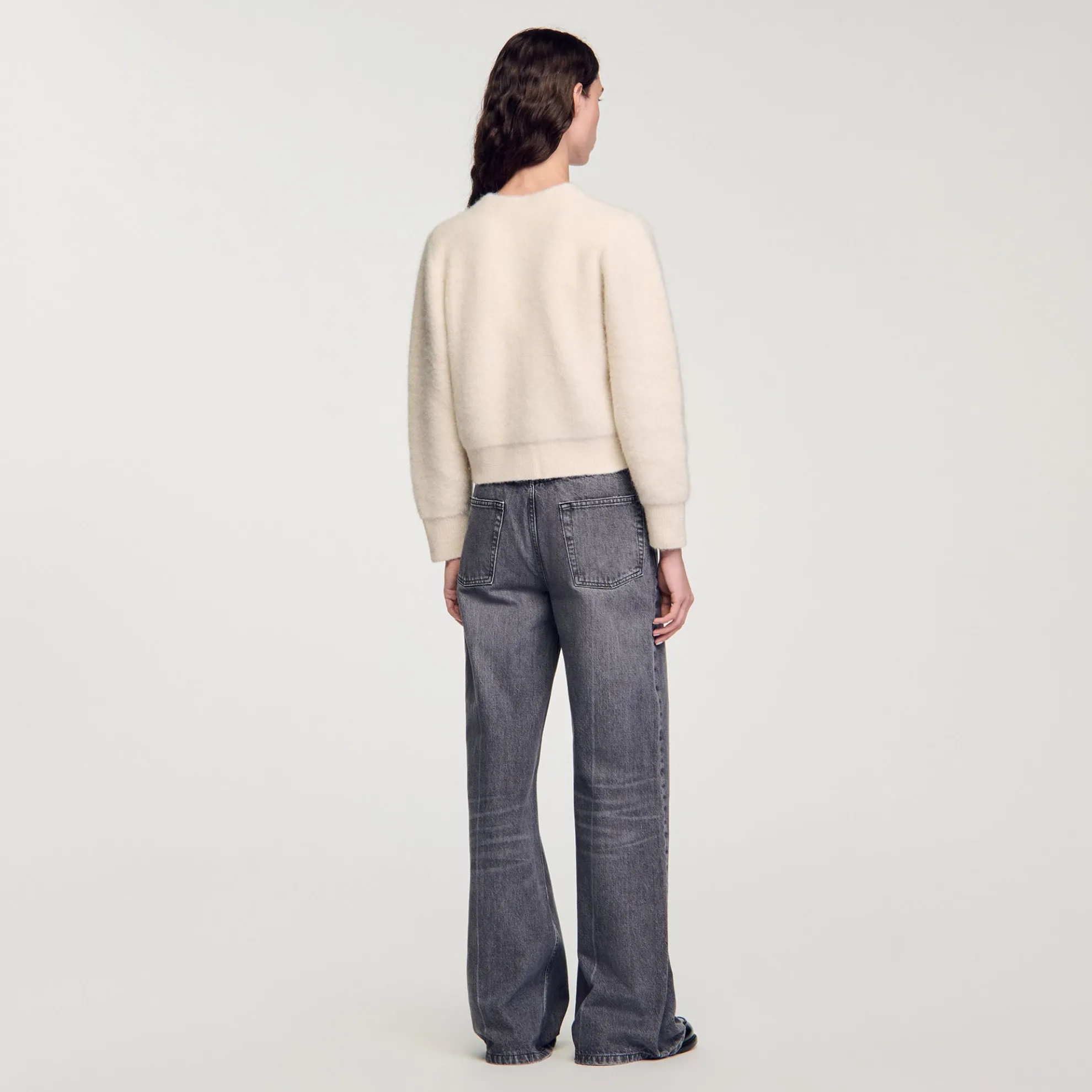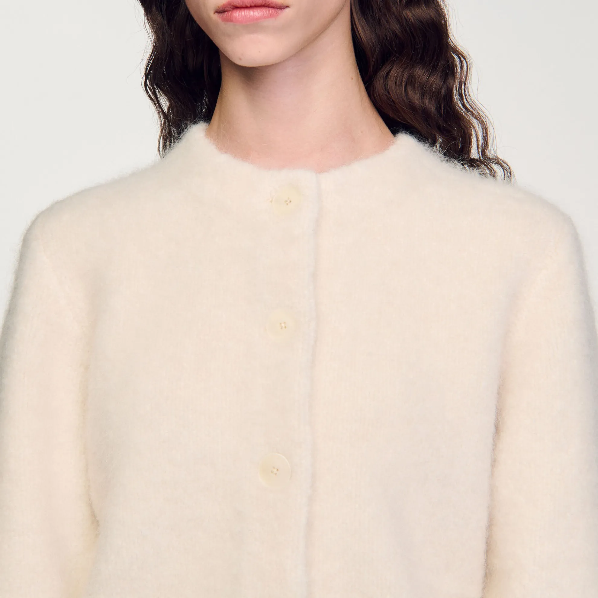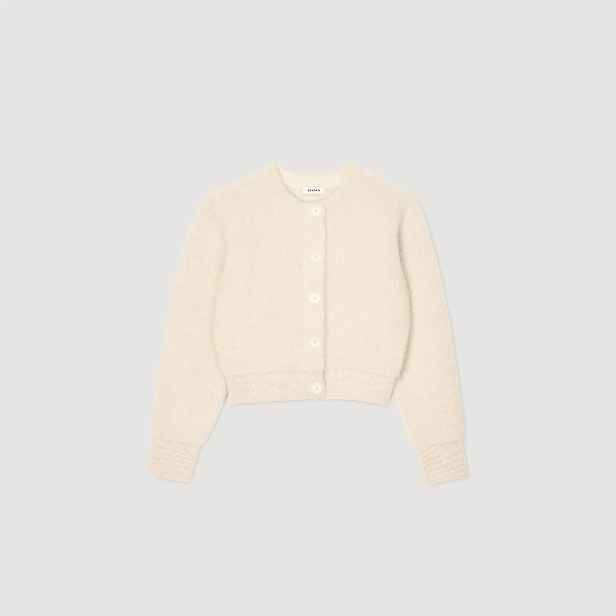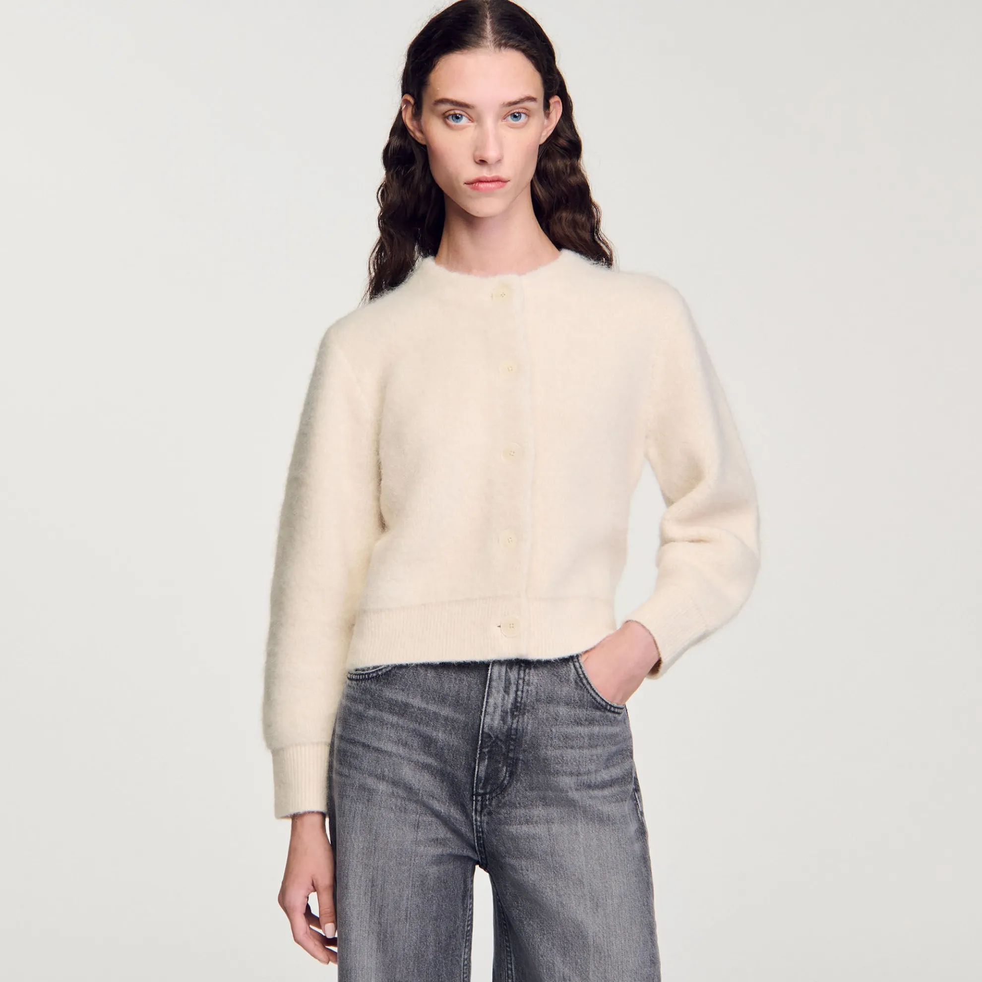 Donzig gebreid kort cardigan vest met ronde hals, lange mouwen, knoopsluiting en geribde boorden.