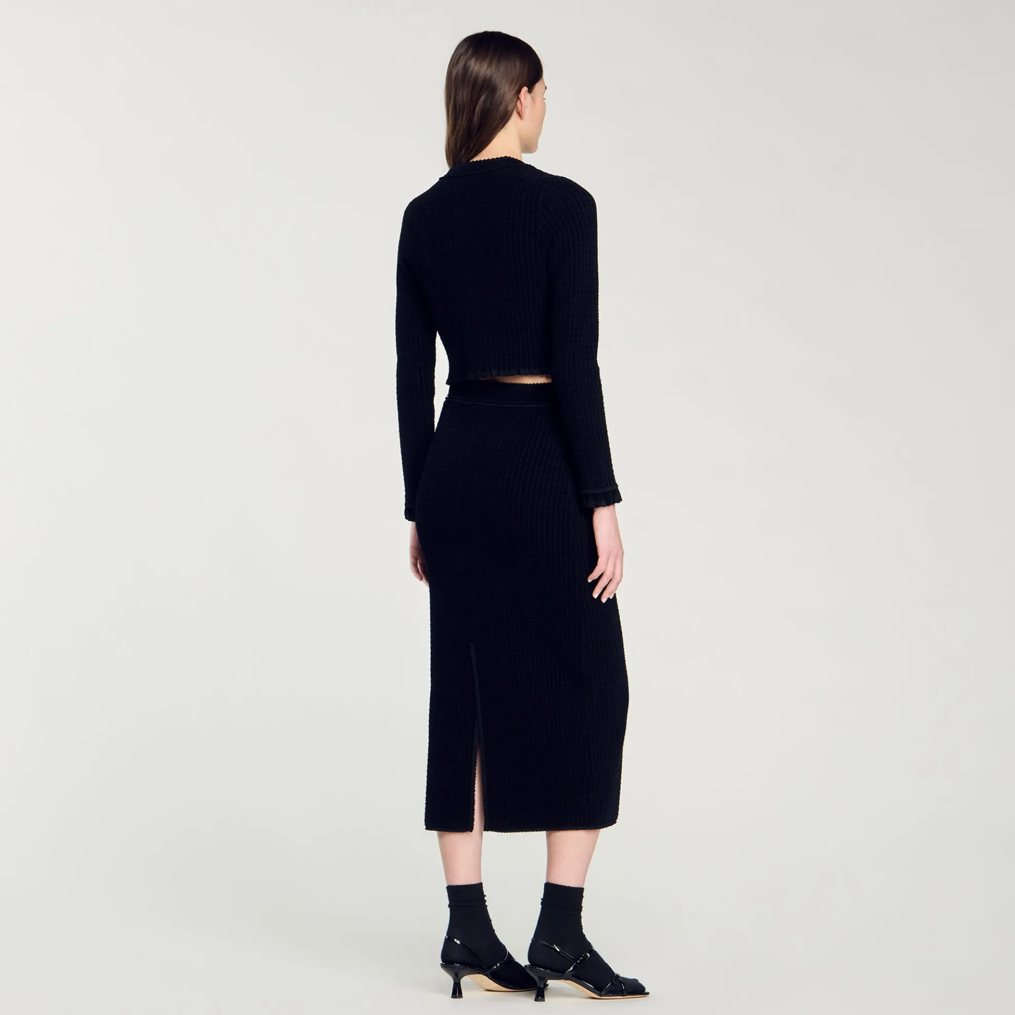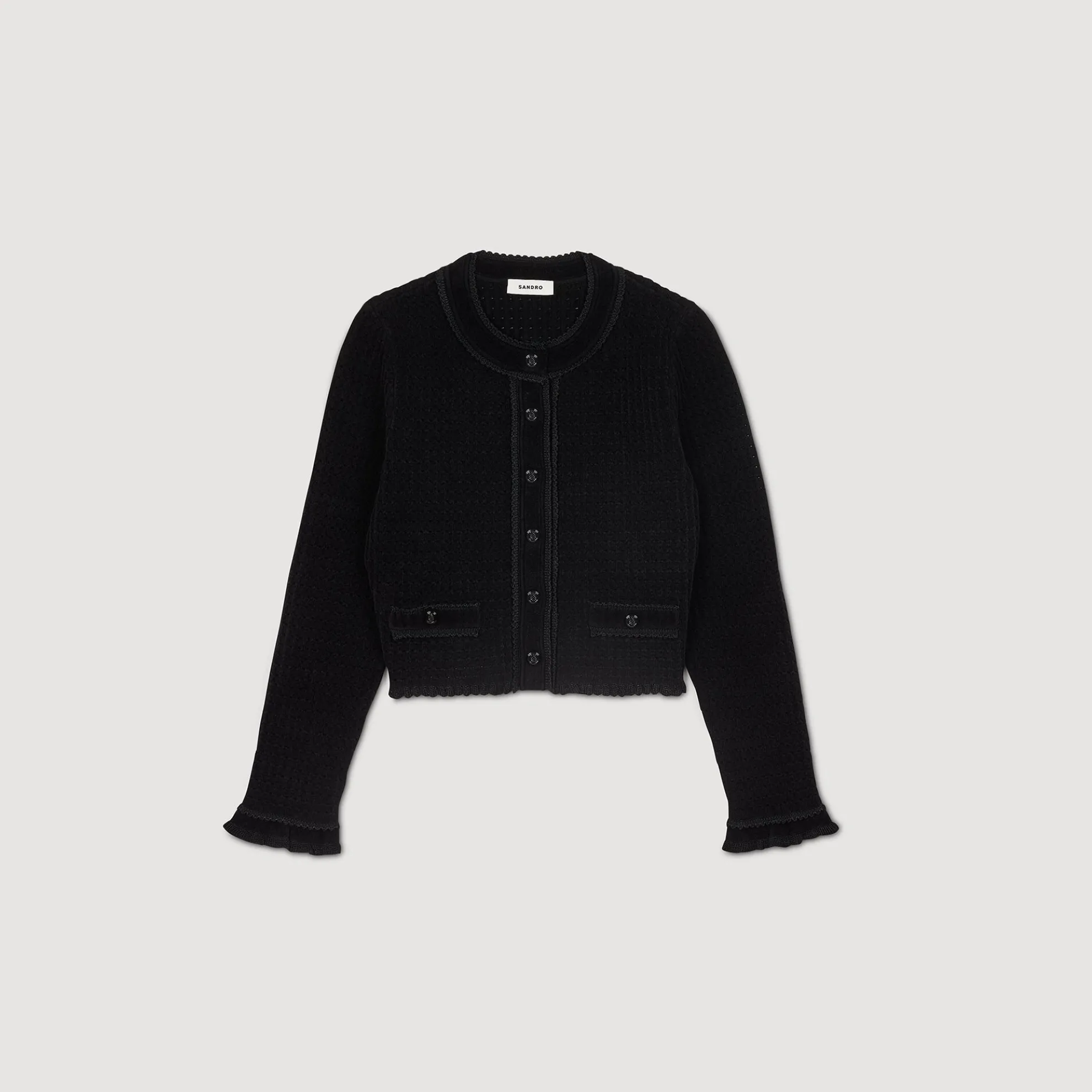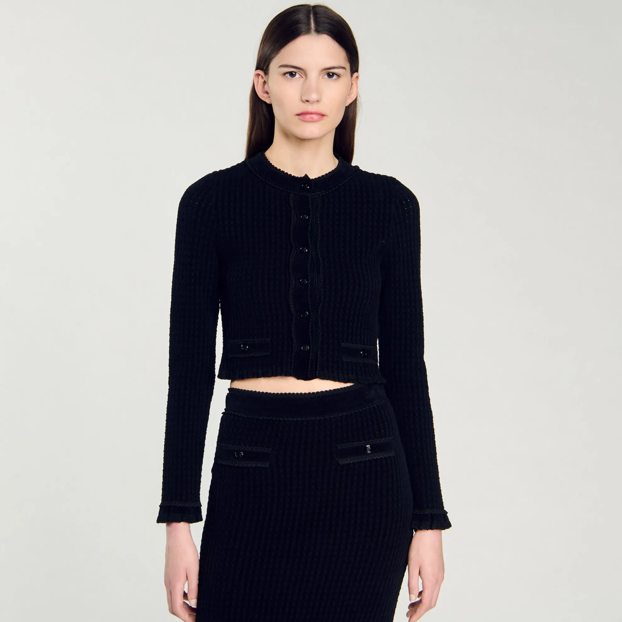 Kort gebreid cardigan vest met velours en pointillé effect, ronde hals, lange mouwen, knoopsluiting en sier-paspelzakken.