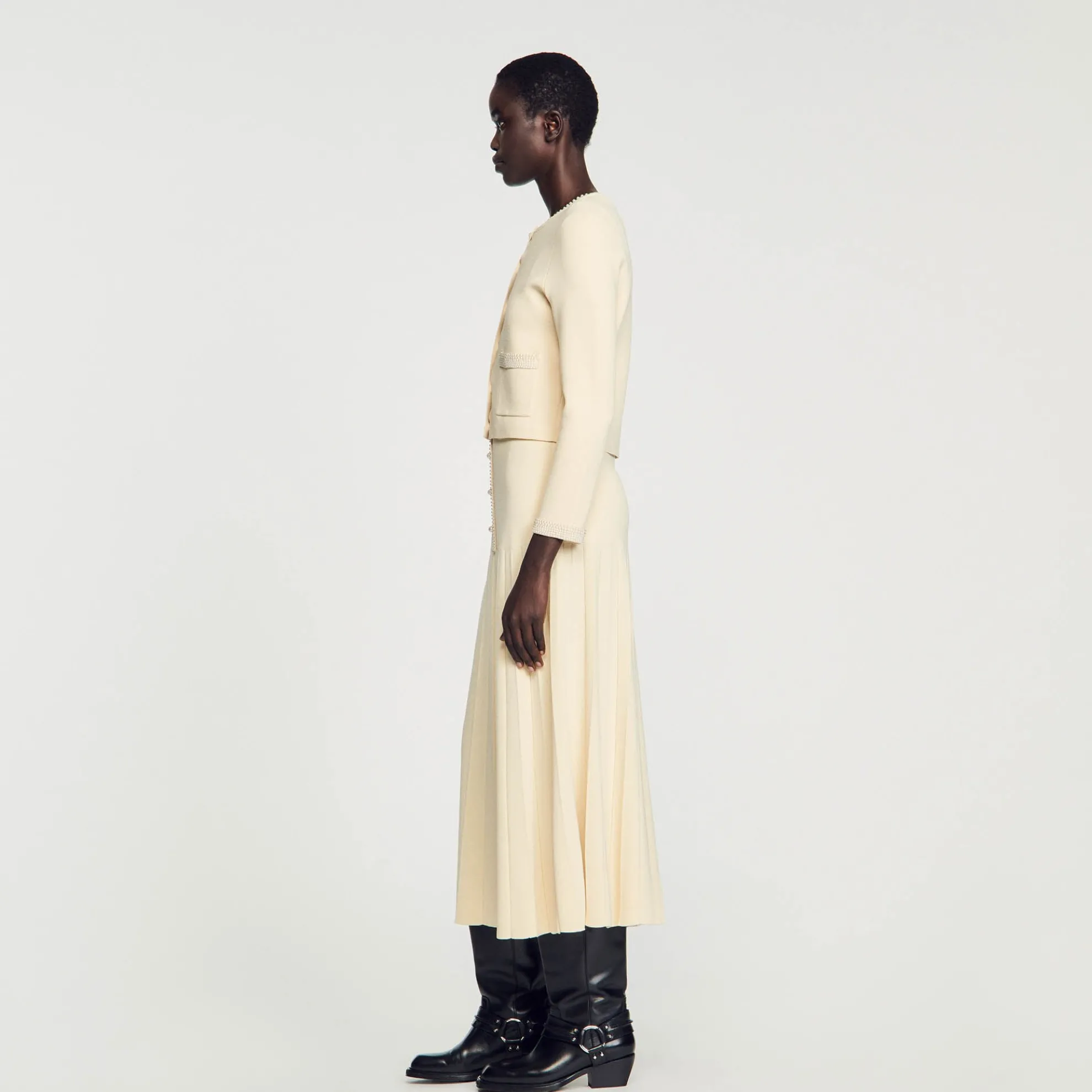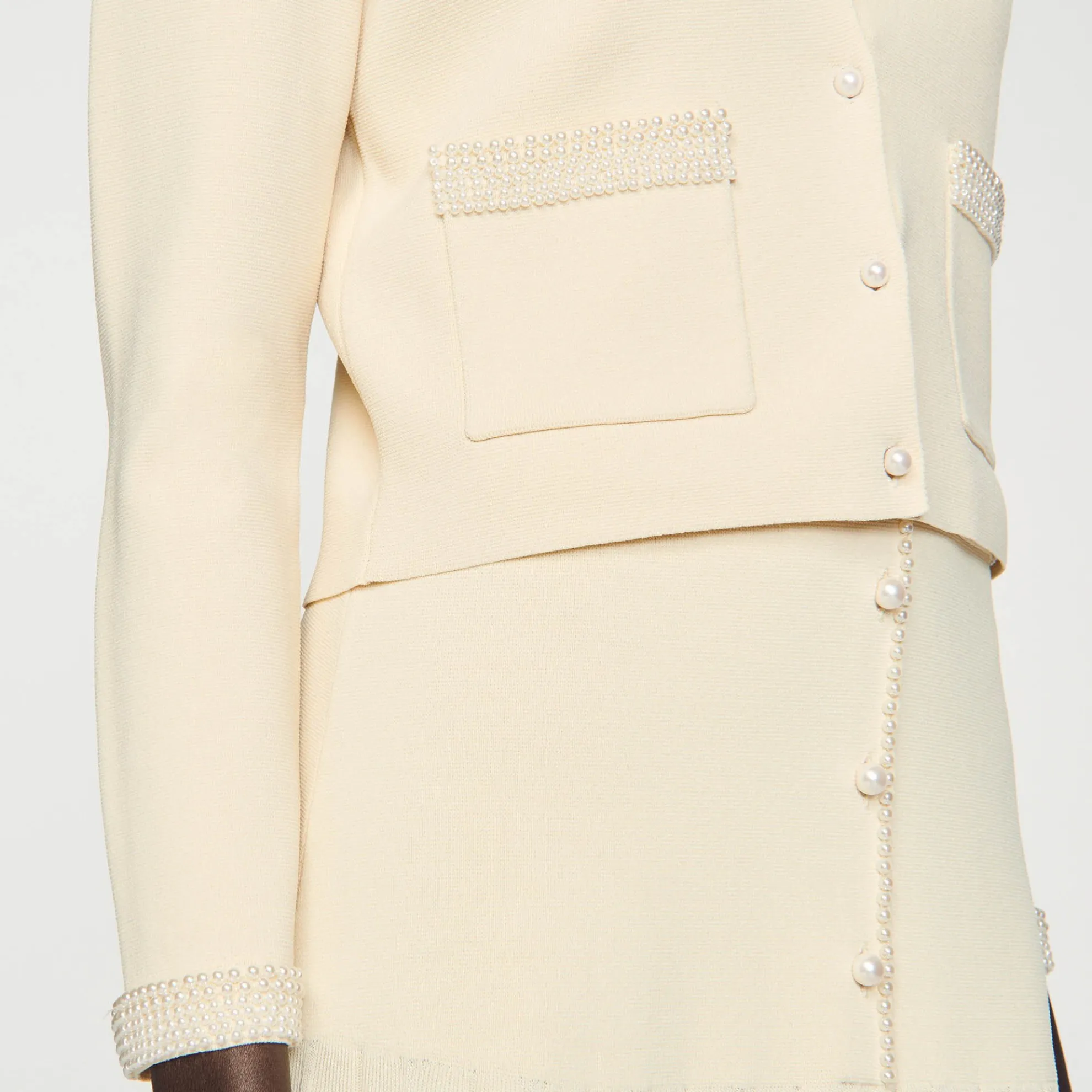 Gebreid cardigan vest met lange mouwen, ronde hals met knoopsluiting met parels en parelmoeren details op de manchetten en in de taille.