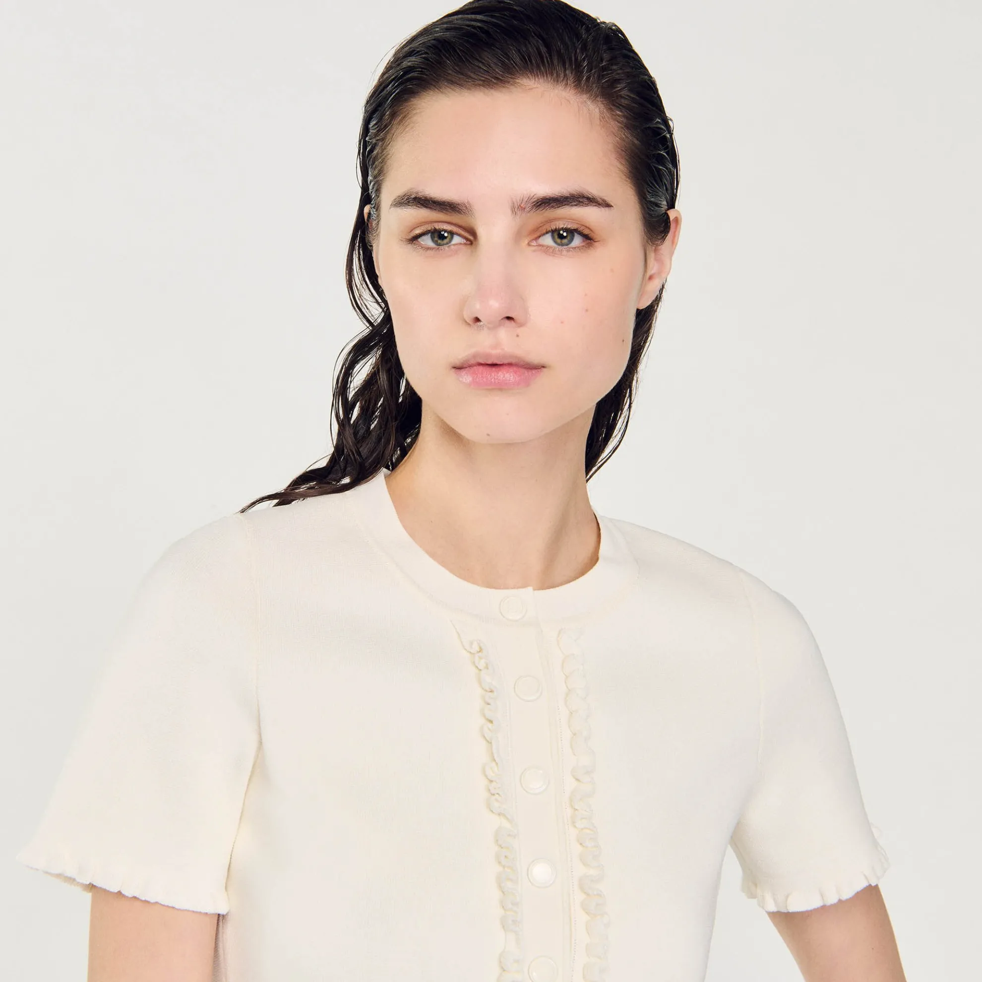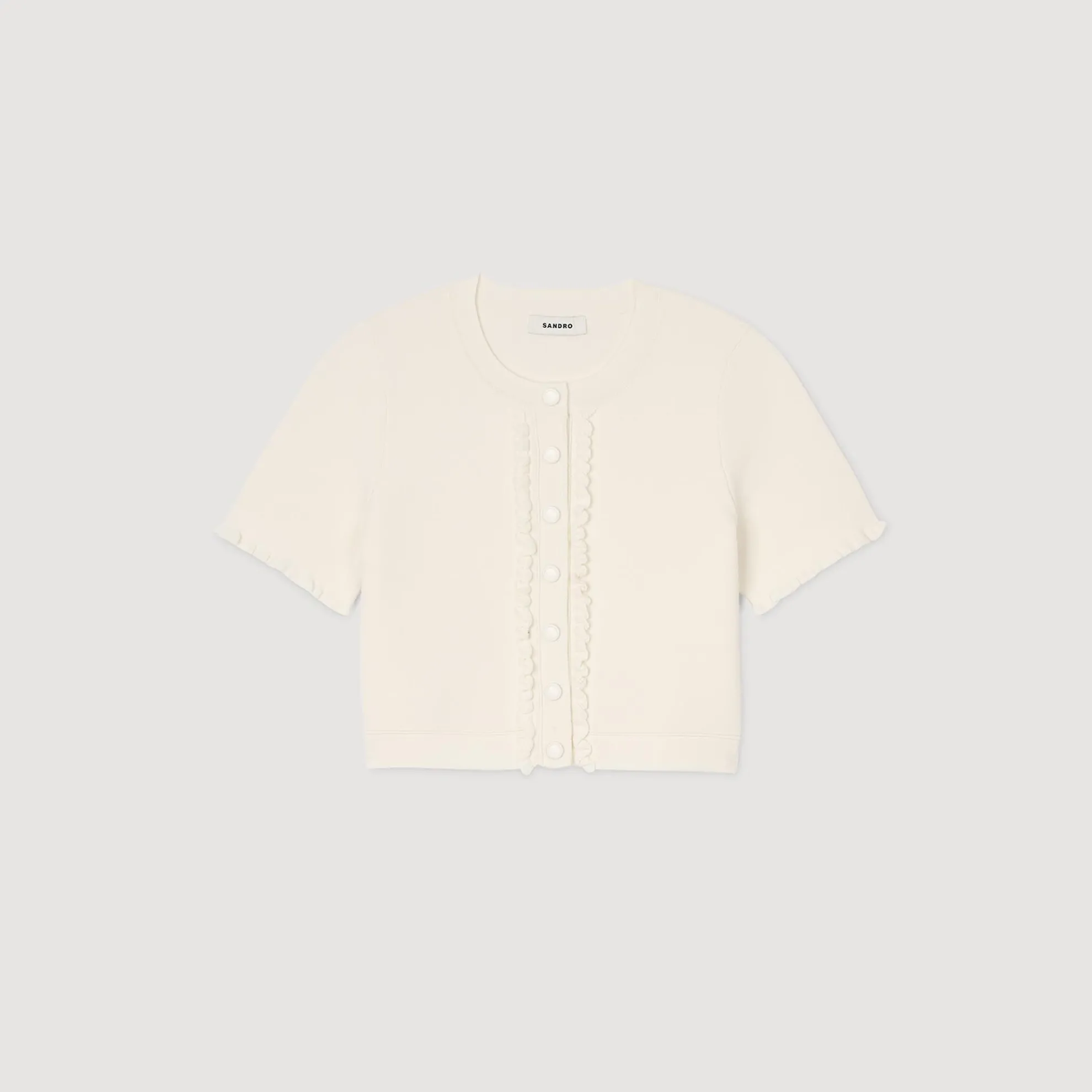 Fijn ribgebreid cardigan vest met korte mouwen, knoopsluiting met volants en een ronde hals.
