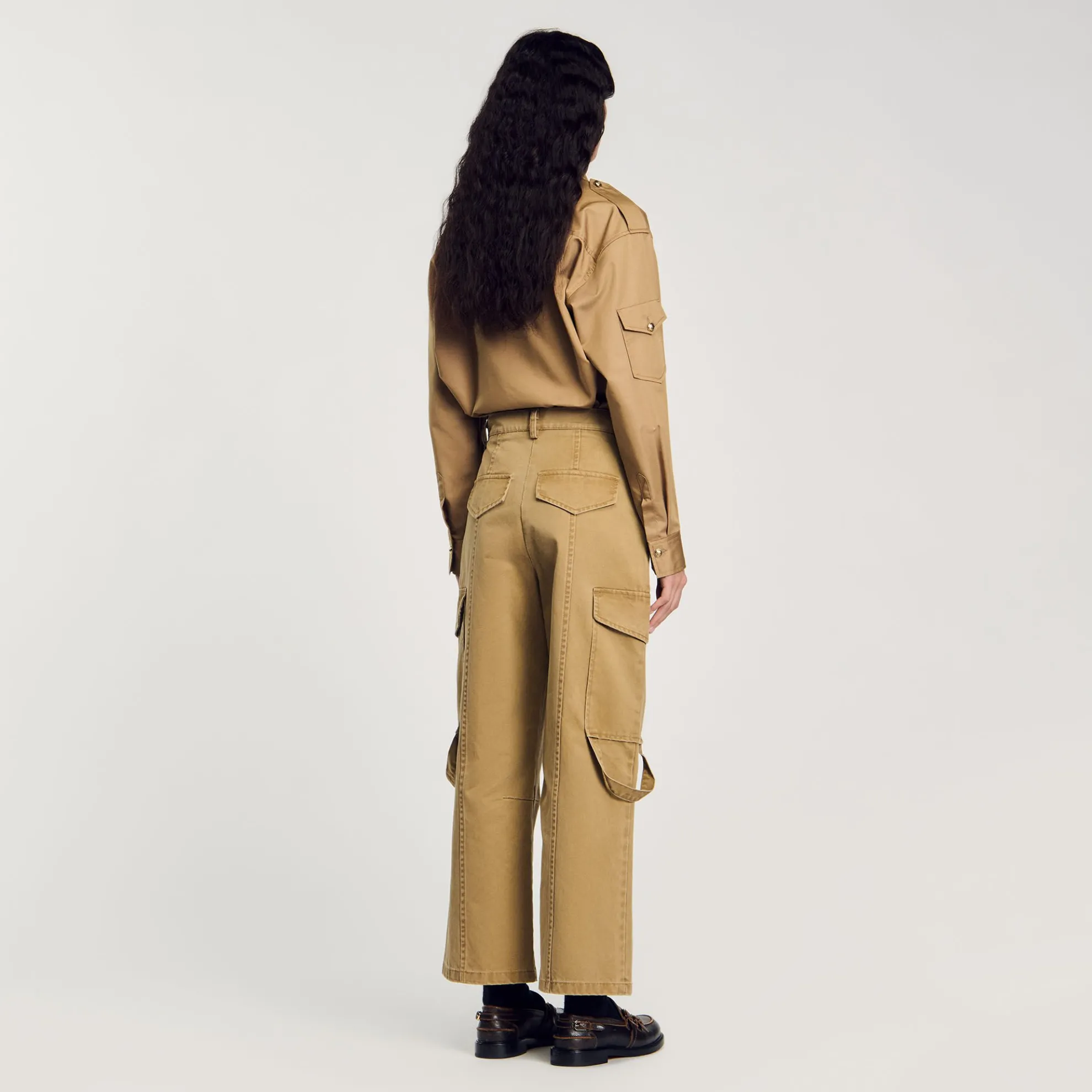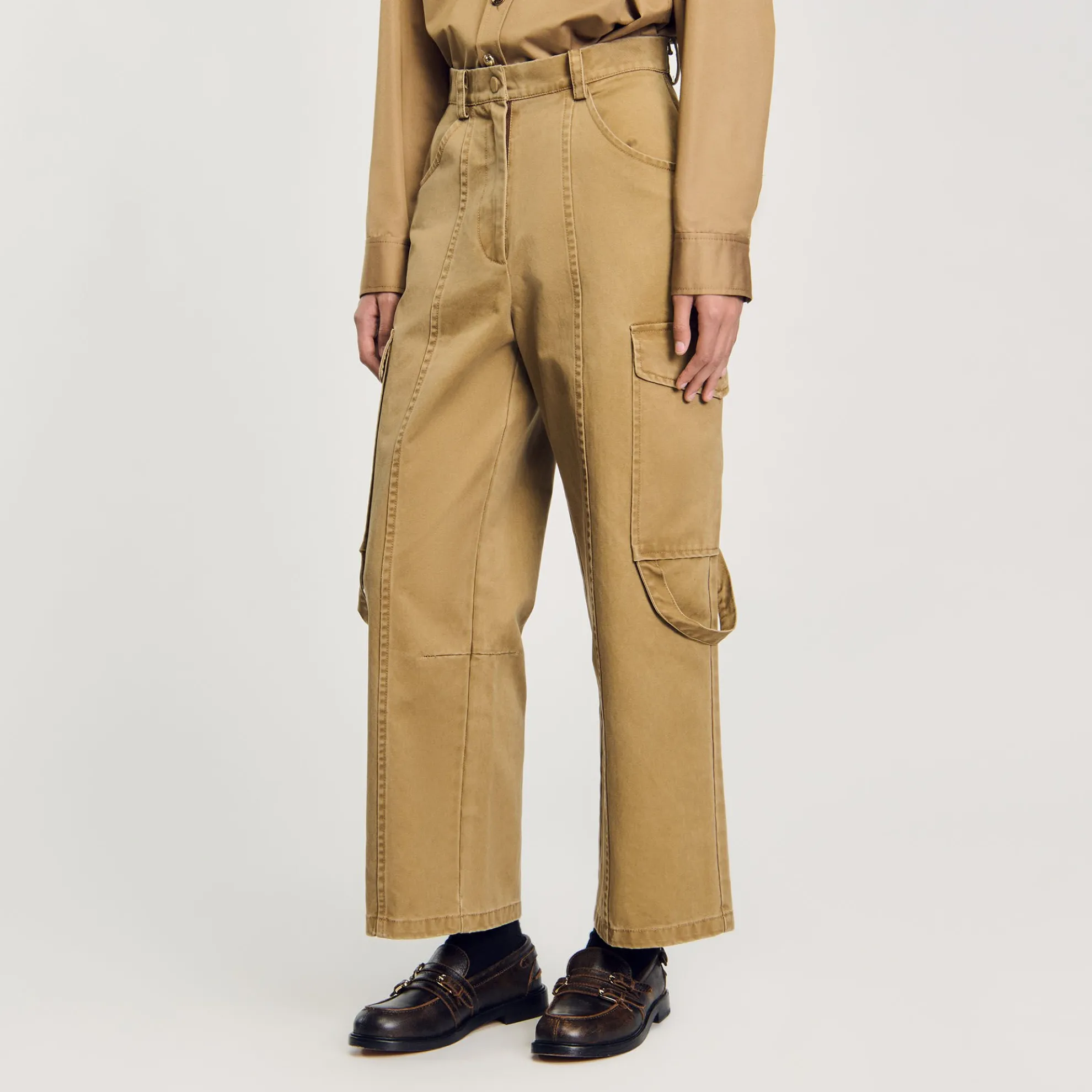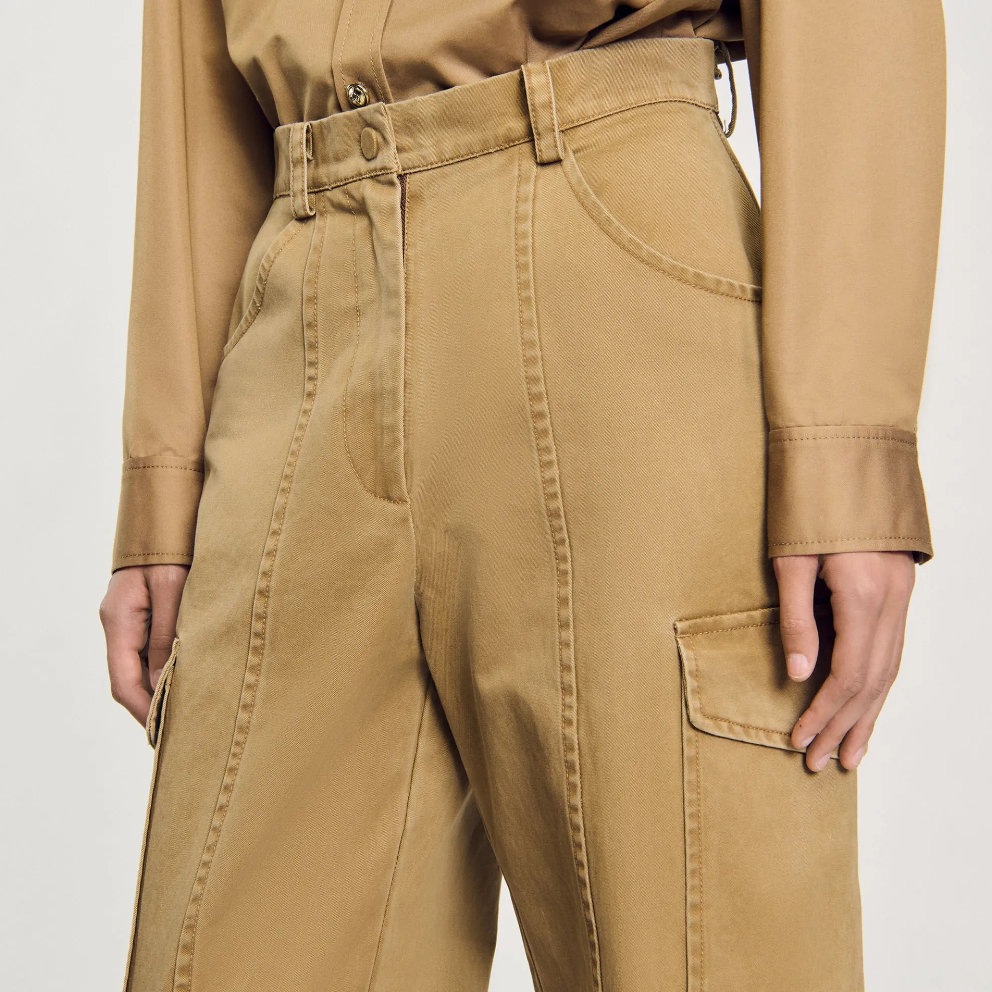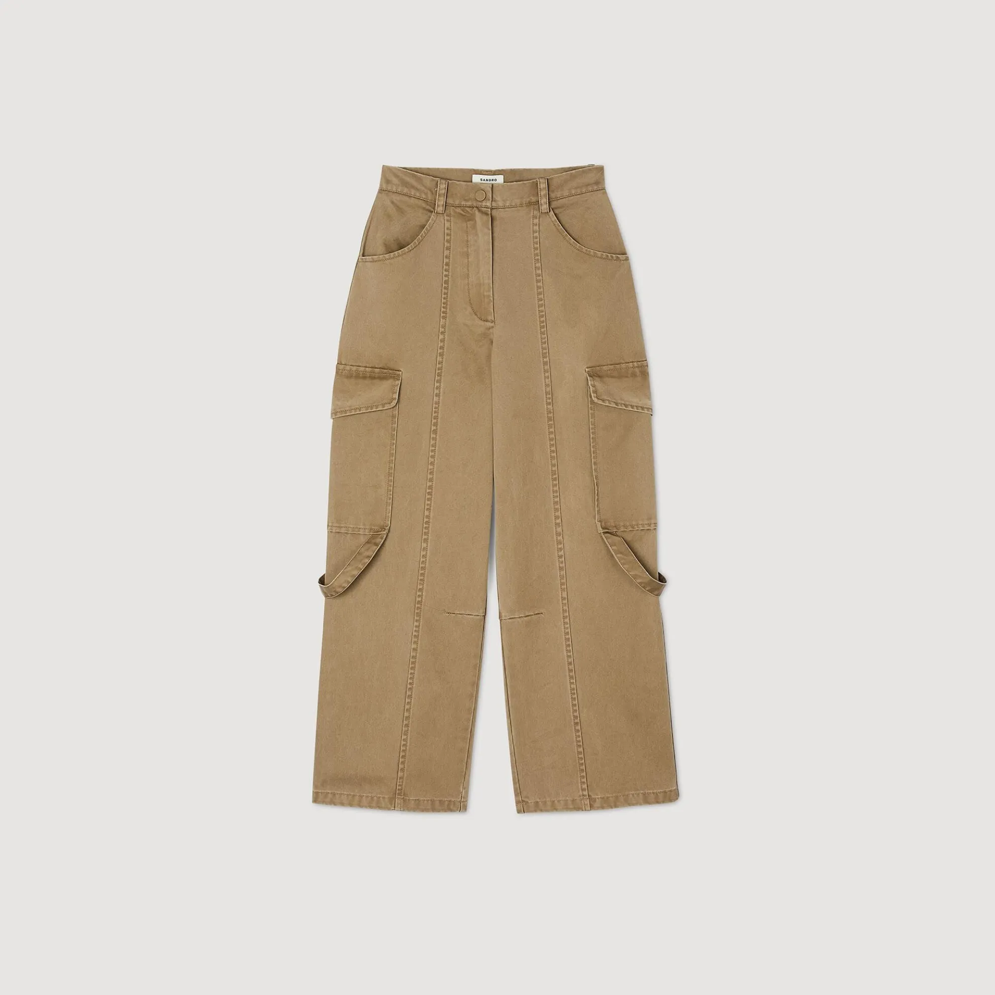 Cargobroek met wijde pijpen, grote klepzakken en zijbanden.