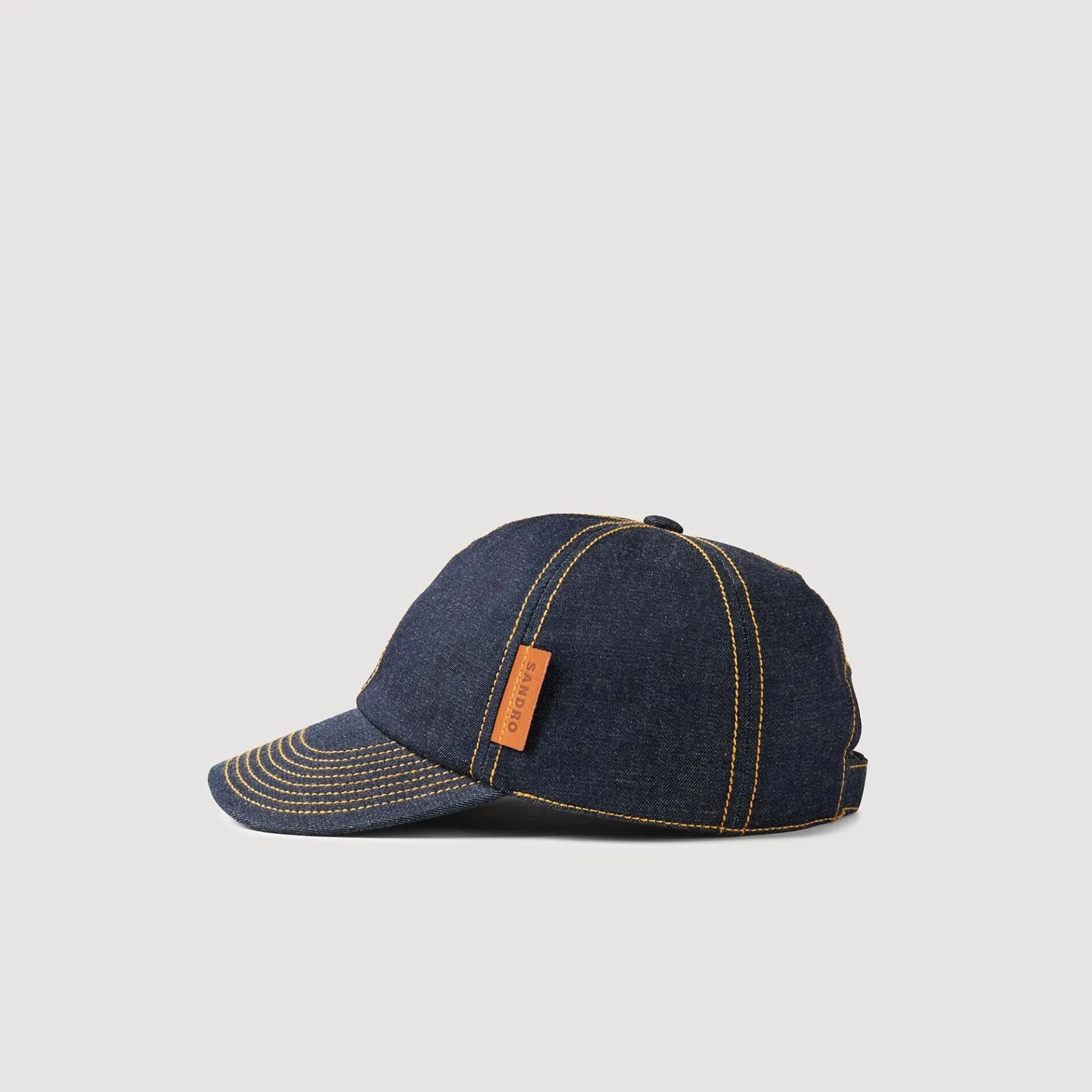 Raw denim pet met zonneklep, verstelbare band, leren SANDRO patch en contrasterende stiksels.