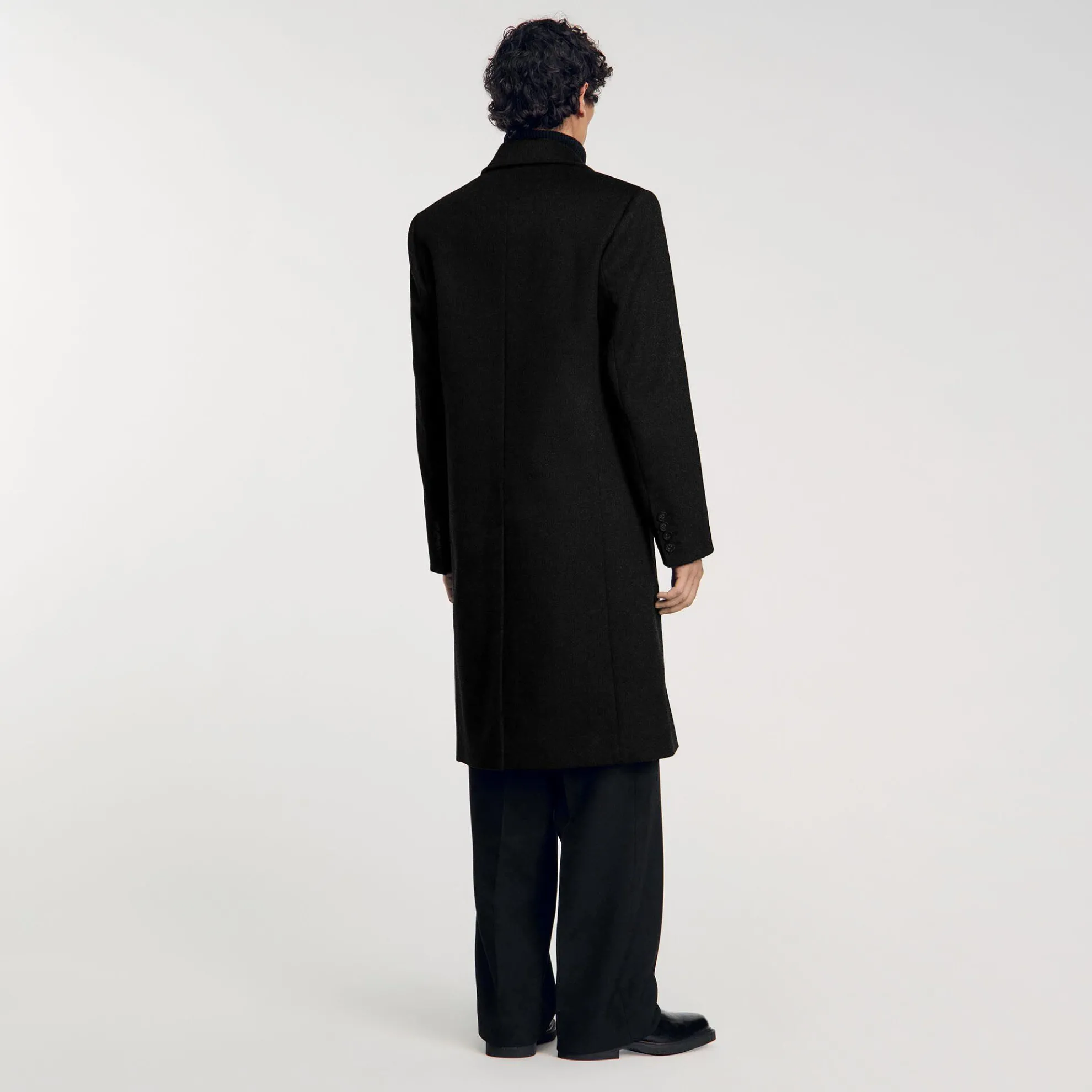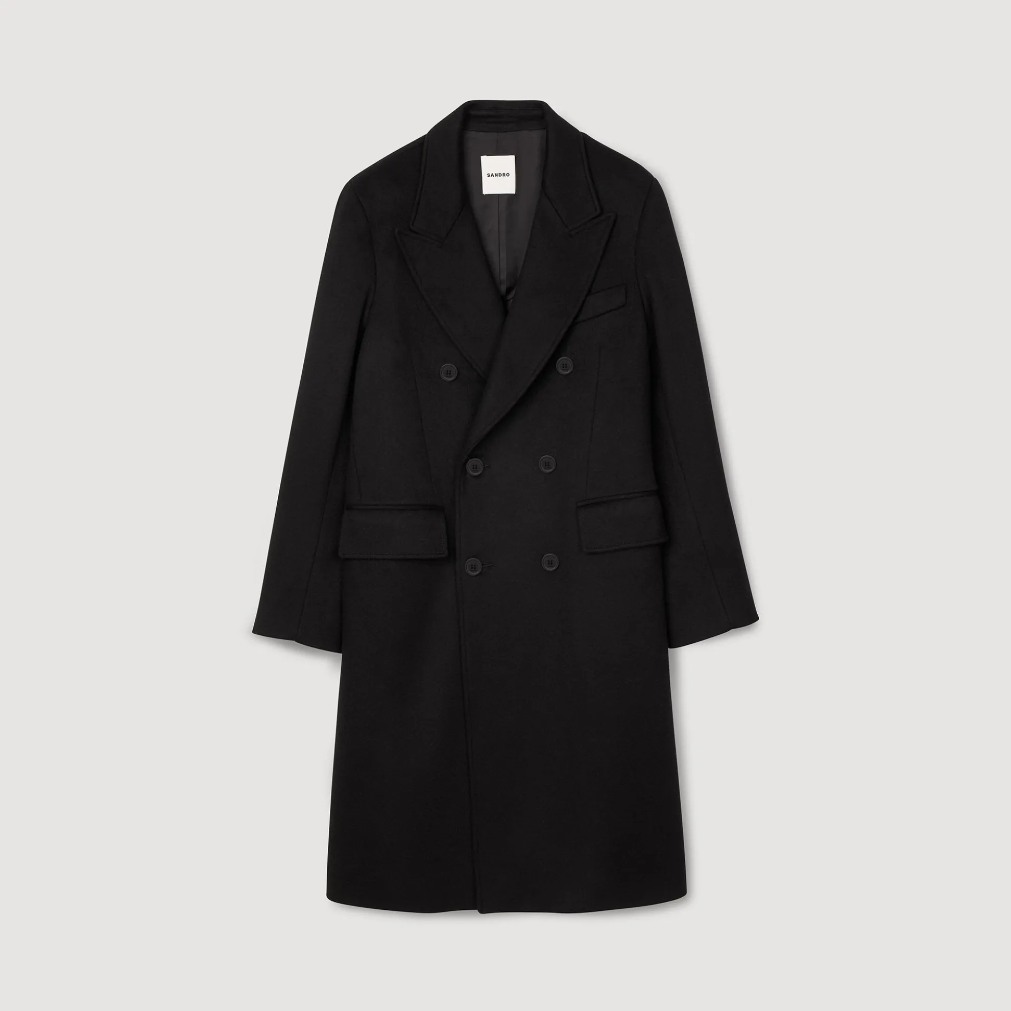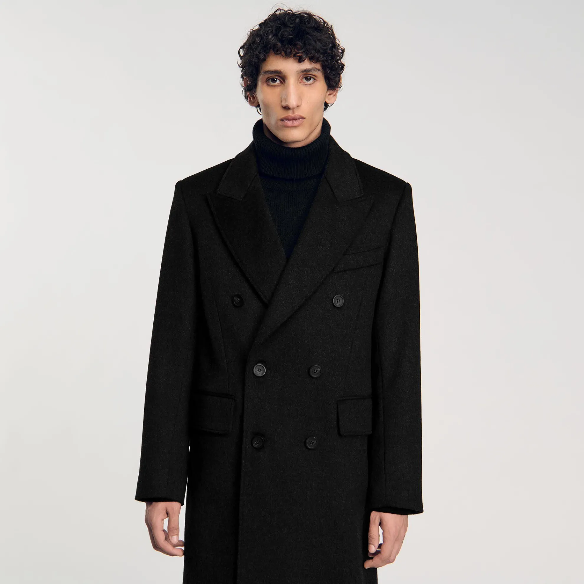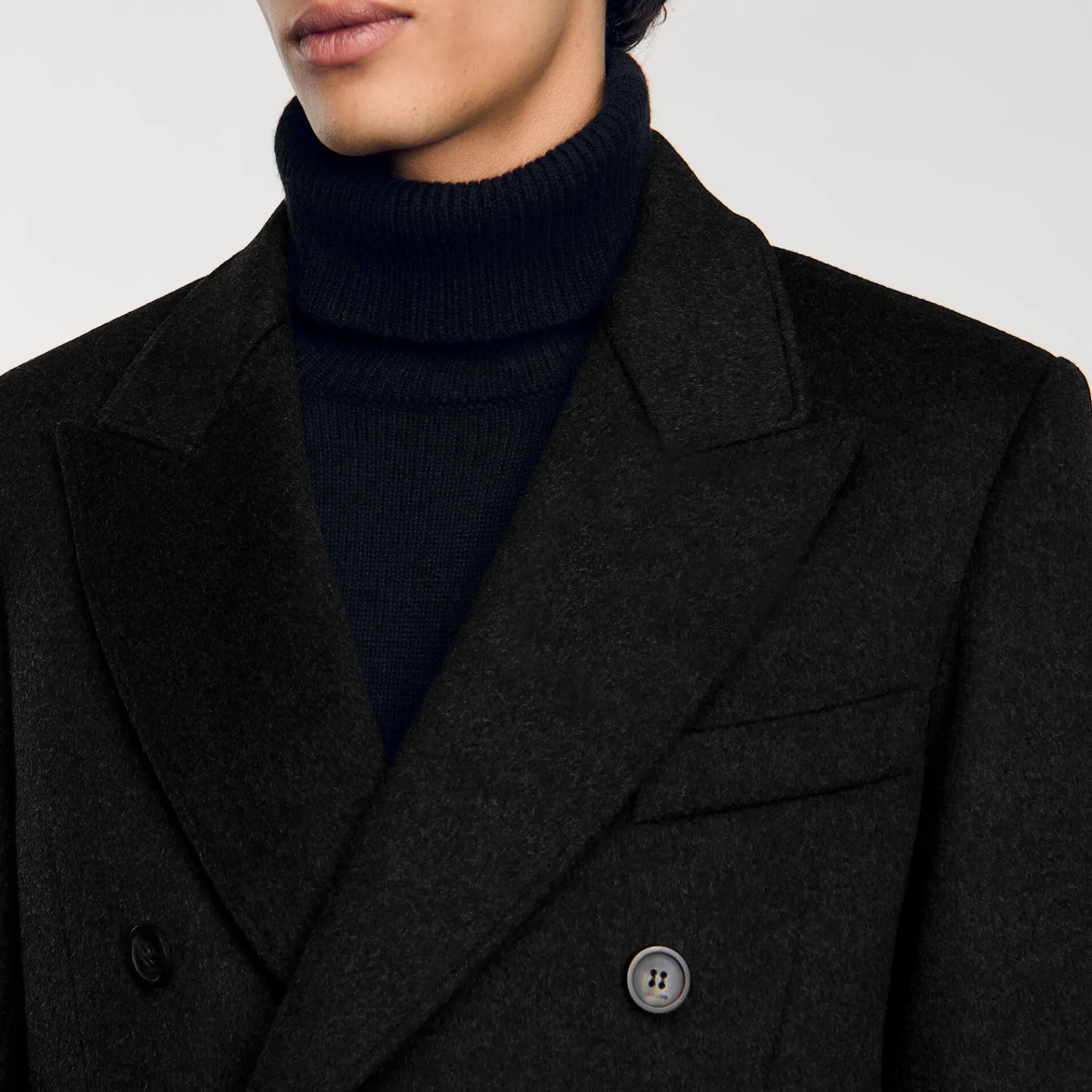 Driekwart jas met lange mouwen, dubbele knoopsluiting, klepzakken en paspelzak op de borst.