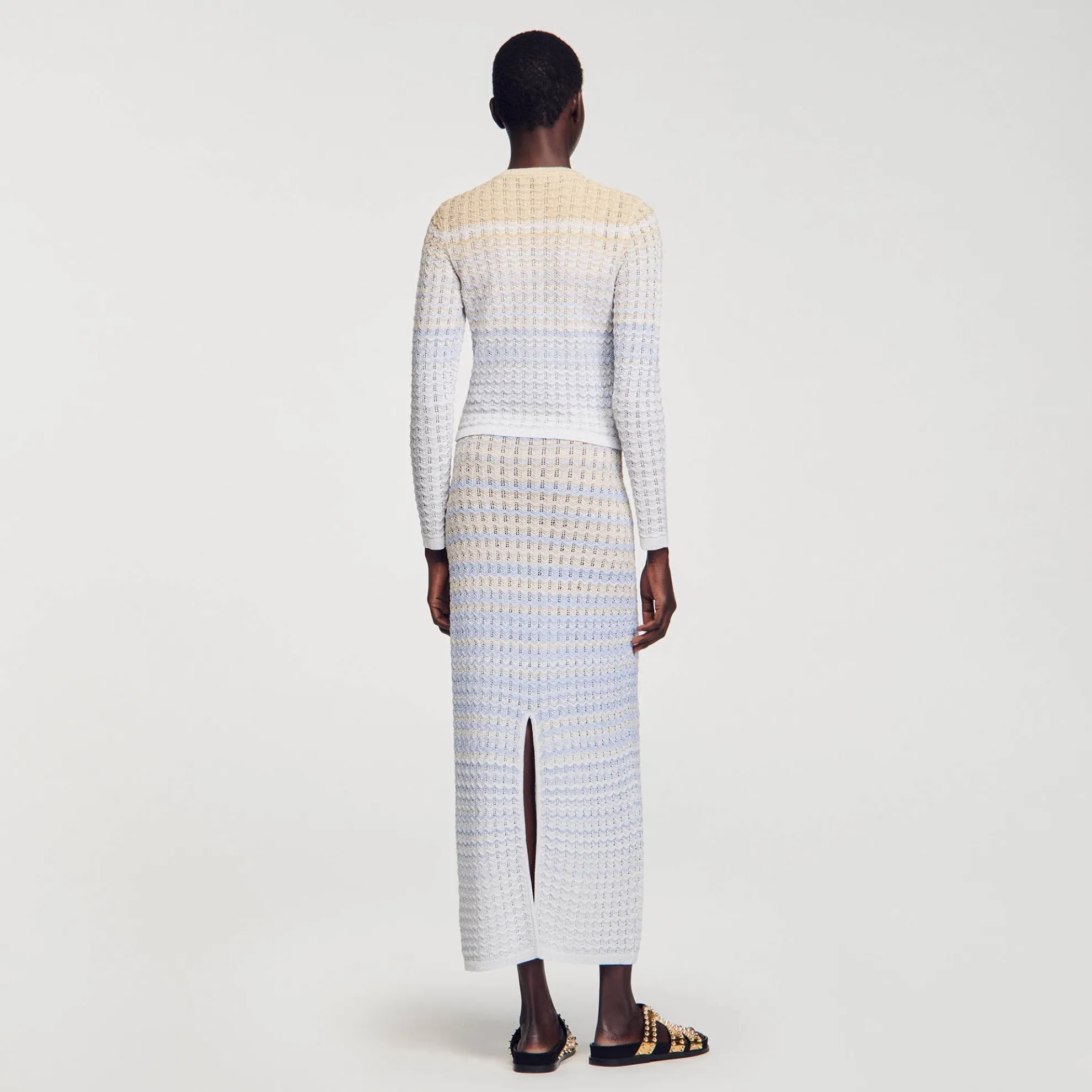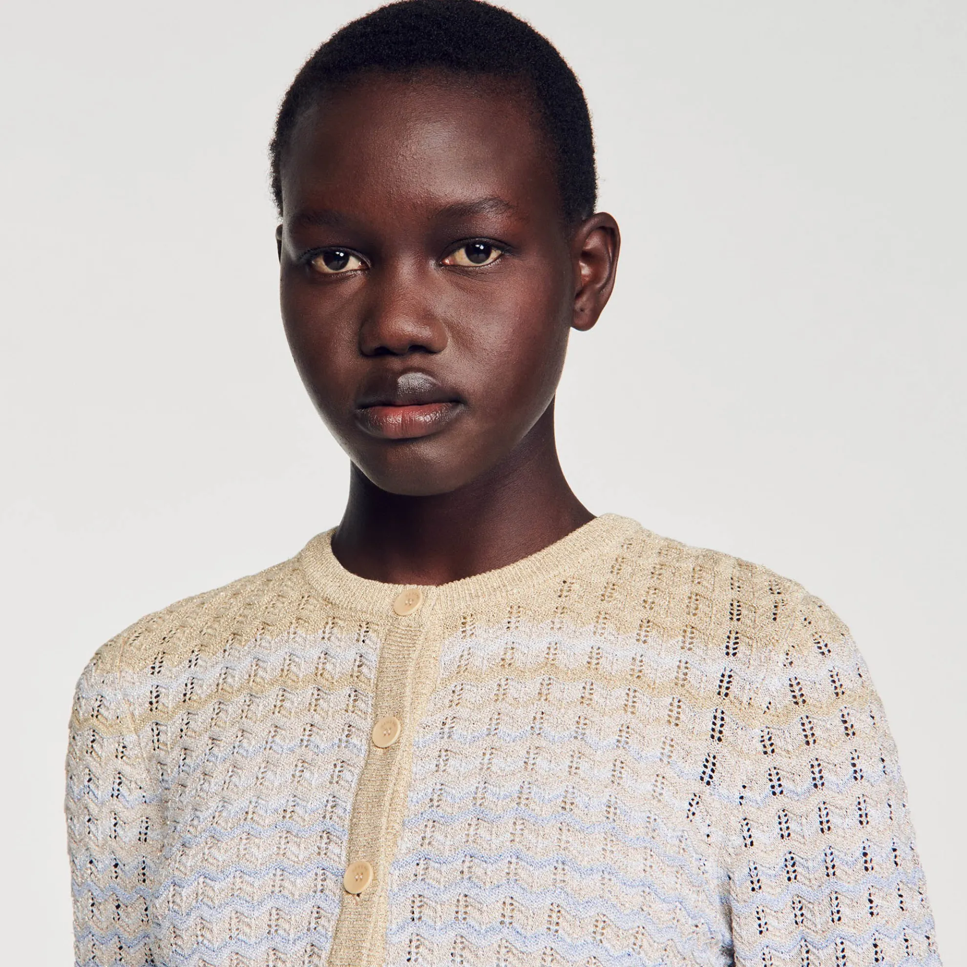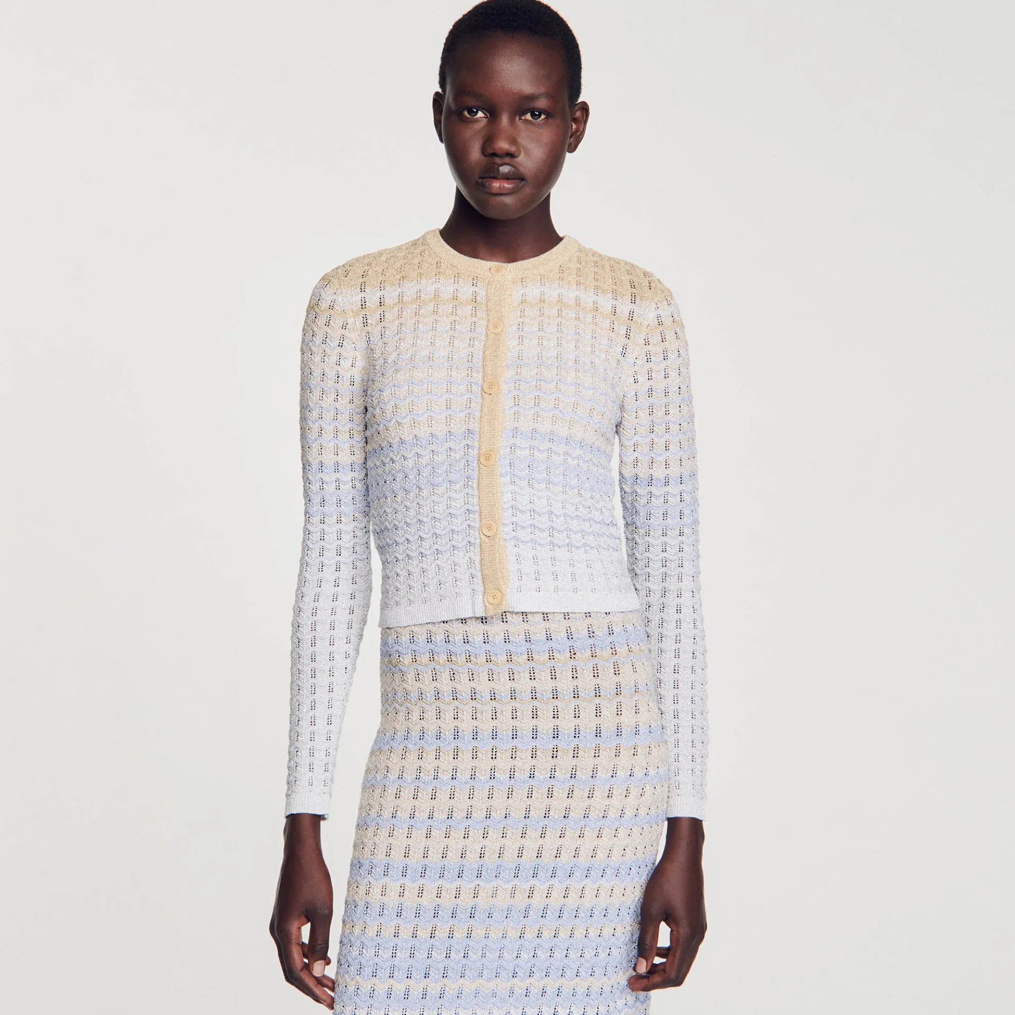 Cardigan vest pointillé gebreid met kleurverloop, zigzagpatroon, lange mouwen, een ronde hals en een knoopsluiting.