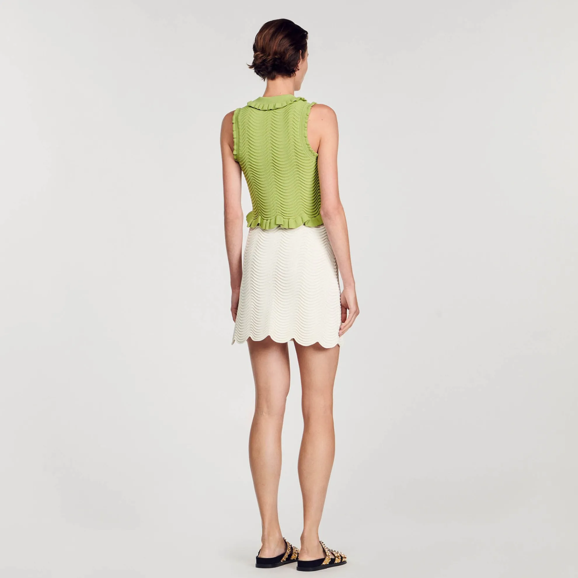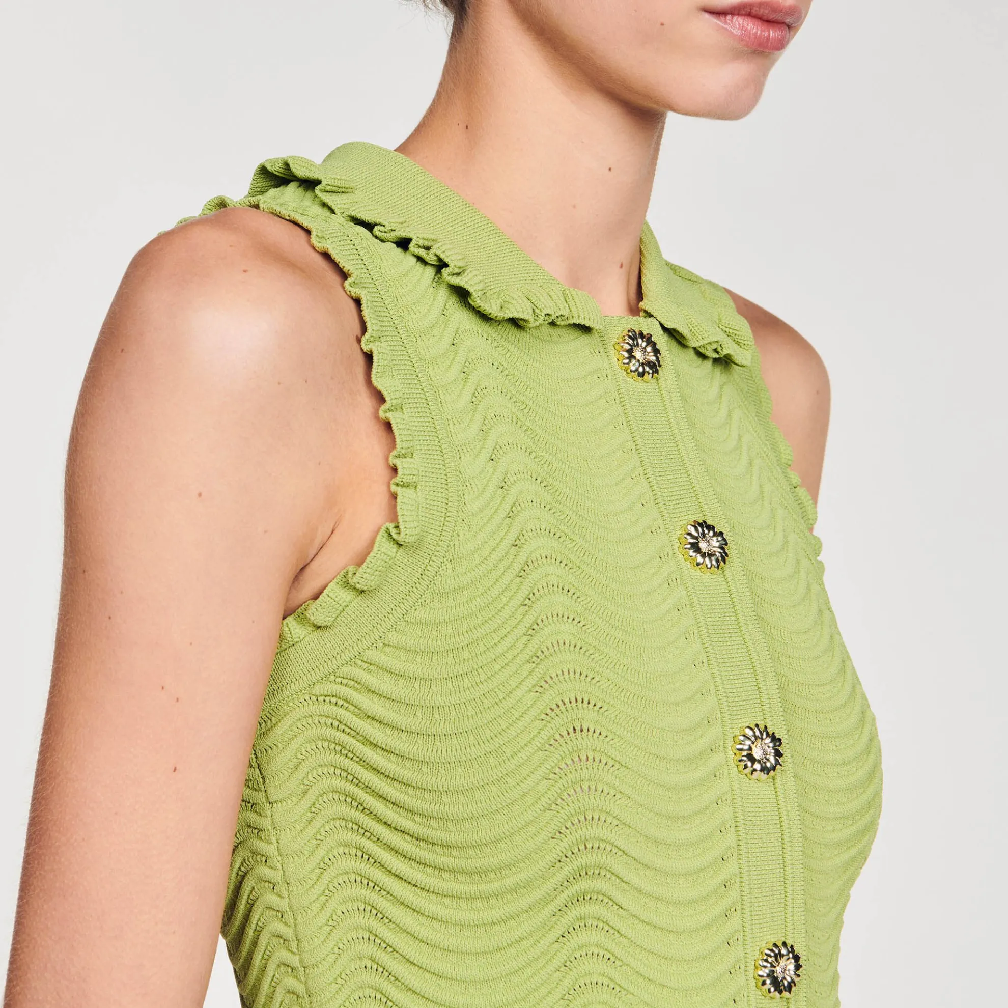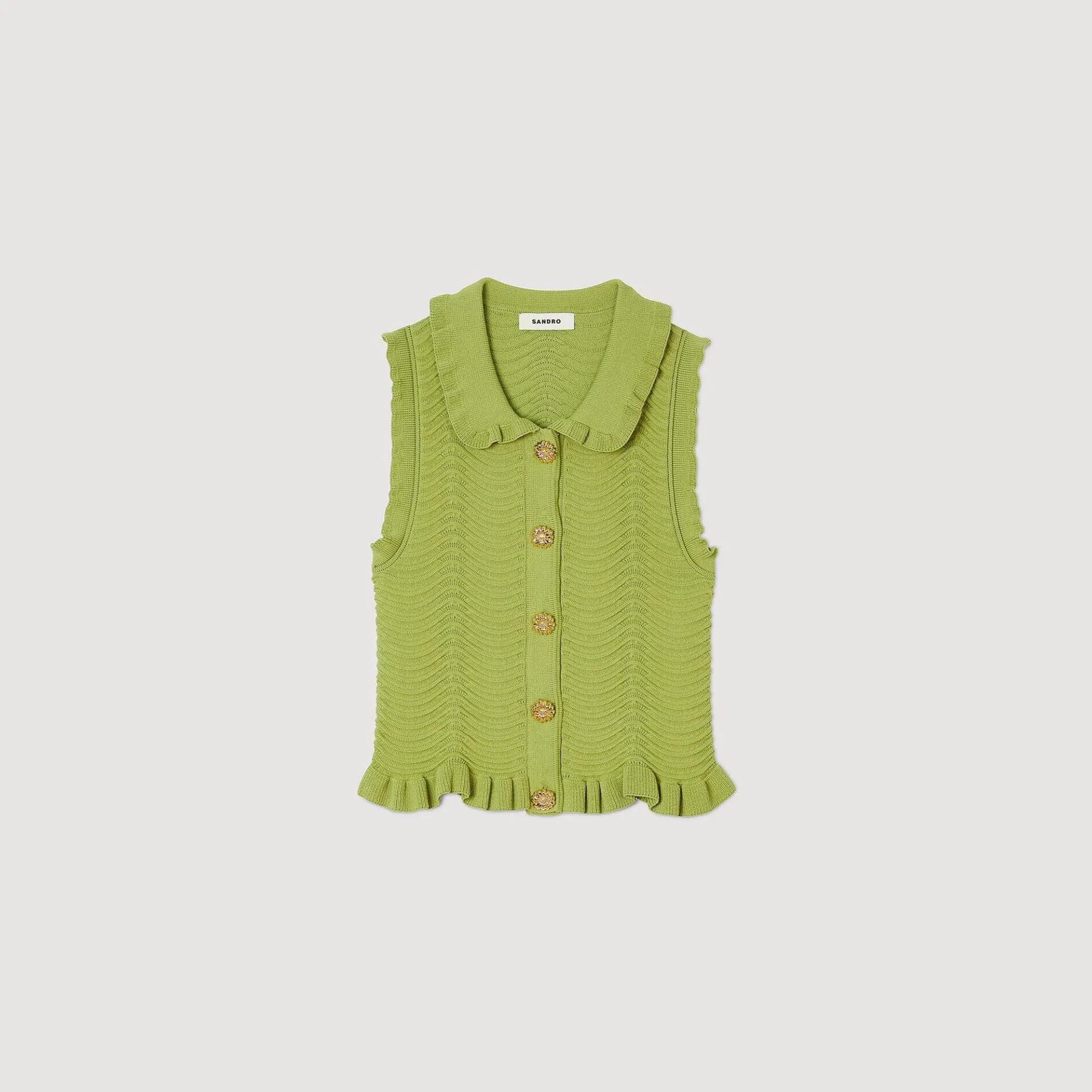 Mouwloze top van gestructuurd breiwerk met sierknoopsluiting, Claudine-kraag en volants aan de randen.