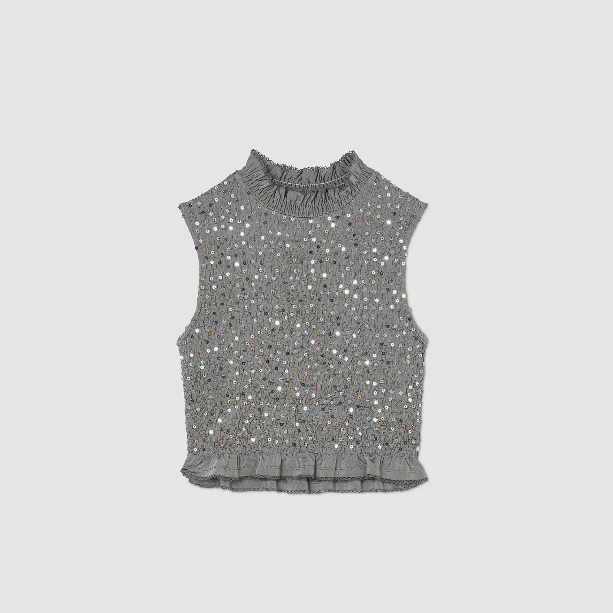 Korte mouwloze top, gesmokt en geborduurd met pailletten, met een opstaande hals en volants aan de onderkant.