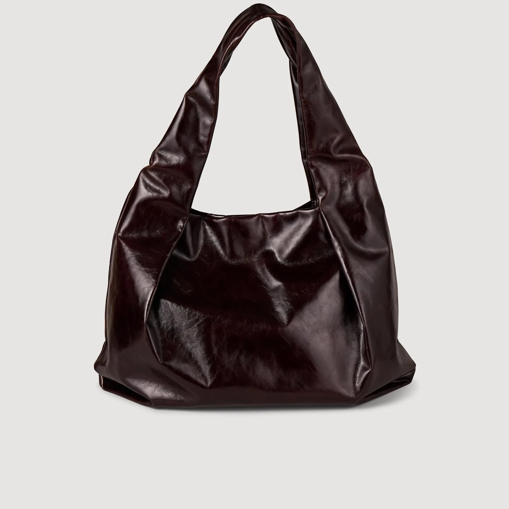 Grote tas van glanzend leer met een hengsel om over de schouder te dragen, plooien aan de zijkant en een magneetsluiting.