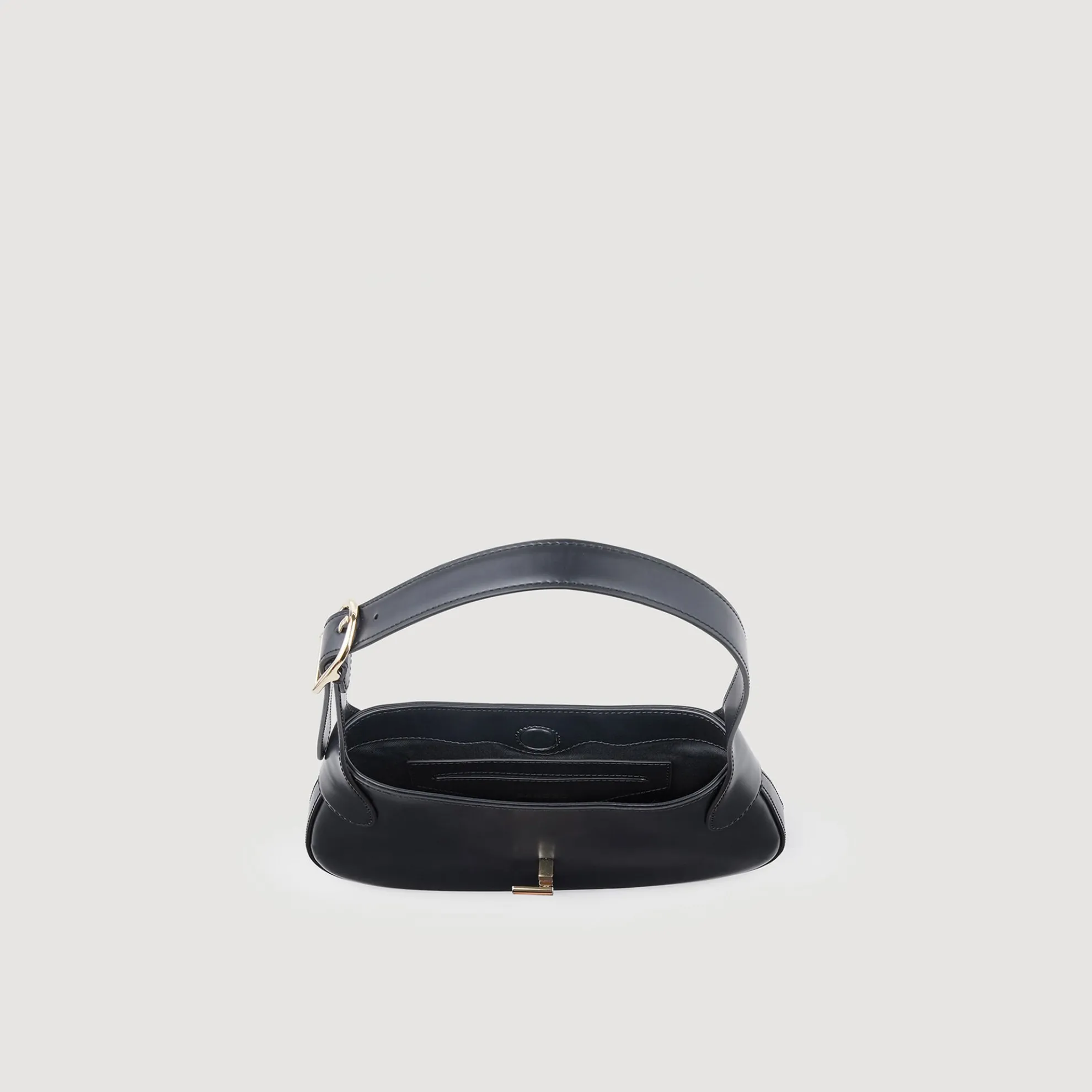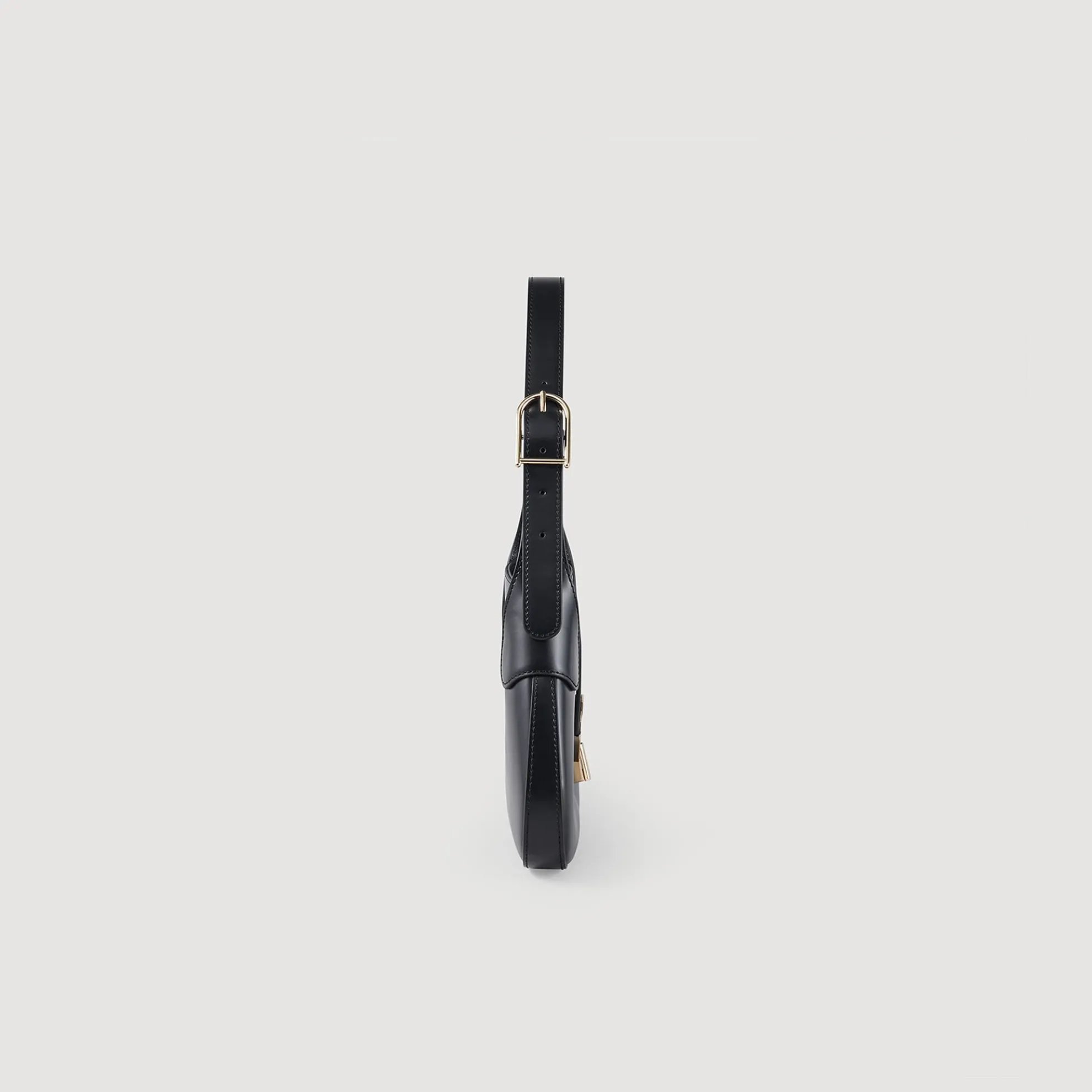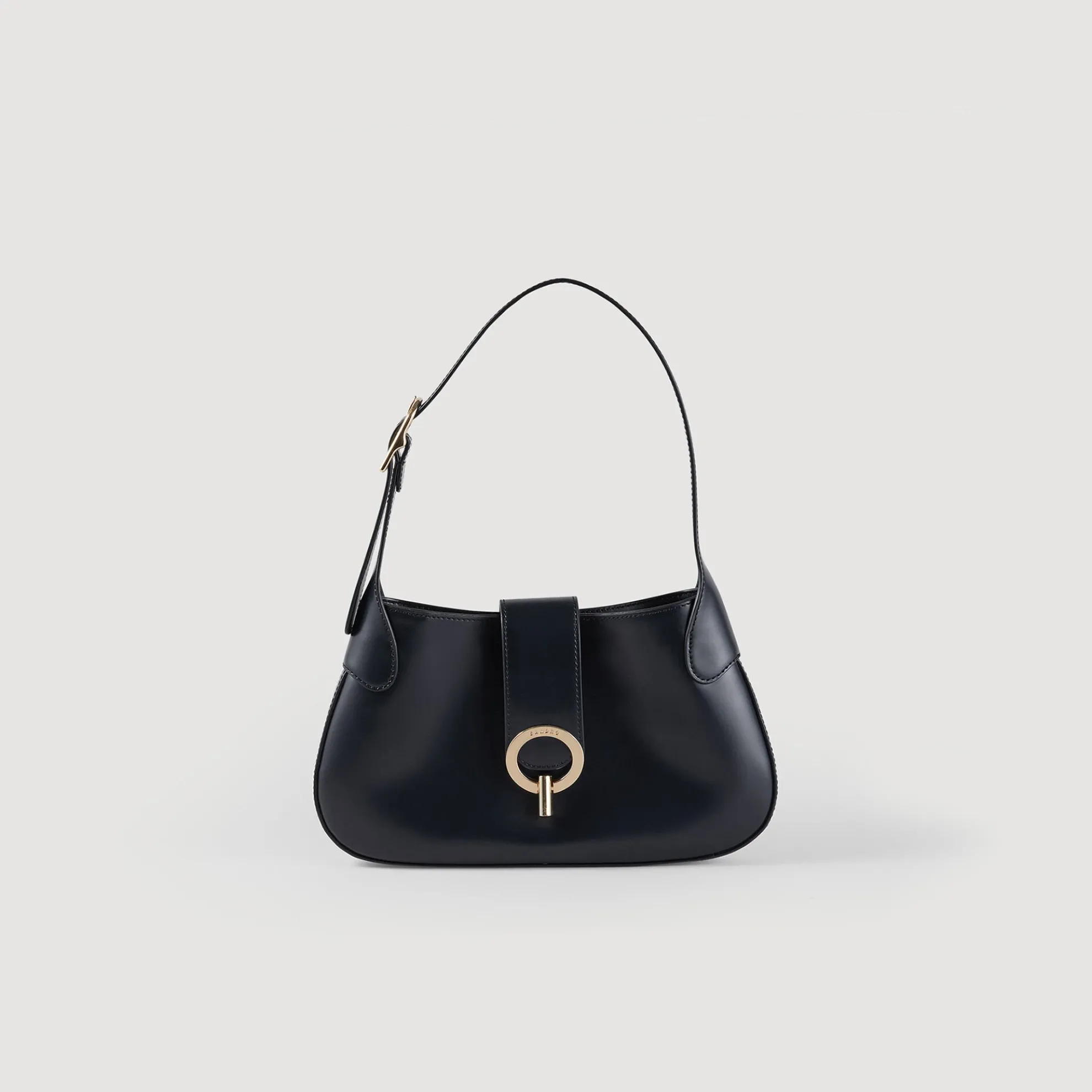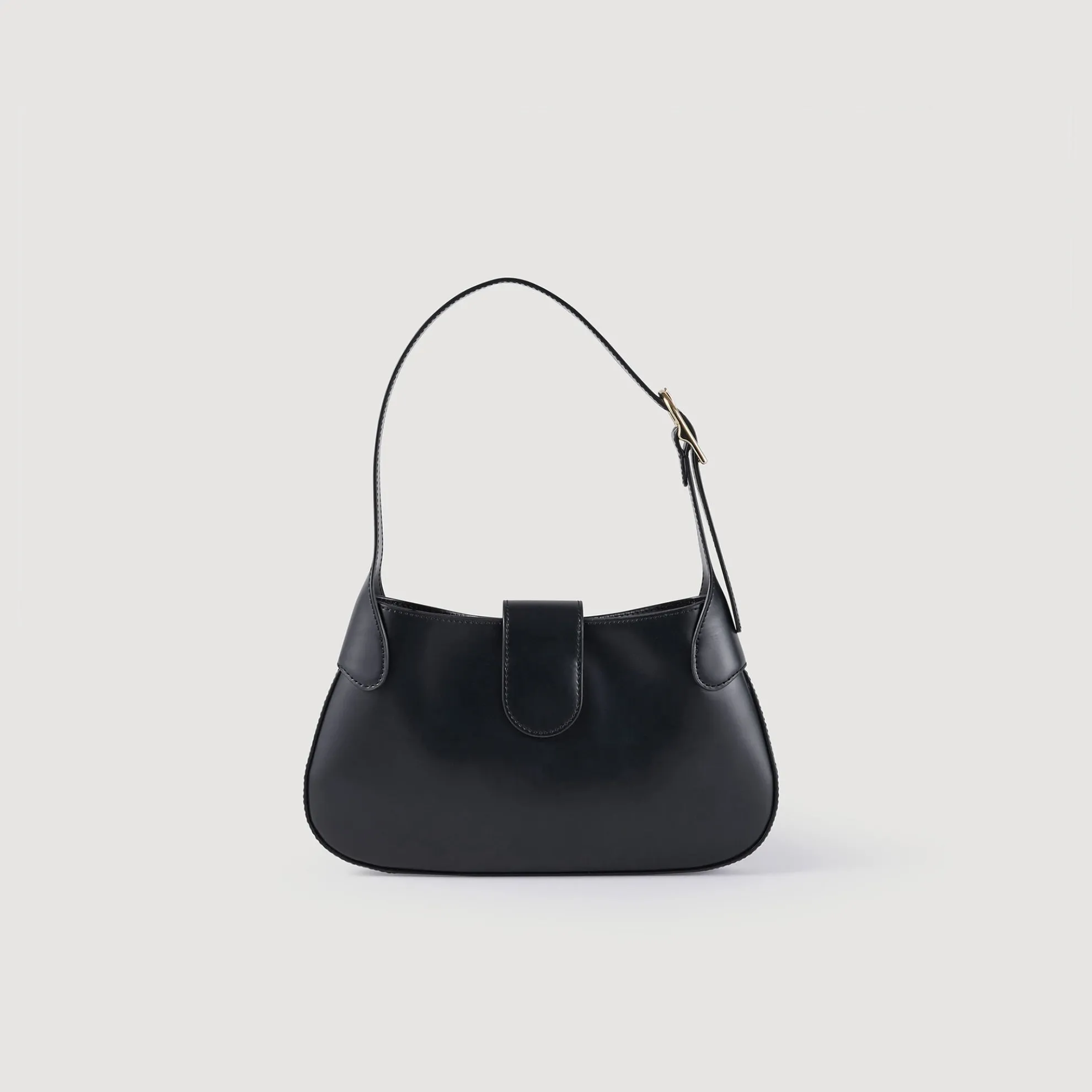 Gladleren handtas om aan de schouder te dragen, voorzien van een logosluiting en een hengel met metalen gesp.