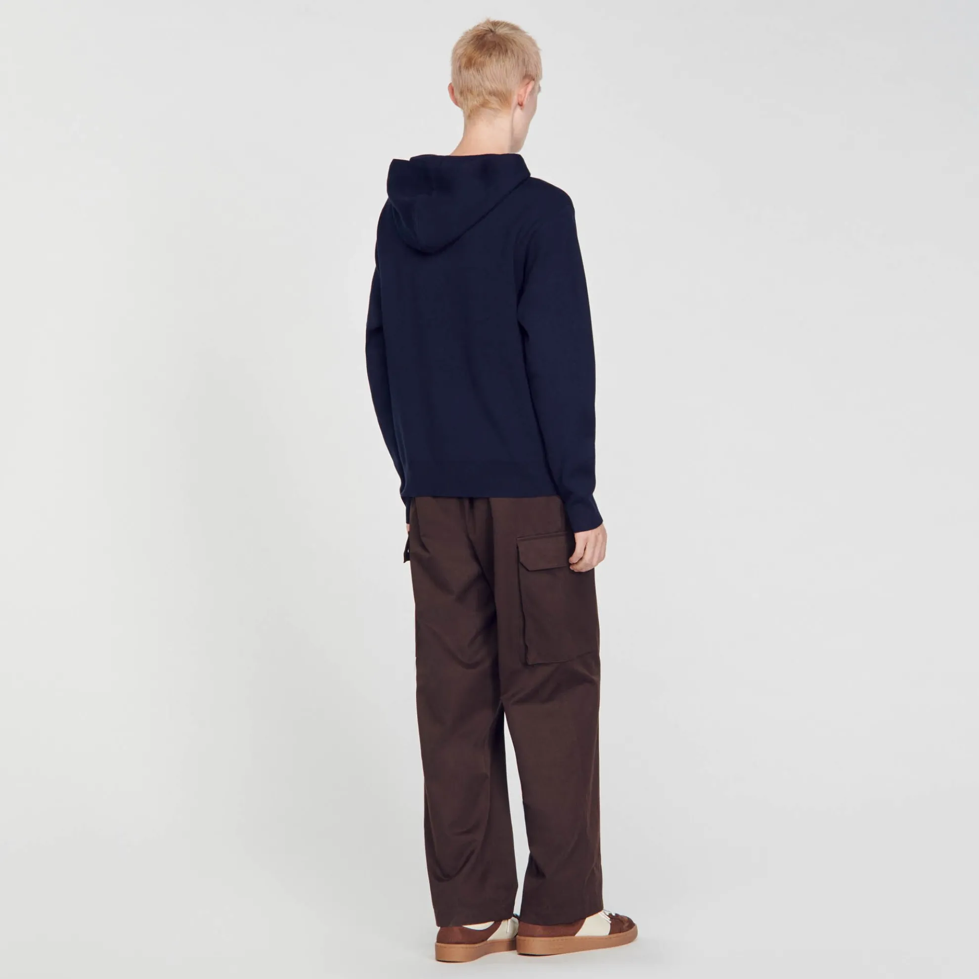 Gebreide hoodie van dubbel jersey met capuchon, lange mouwen, kangoeroezak aan de voorkant, geribde zoom en manchetten, en leren patch op de zijkant.