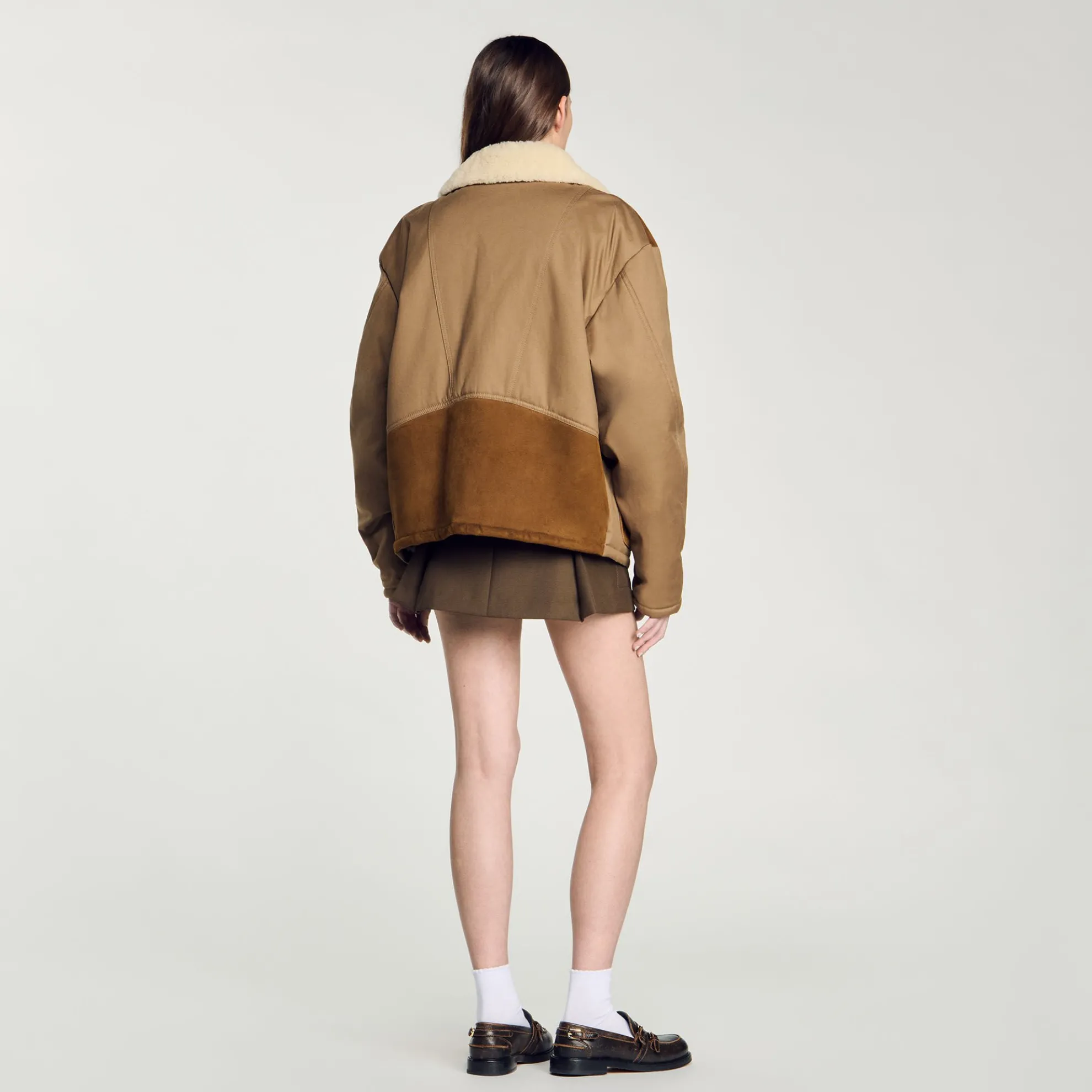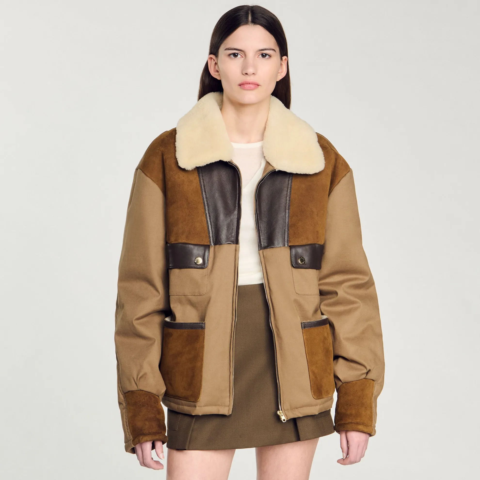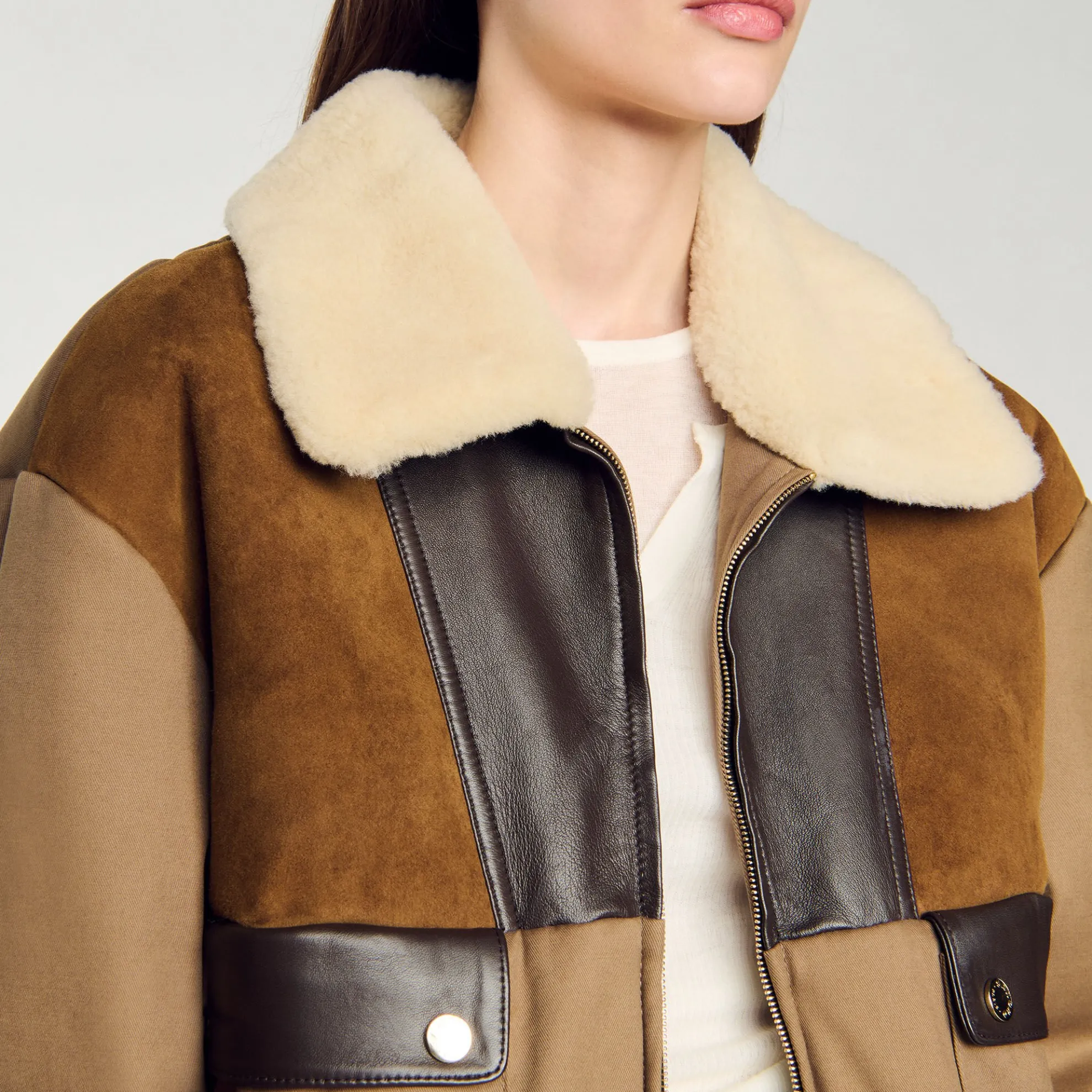 Jack van gemengd materiaal in patchwork met een contrasterende kraag van schapenvacht, inzetstukken van glad leer en suède, lange mouwen en een ritssluiting.