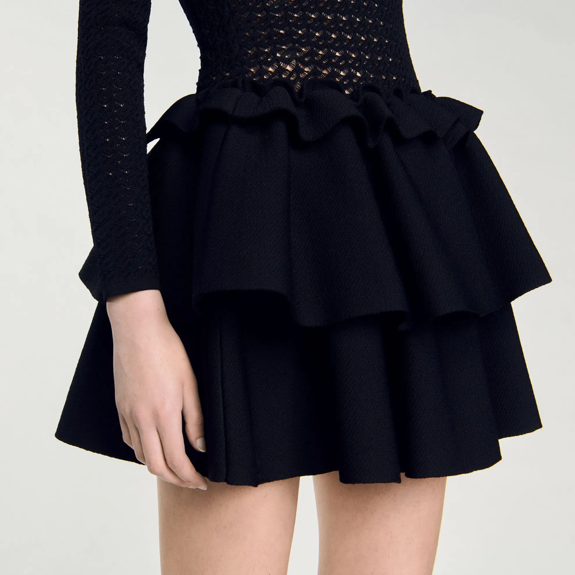 Jurk met trompe l’œil-effect met een gebreide top met ronde kraag en lange mouwen en een wijde rok met ruches.