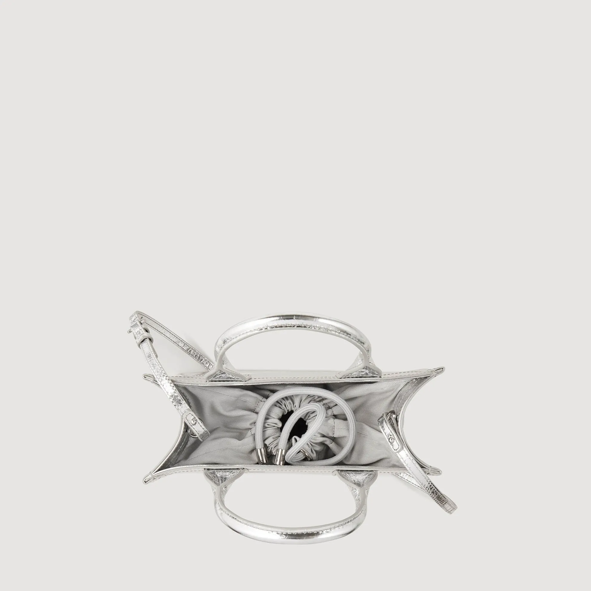 Kleine shopper van metallic leer met rimpel-effect, ton-sur-ton Sandro label in reliëf, magneetsluiting, kleine hengsels en binnenzak.