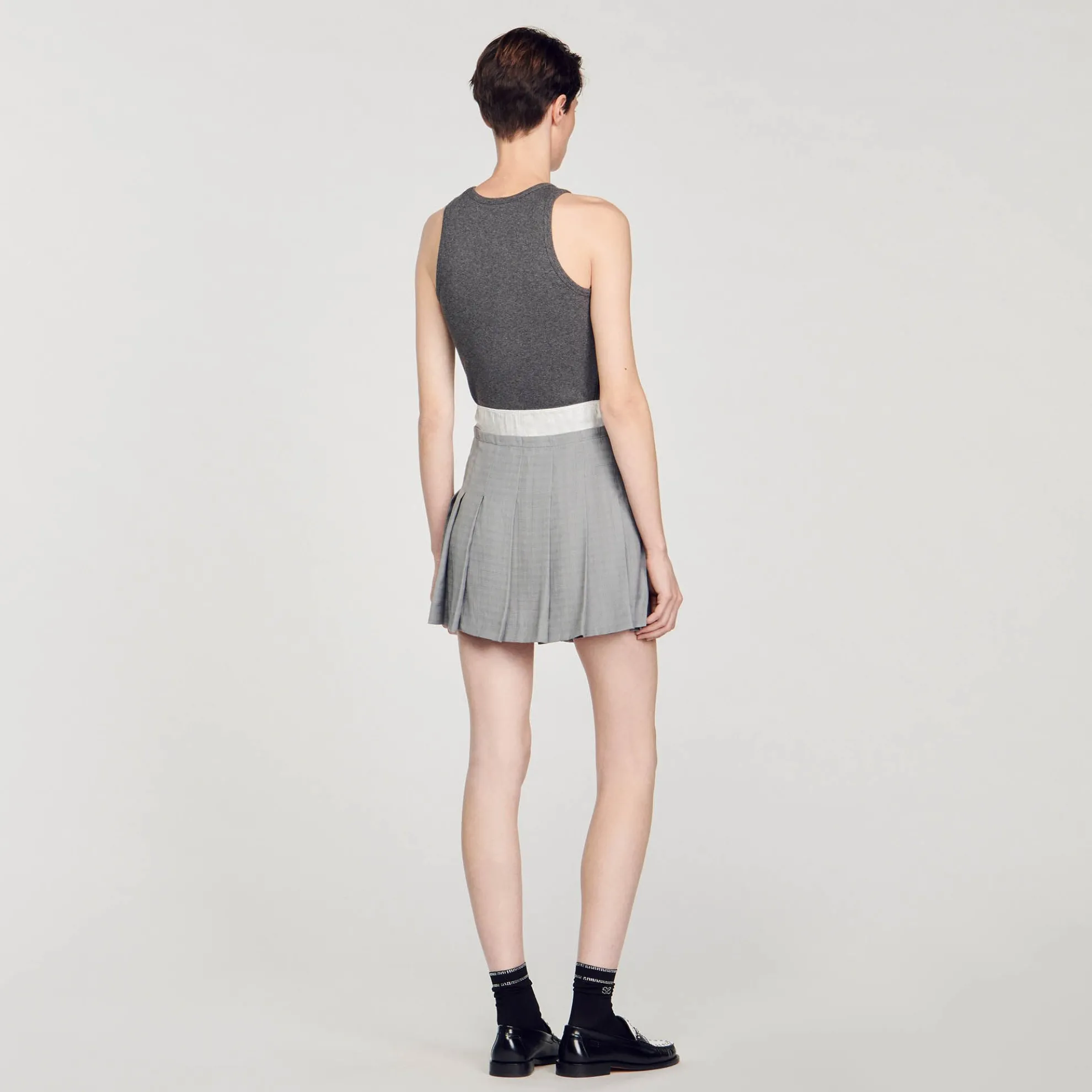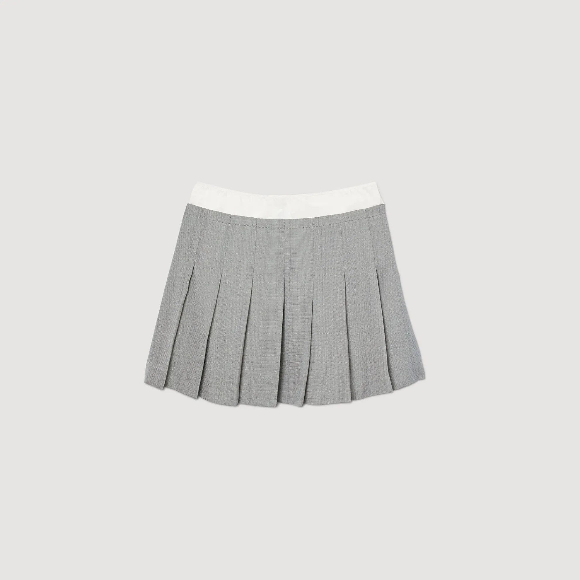 Korte rok met plooien met trompe-l’oeil-effect en contrasterende satijnen elastische riem.