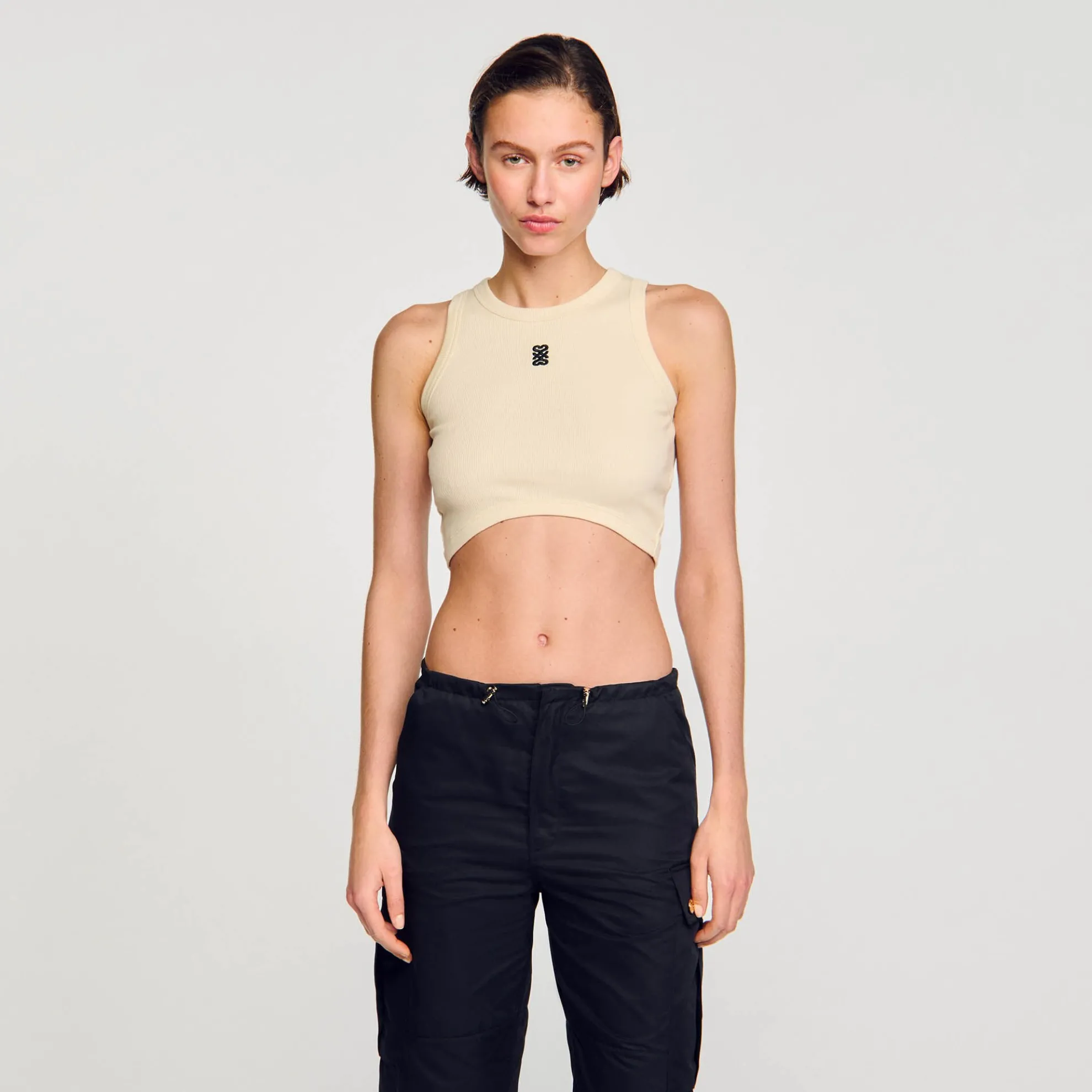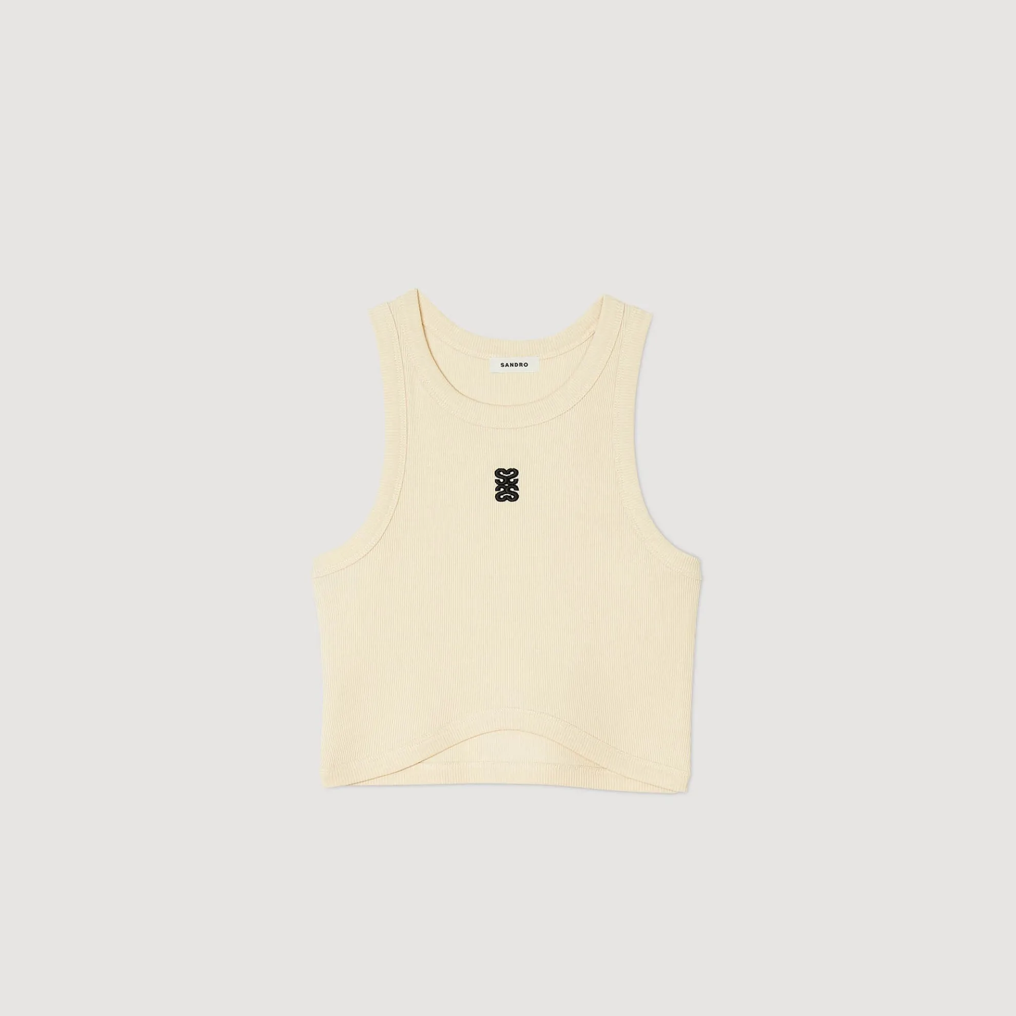 Kort mouwloos vest van geribde jersey met ronde hals met geborduurd contrasterend dubbel S-logo.