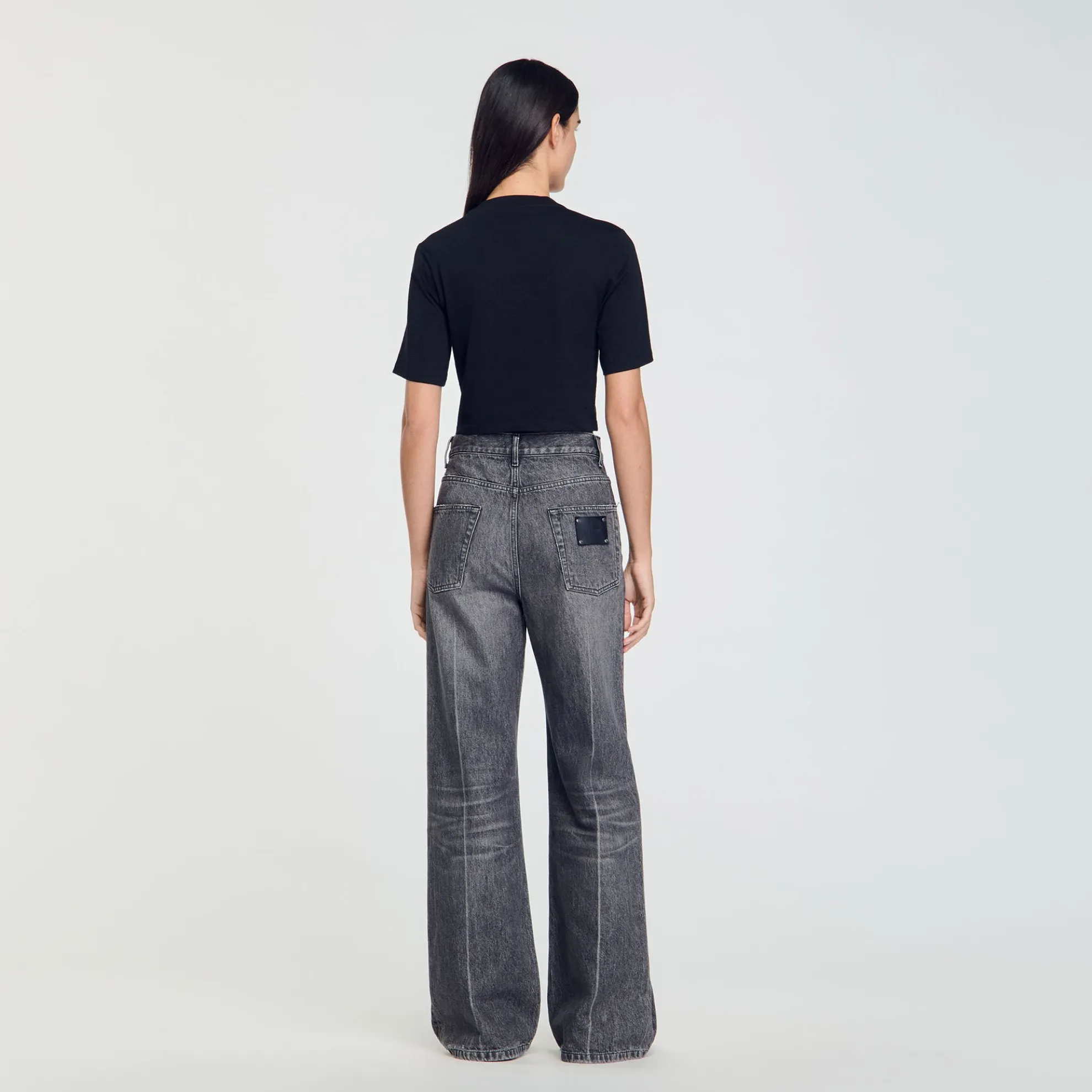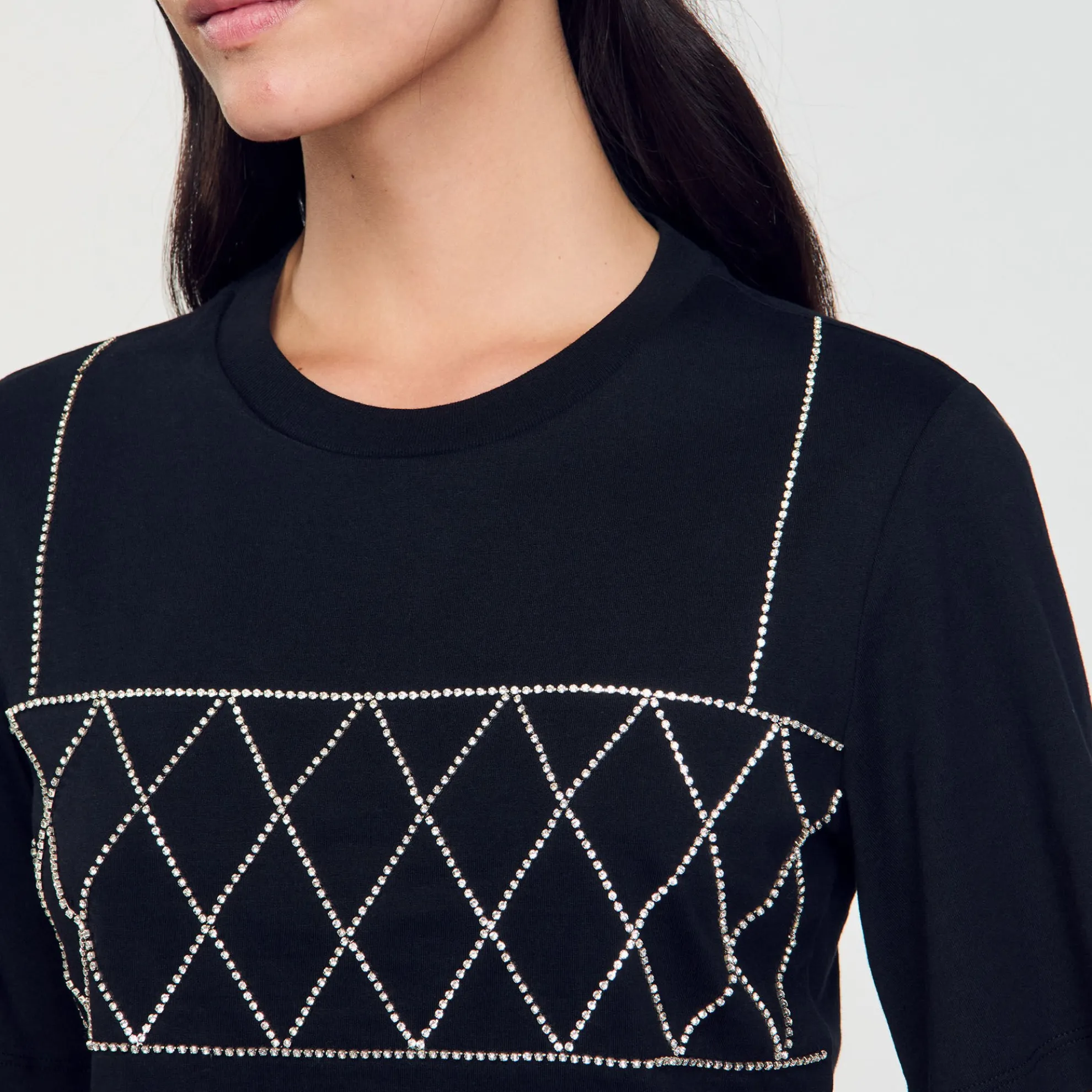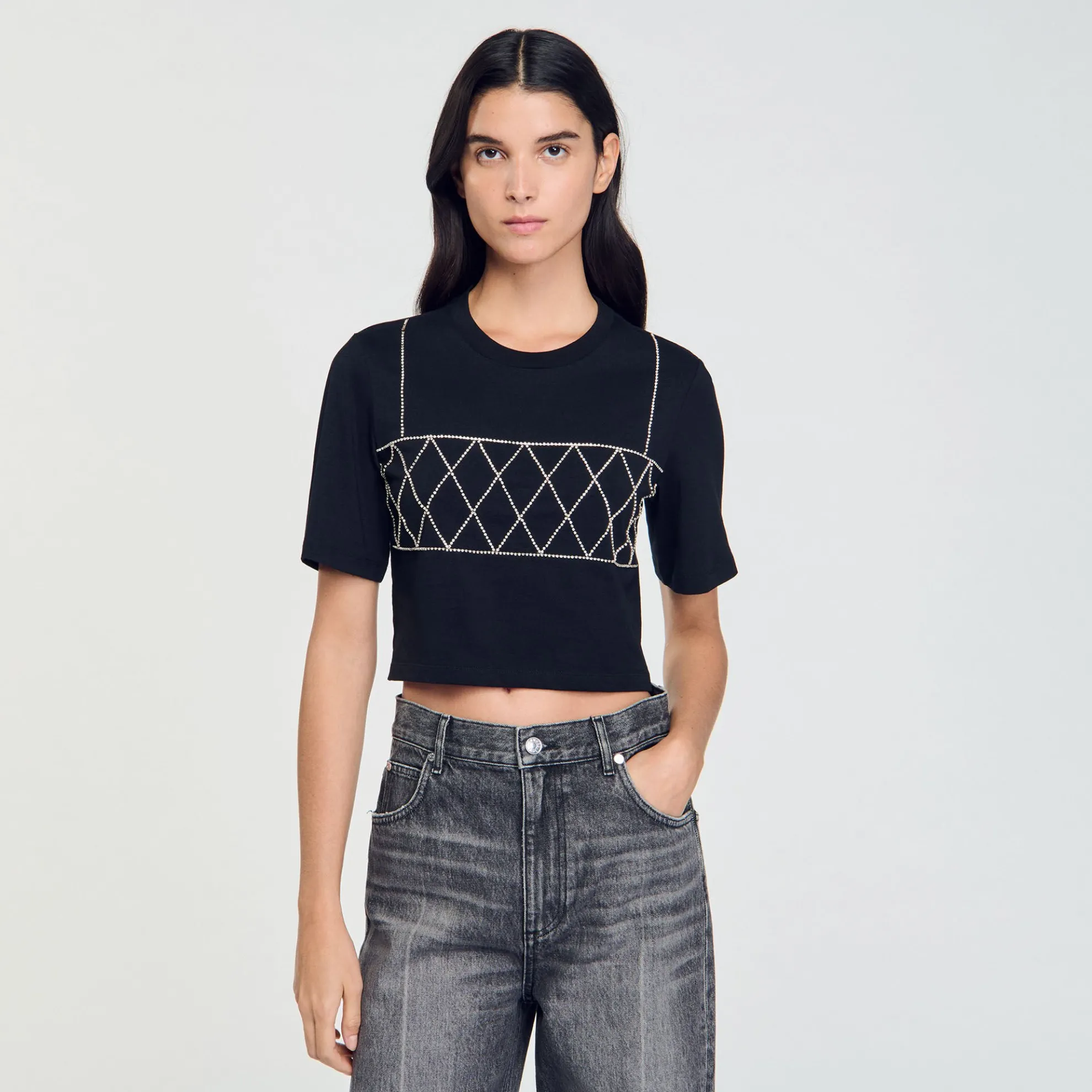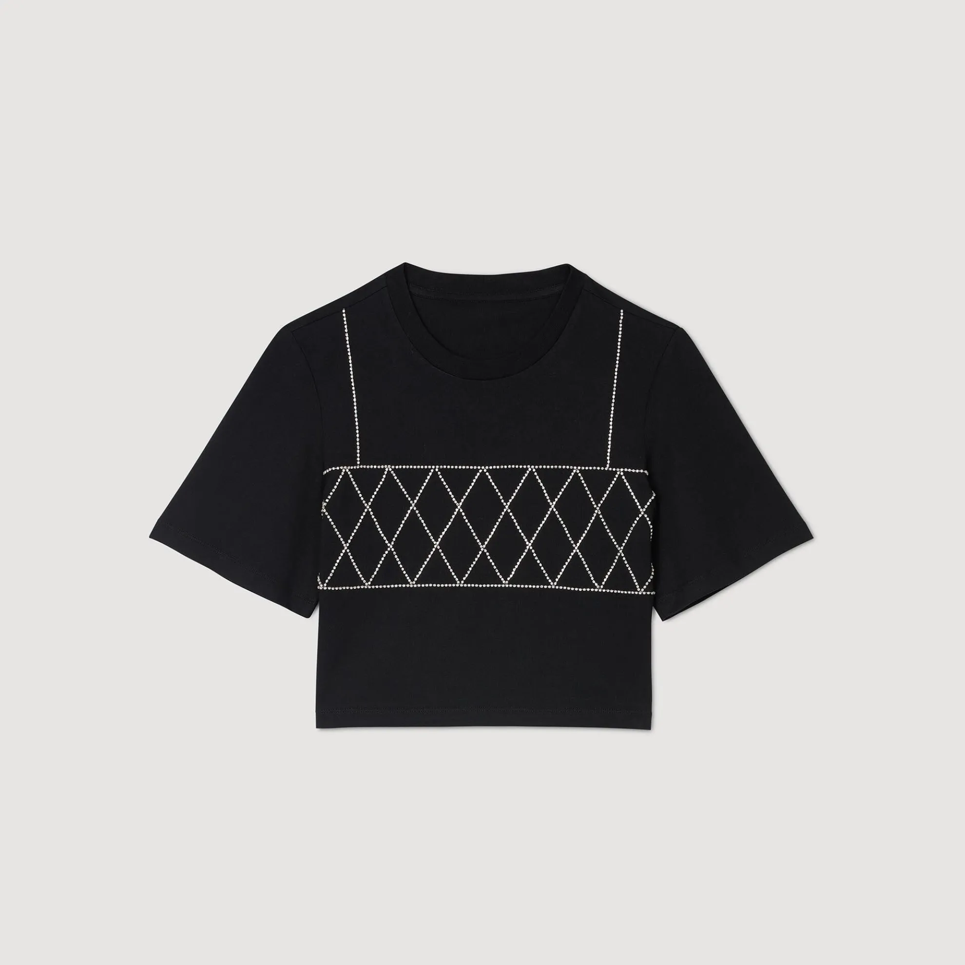 Kort T-shirt met korte mouwen en ronde hals met stras in trompe l’oeil brassière look.