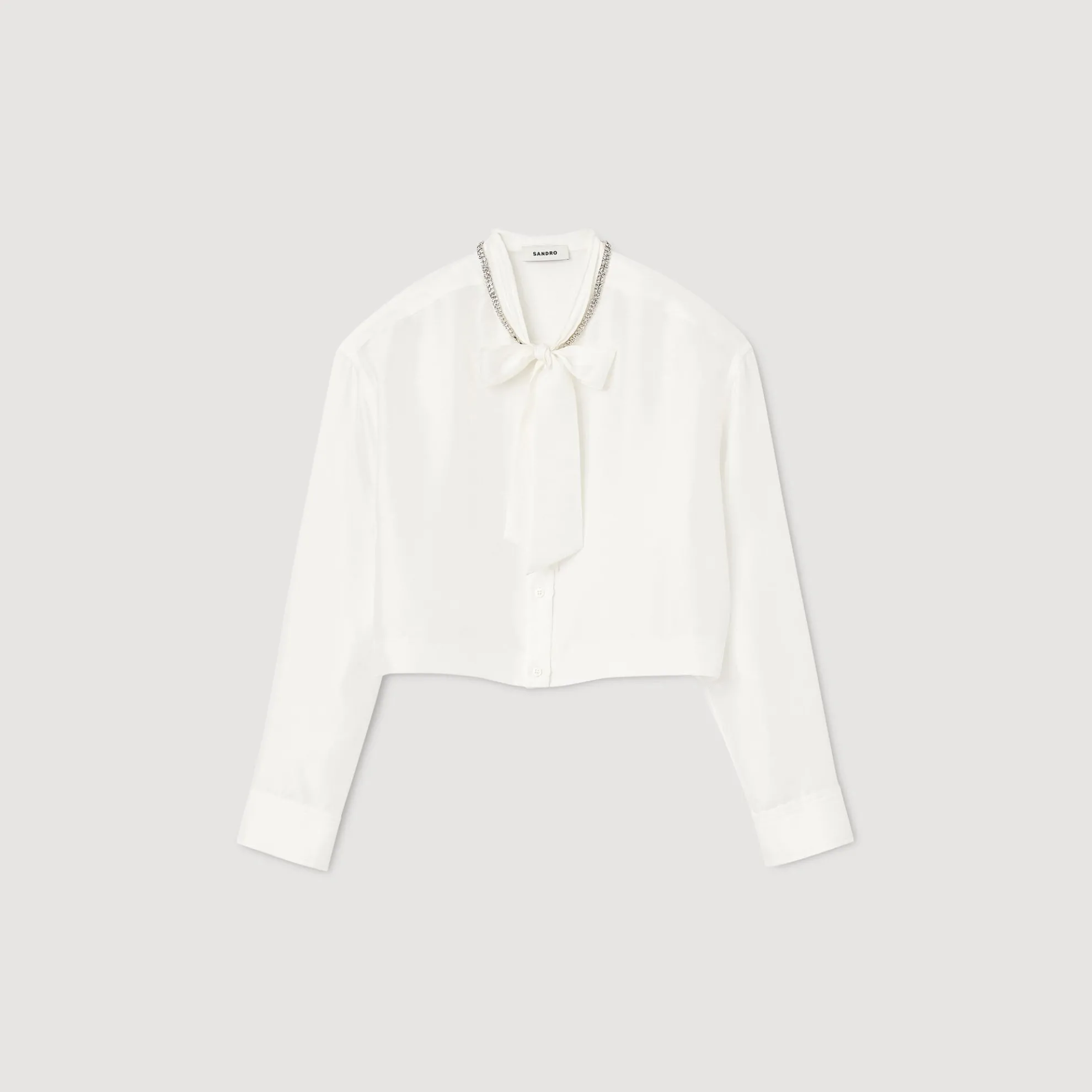 Kort overhemd van zijdetwill met strikkraag versierd met steentjes, lange mouwen en sierstiksels.