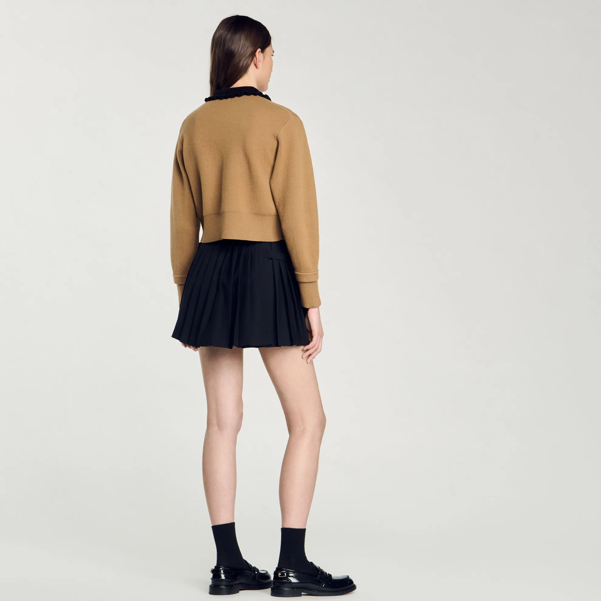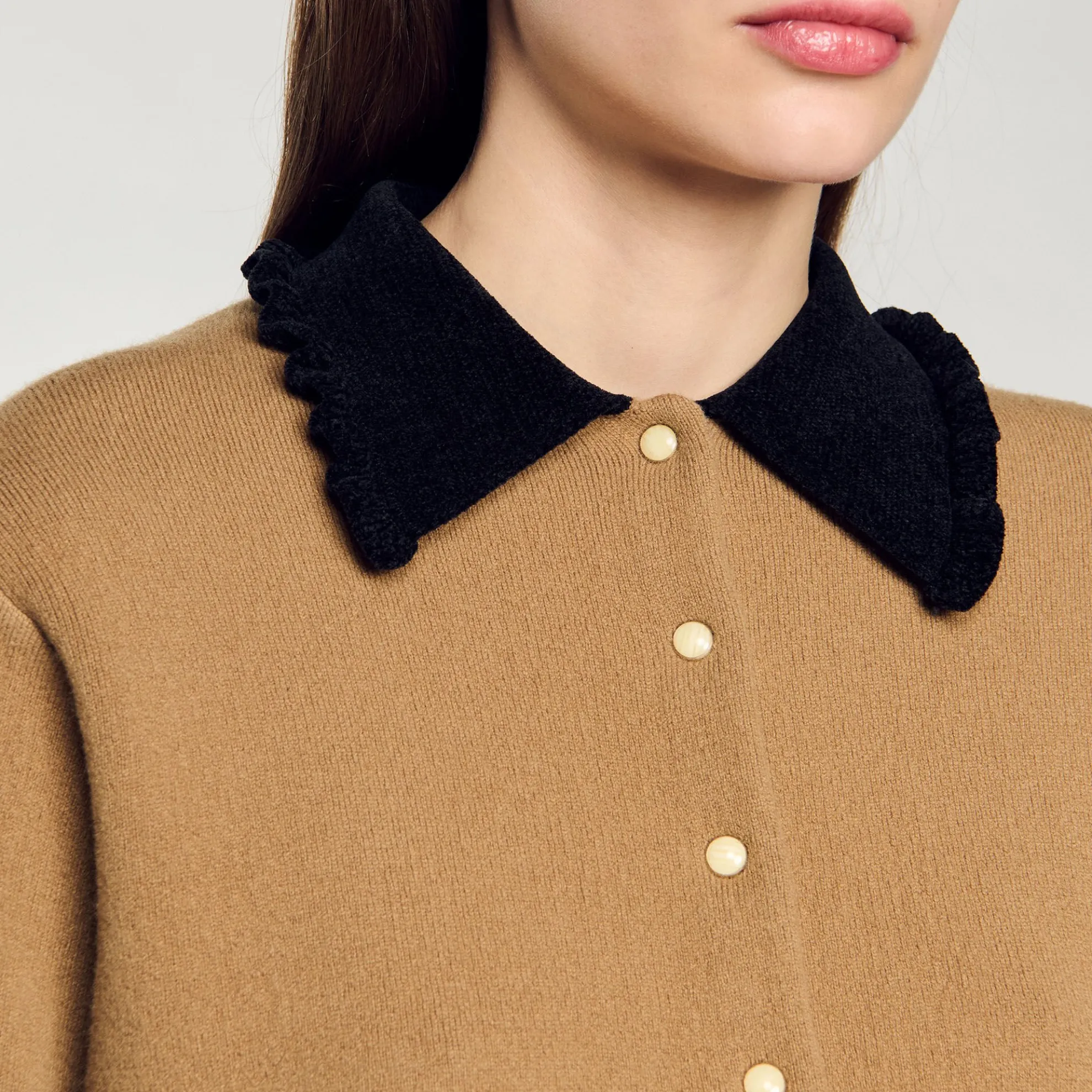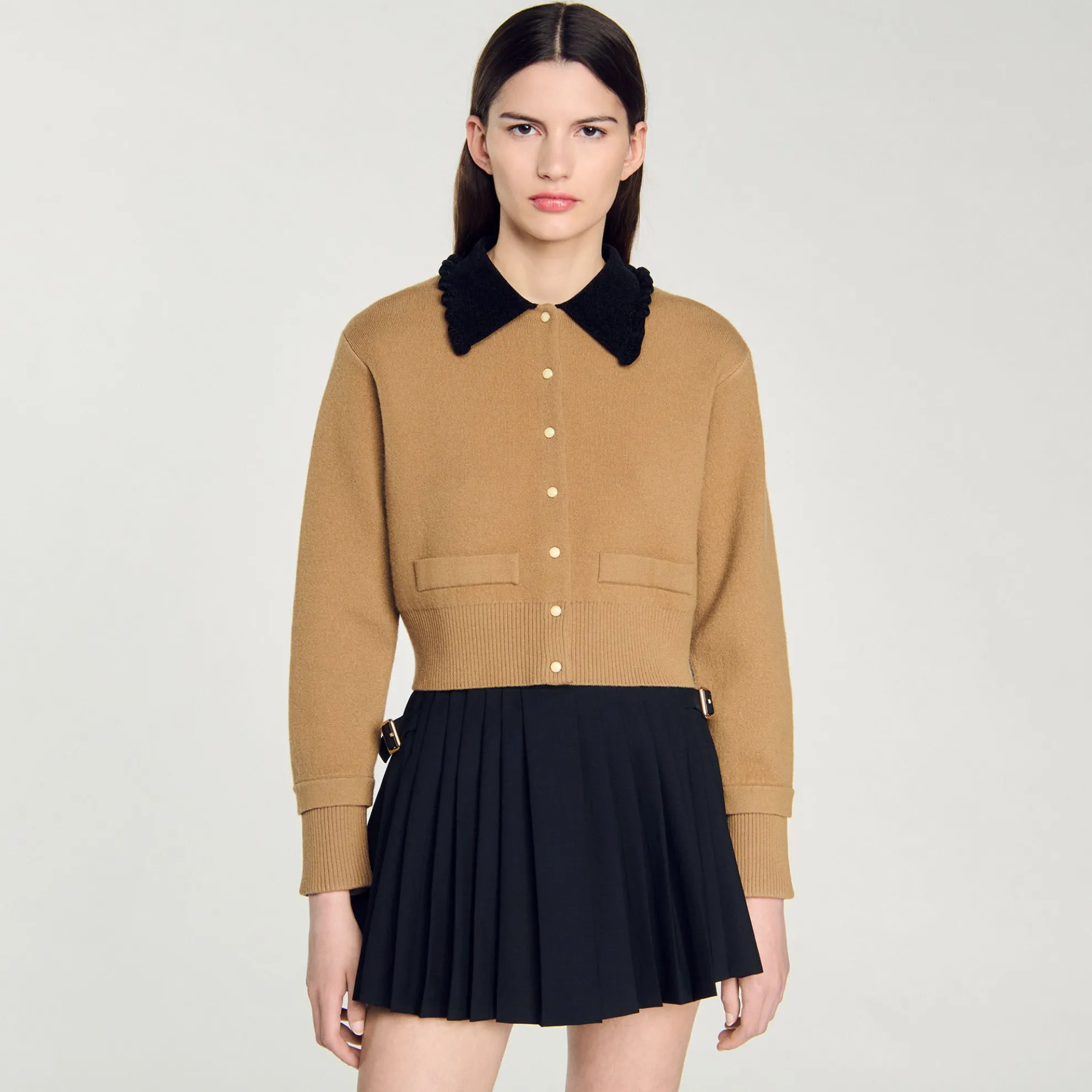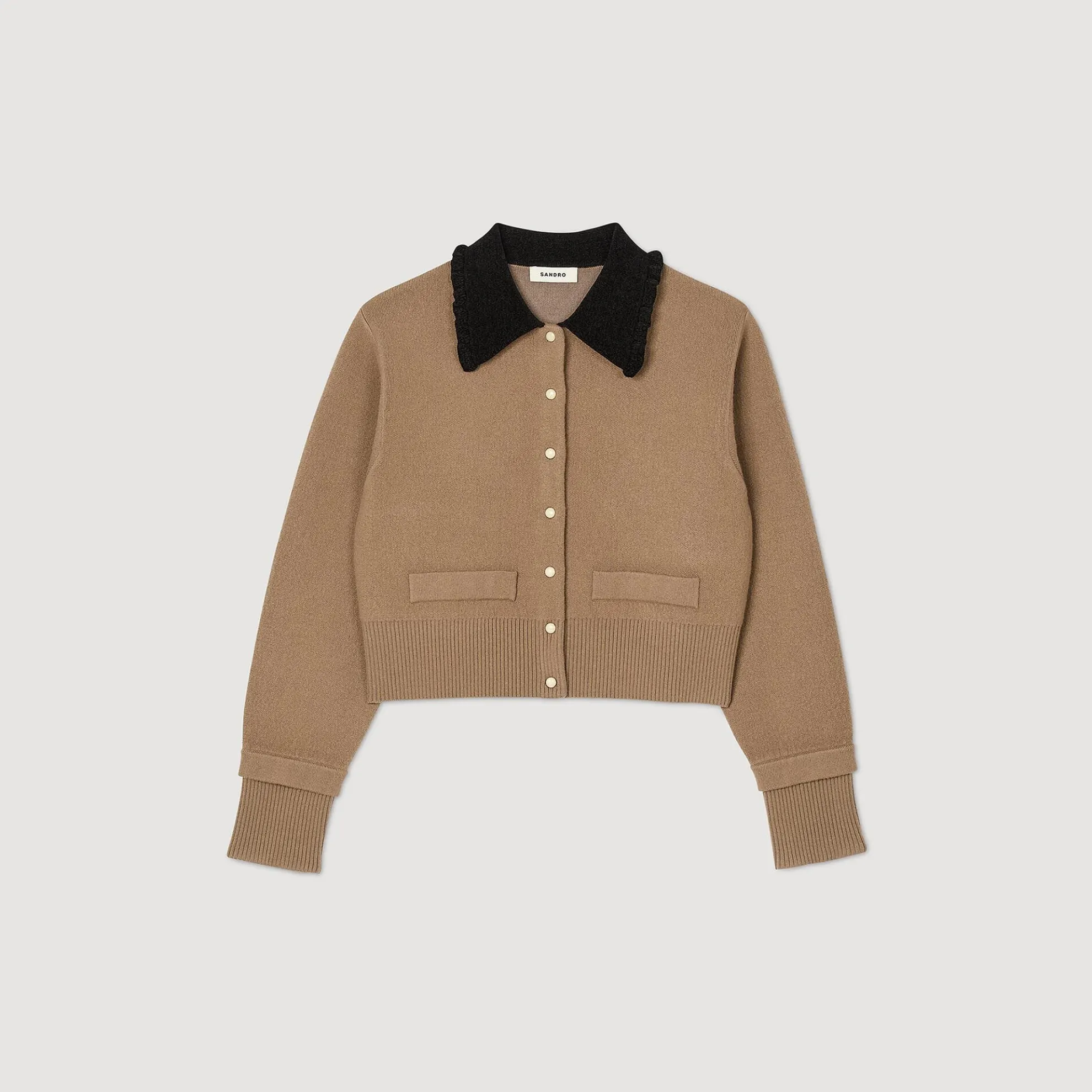Korte cardicoat in overhemdstijl met een contrasterende fluwelen kraag, lange mouwen en een knoopsluiting.