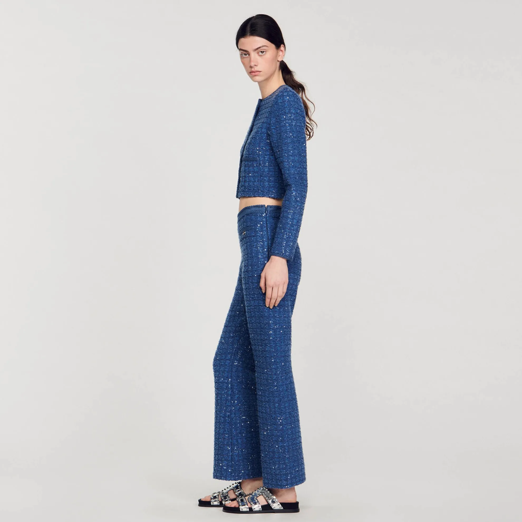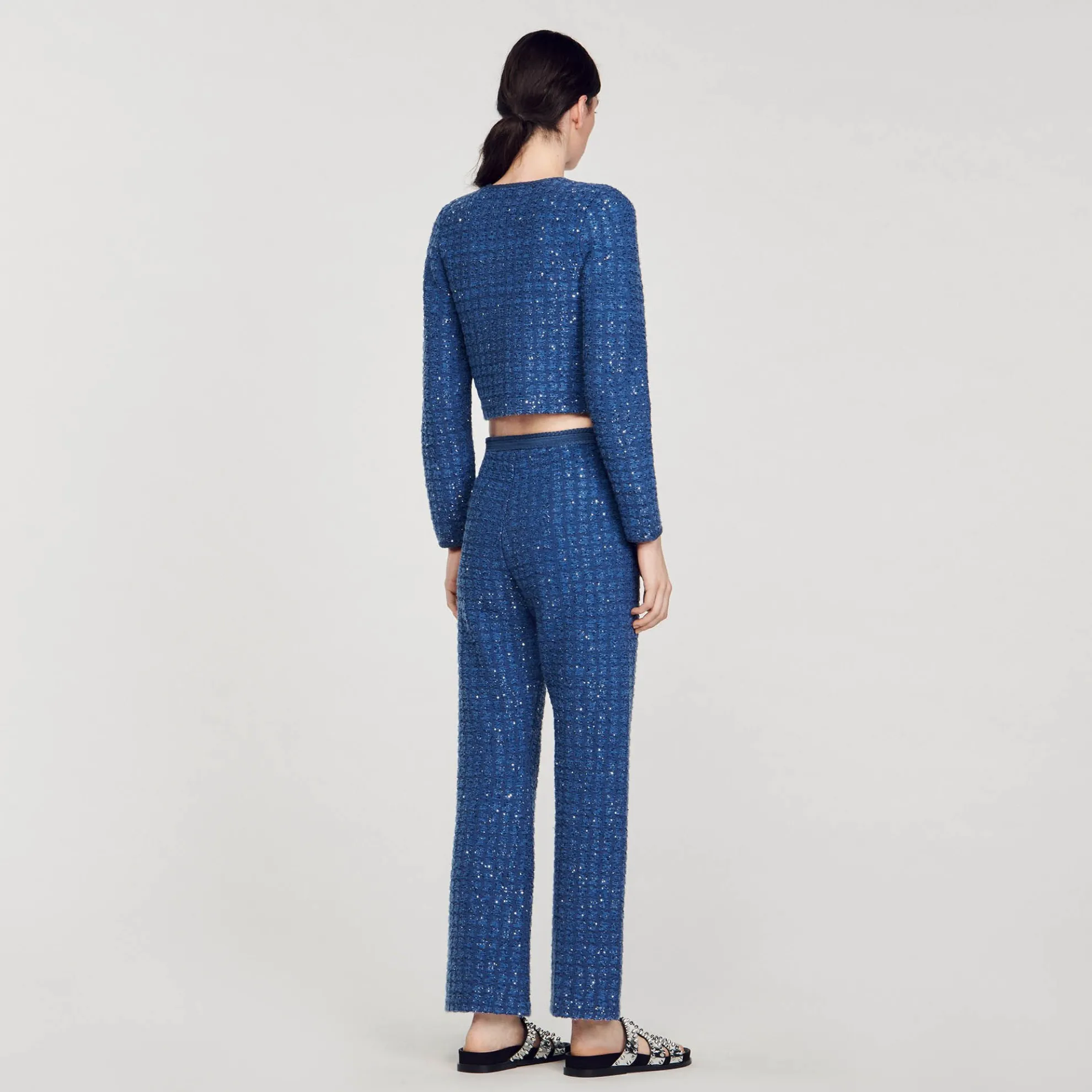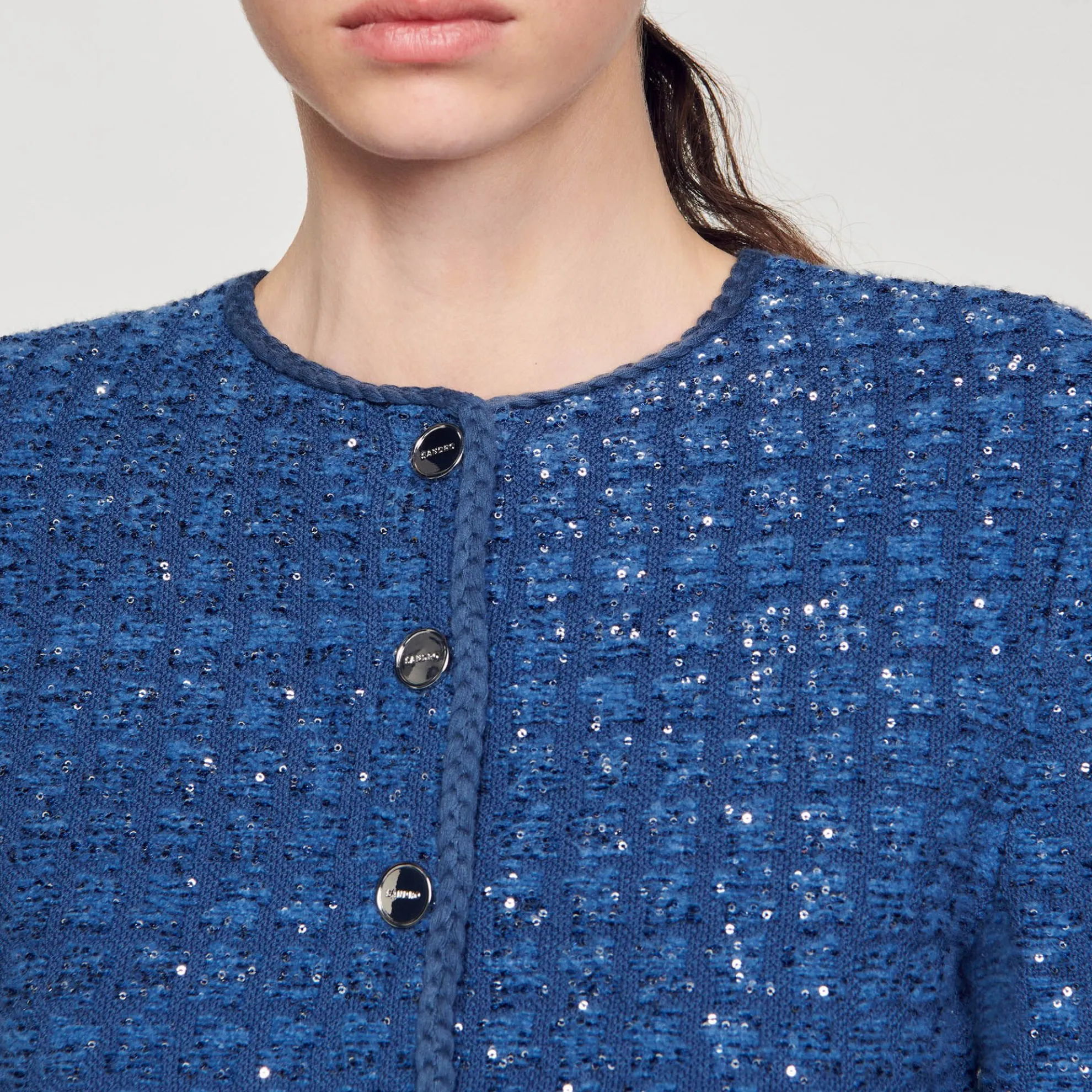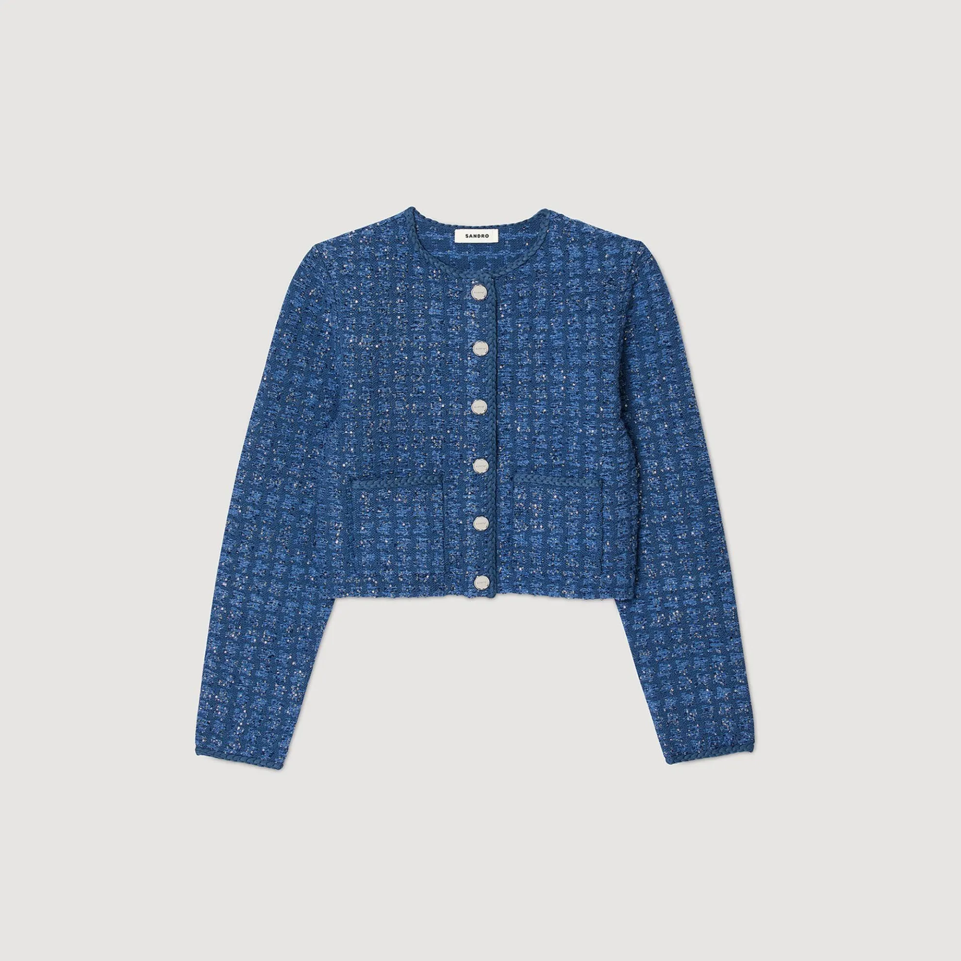 Korte cardicoat van mooi breiwerk met glinsterend tweed effect met knoopsluiting, gevlochten ribboorden en opgestikte zakken in de taille.
