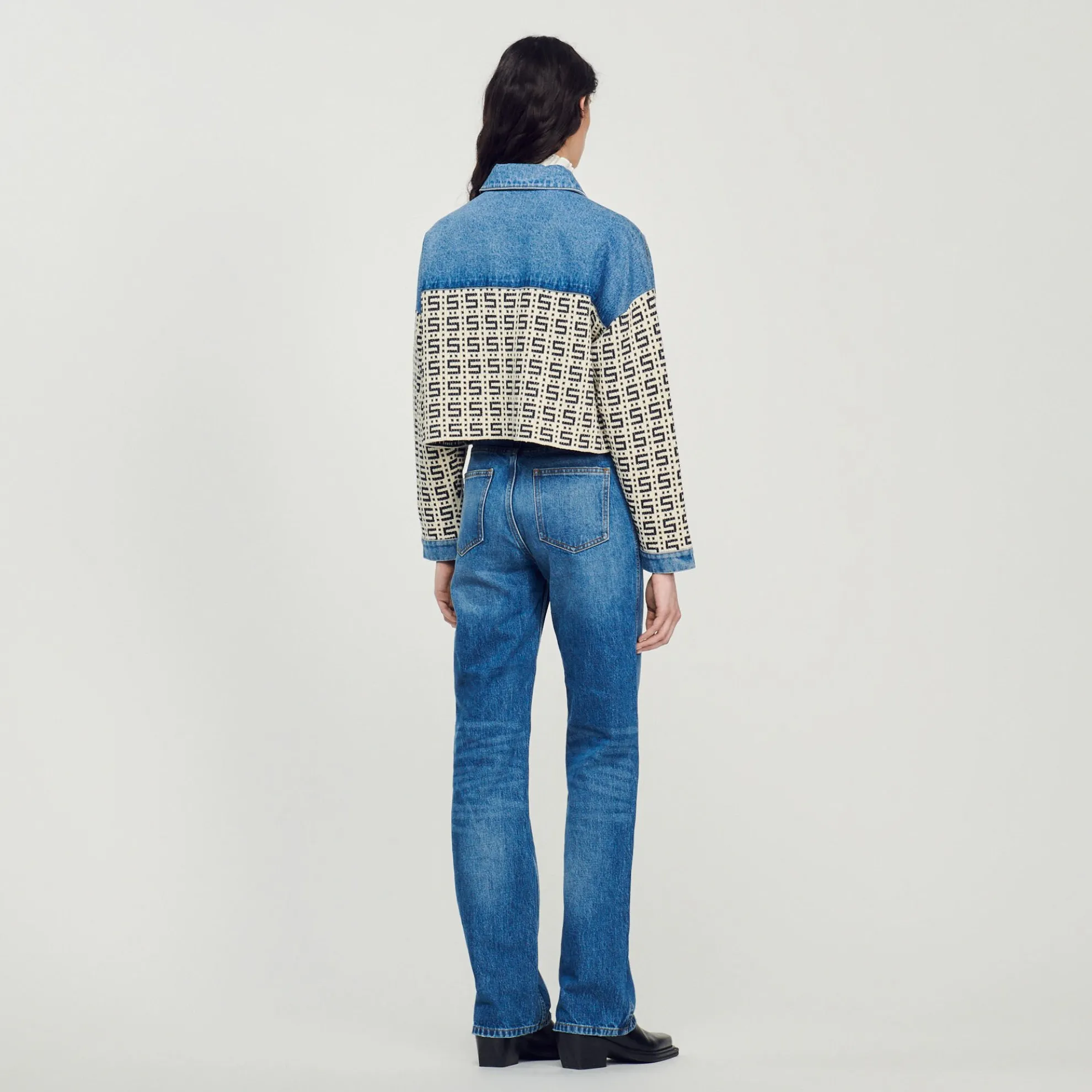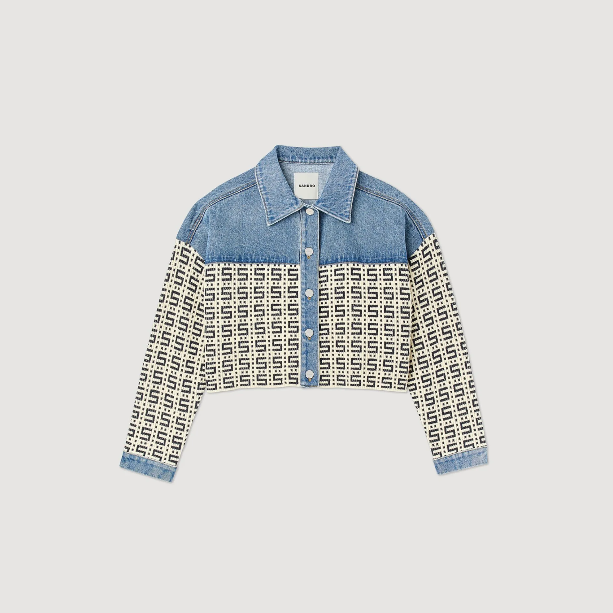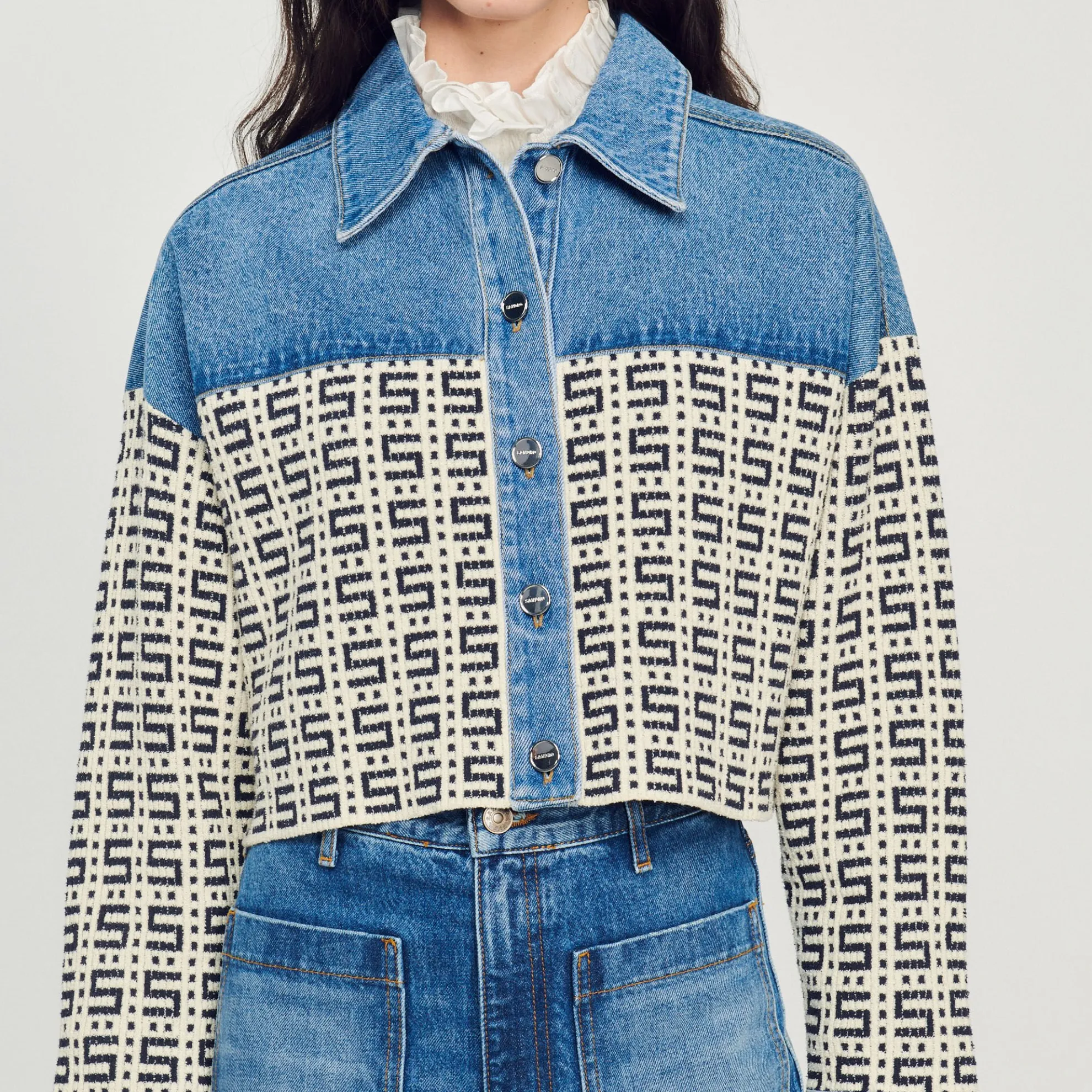 Korte cardicoat van denim en tricot met jacquard logo, lange mouwen en sluit met een knopenlijst middenvoor.