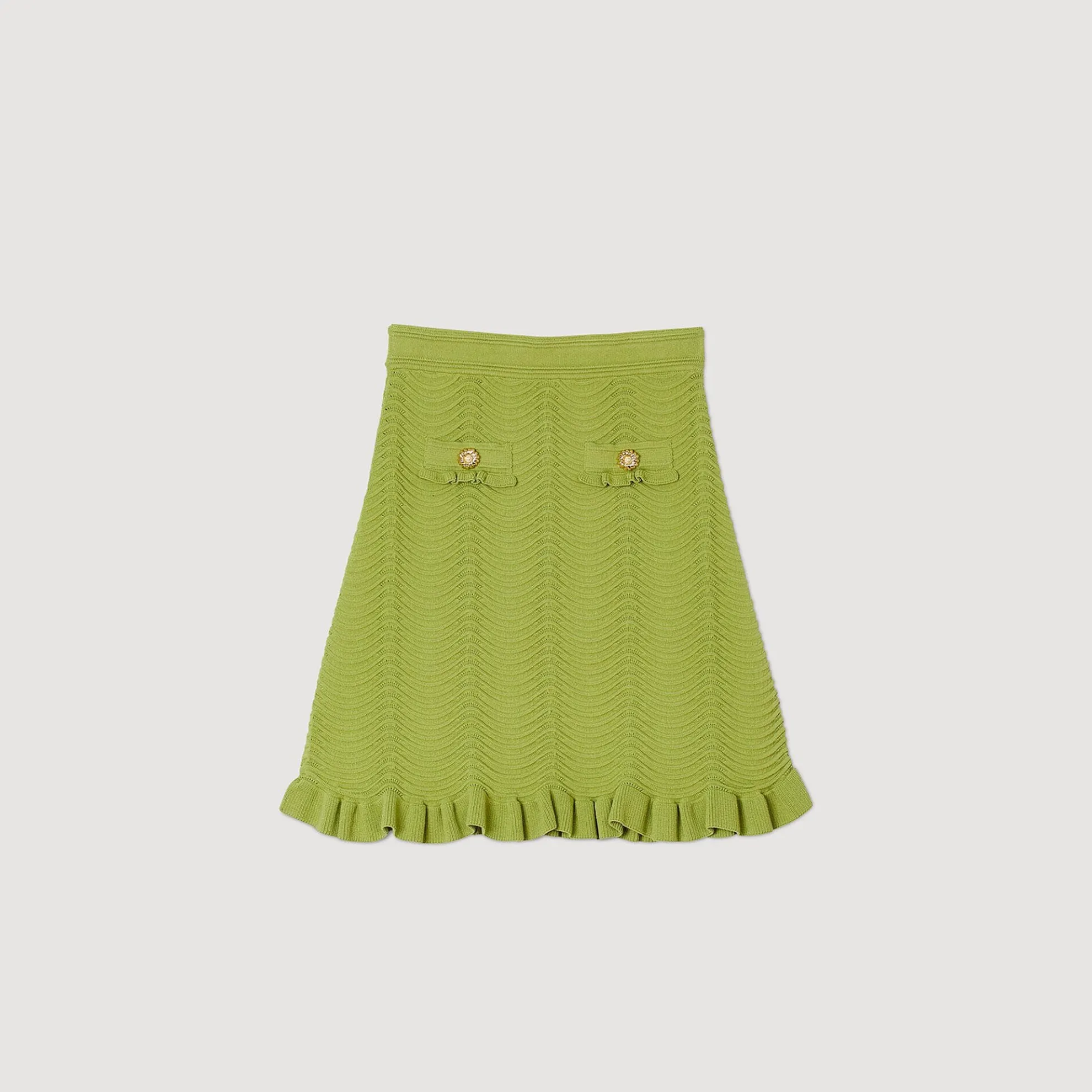 Korte uitlopende rok van gestructureerd breiwerk met een hoge taille, zakken met knoopsluiting en een zoom met ruches aan de onderkant.