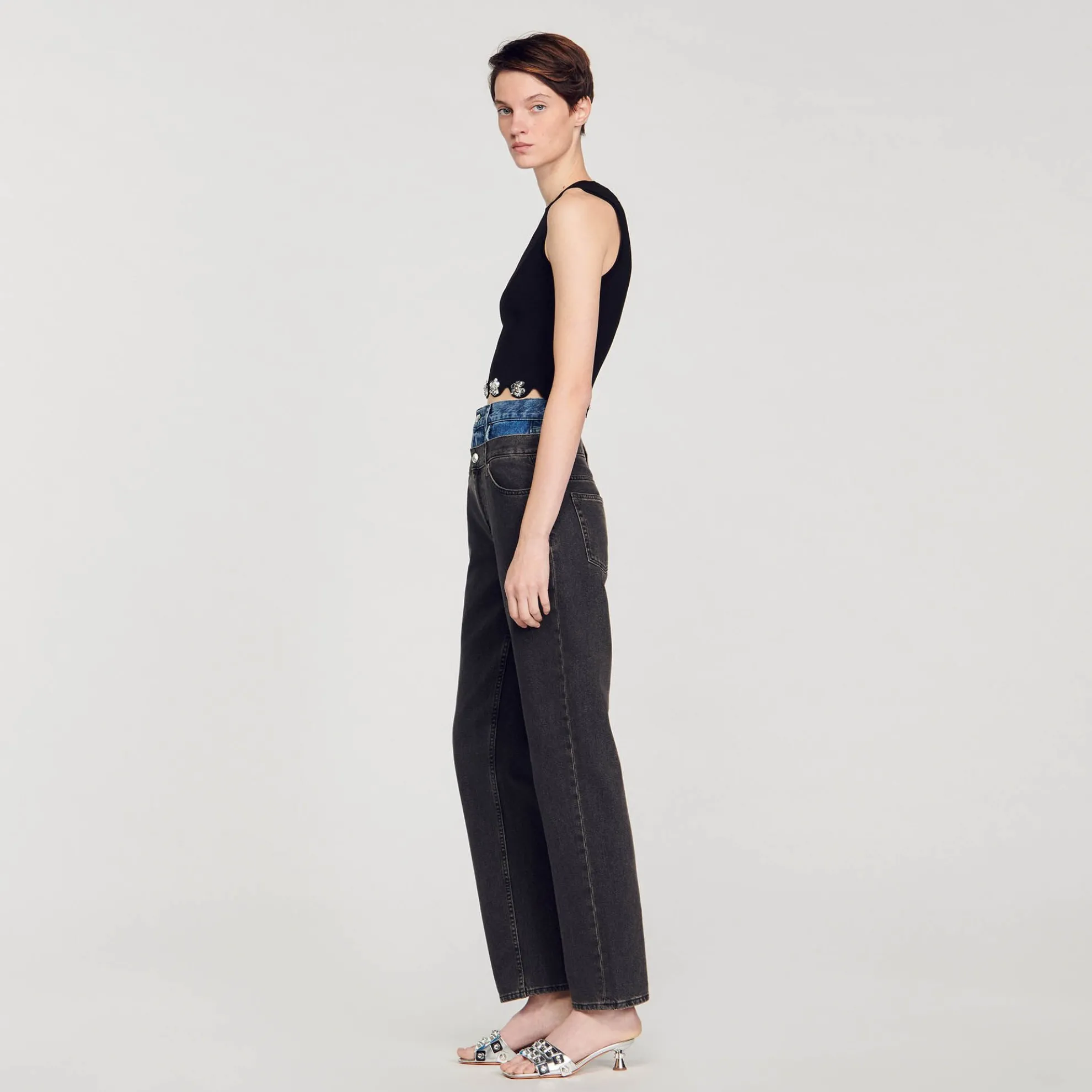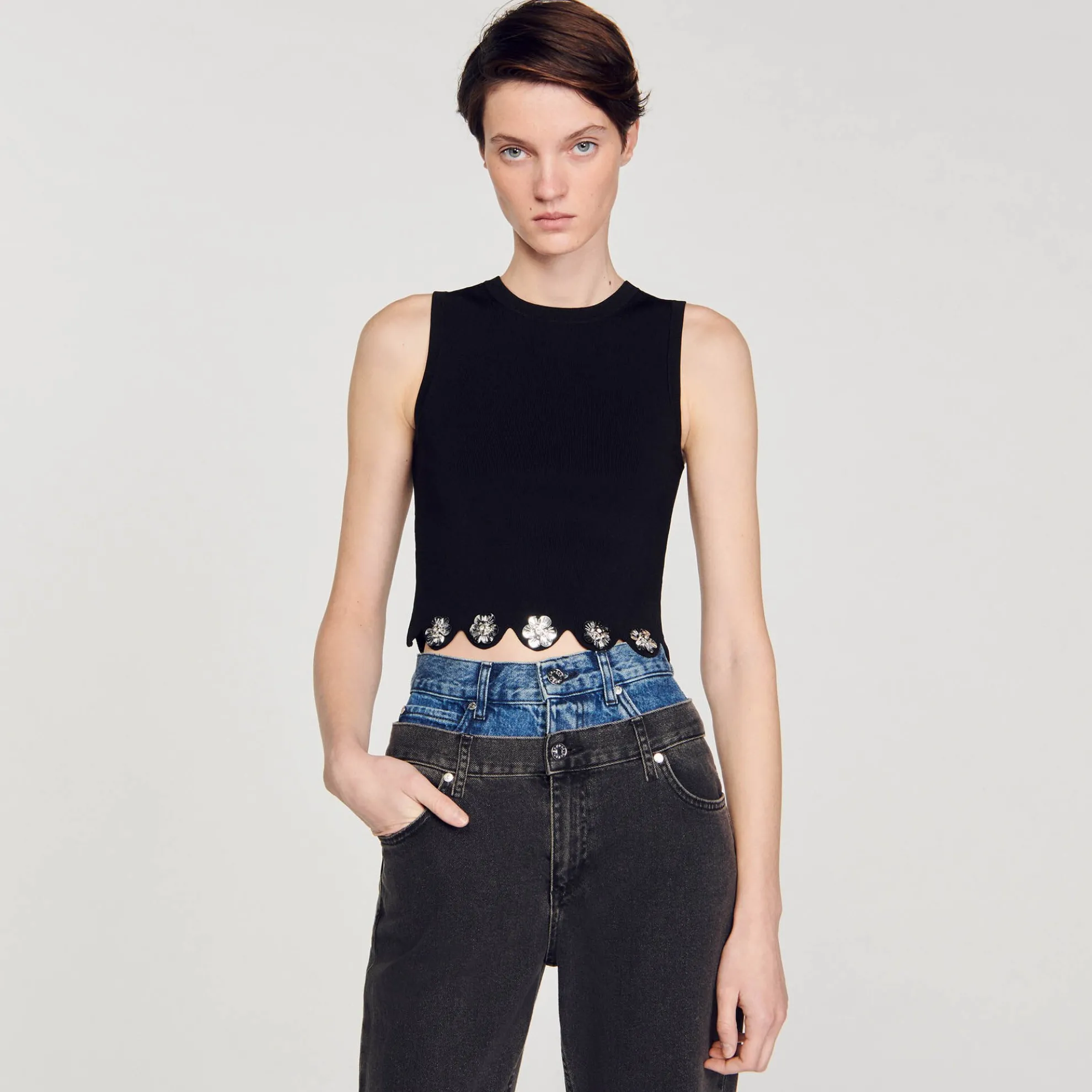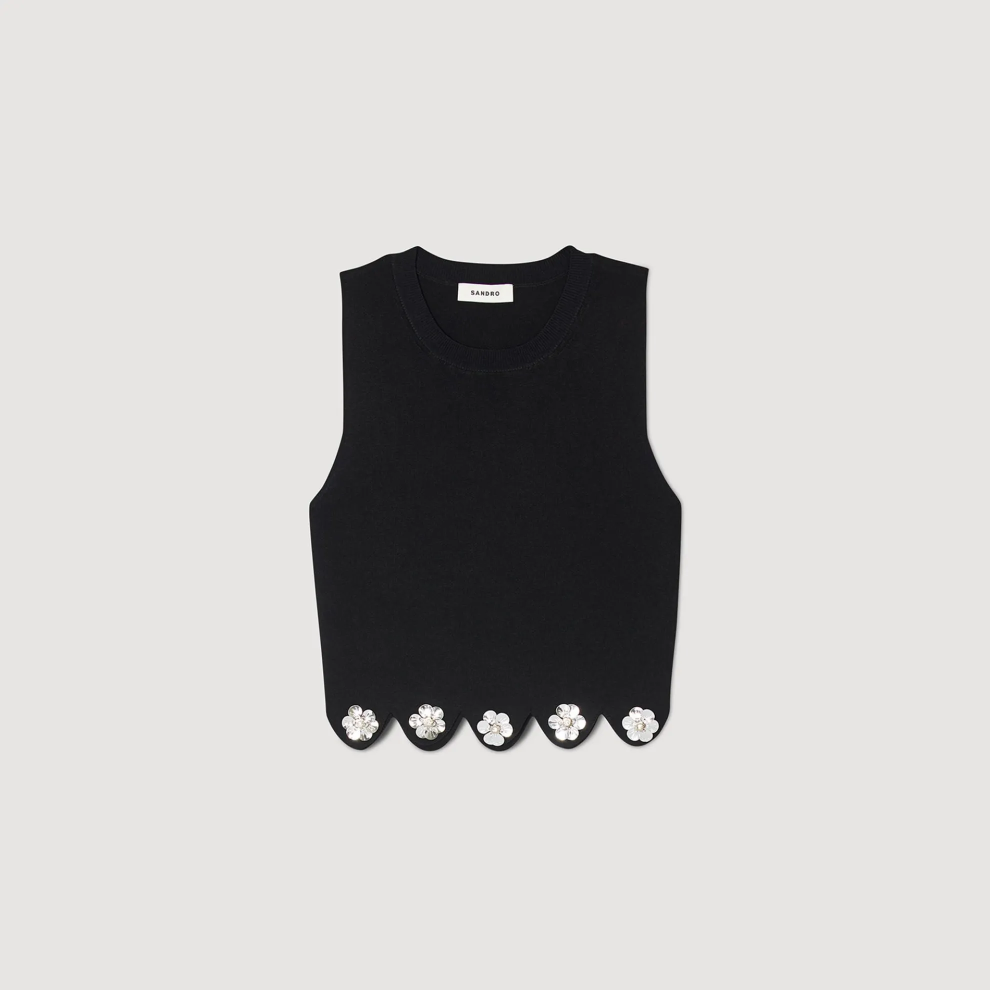 Korte mouwloze gebreide top met ronde hals en geschulpte zoom versierd met pailletten bloemen.