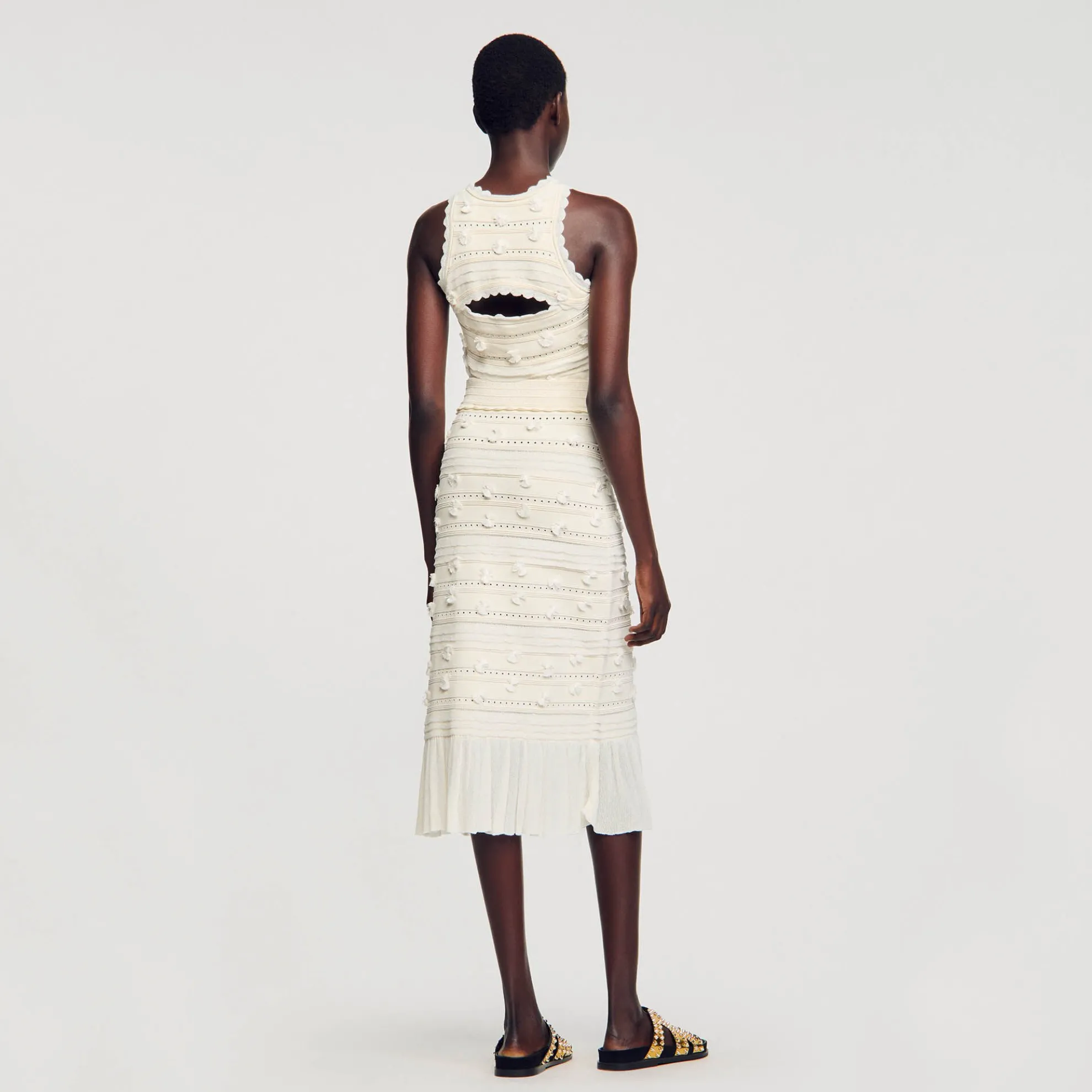 Korte top van opengewerkt breisel versierd met kleine ruches en kwastjes, armsgaten in Amerikaanse stijl en geribde boorden.