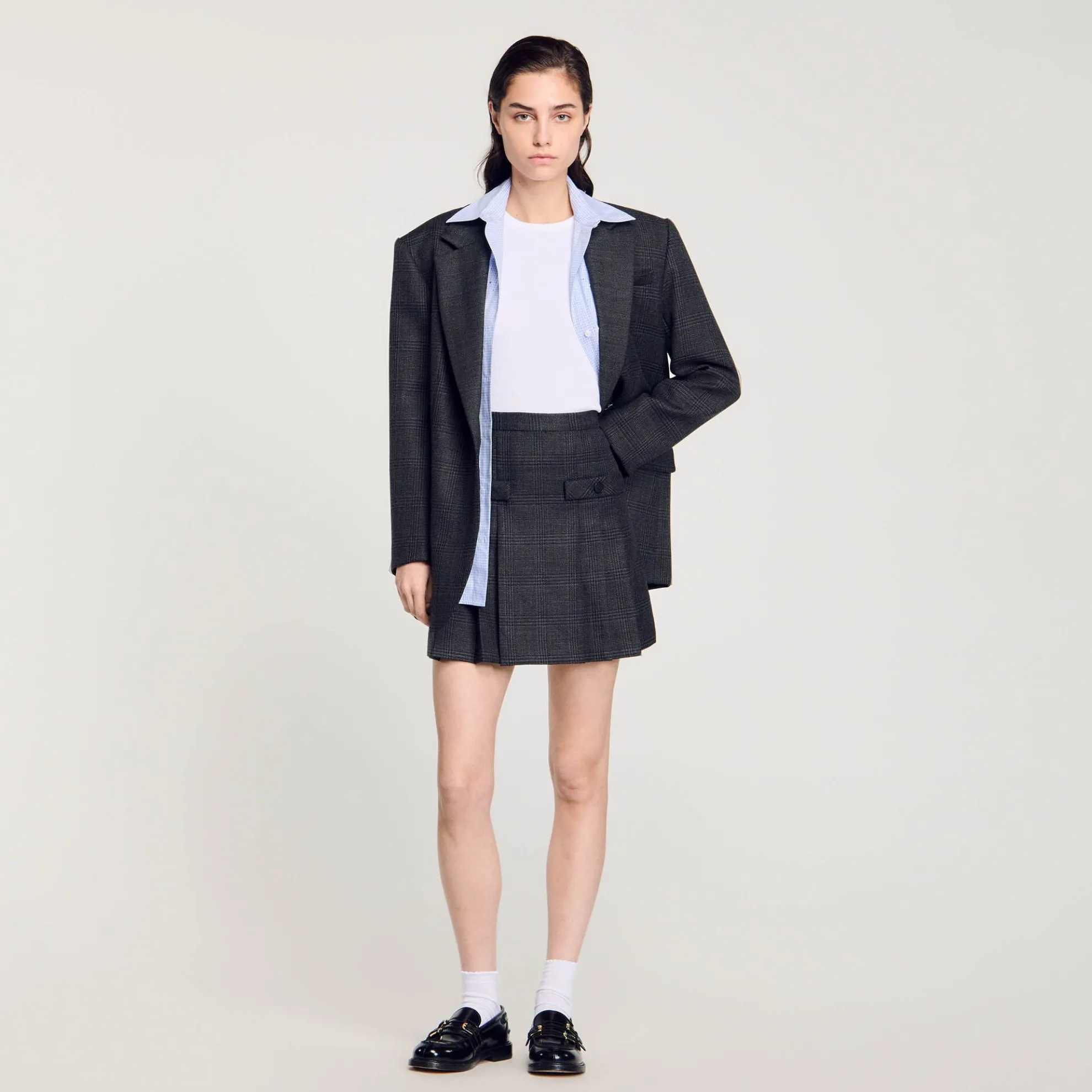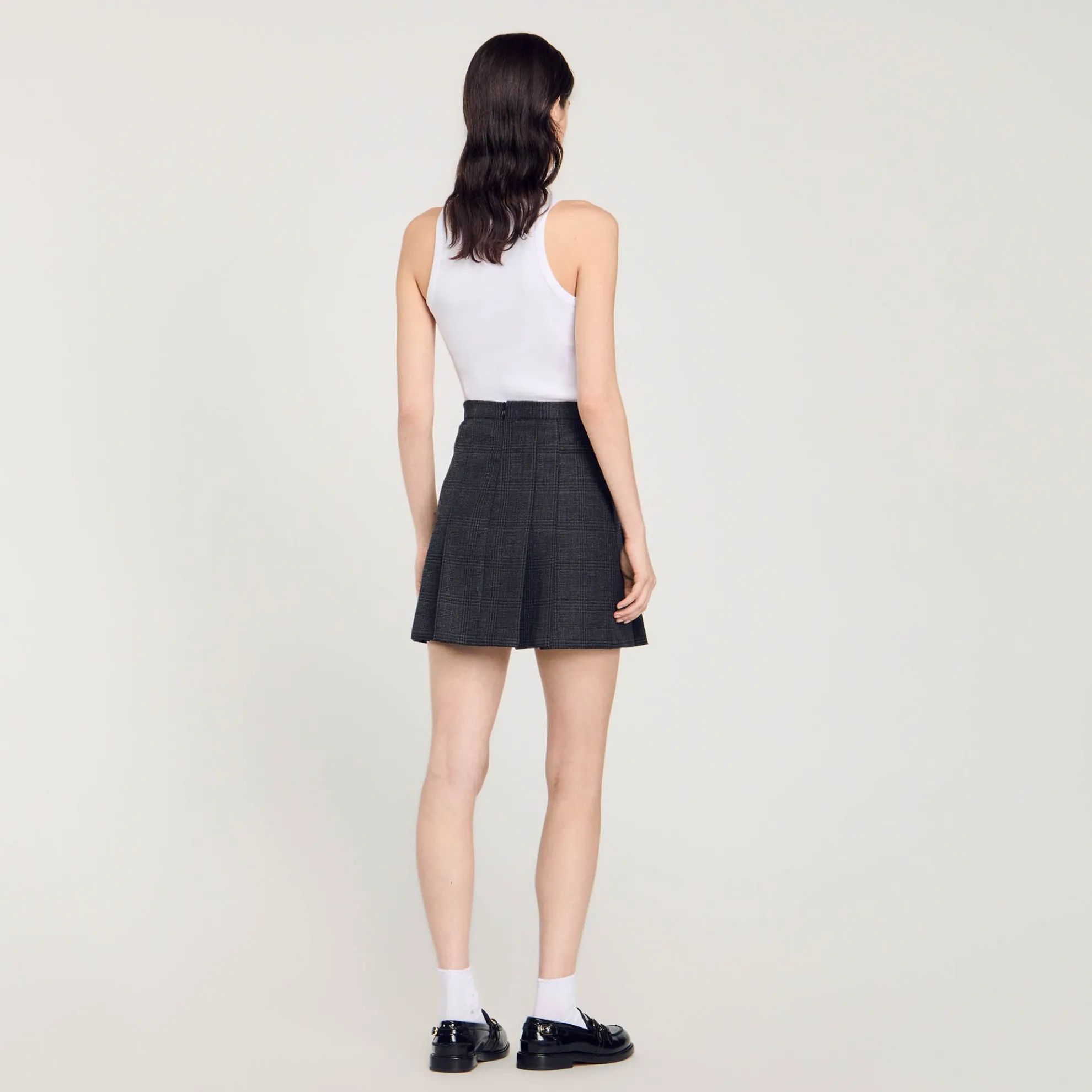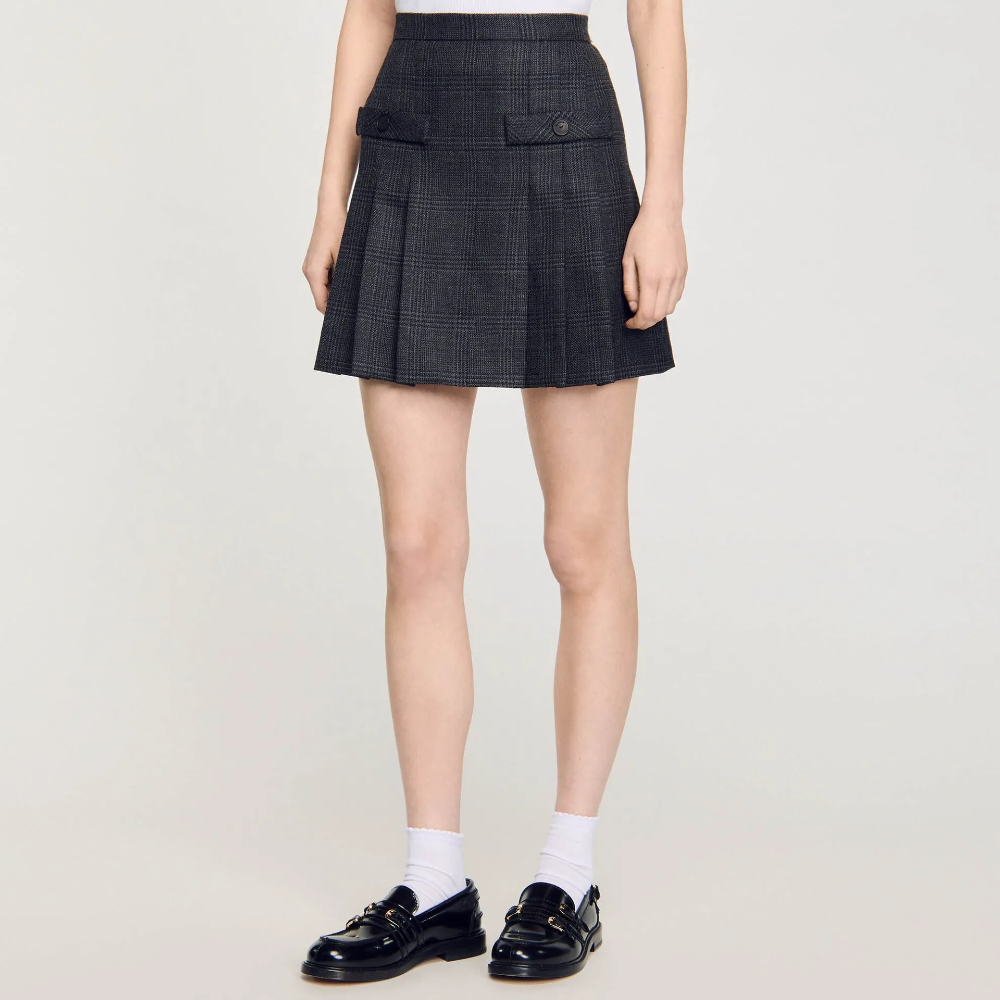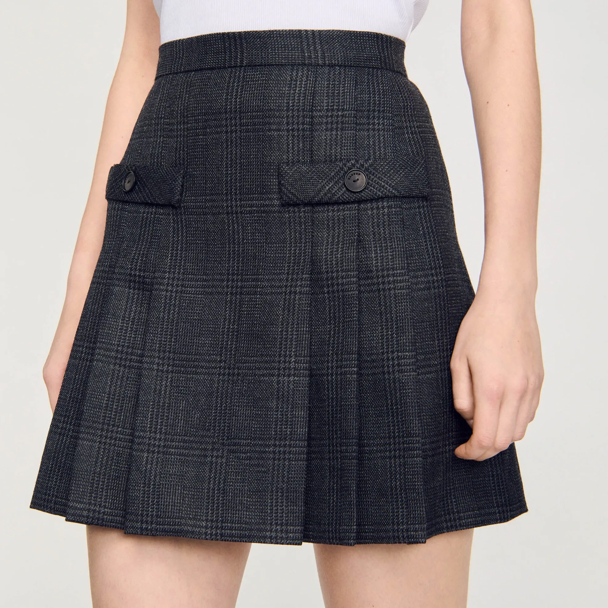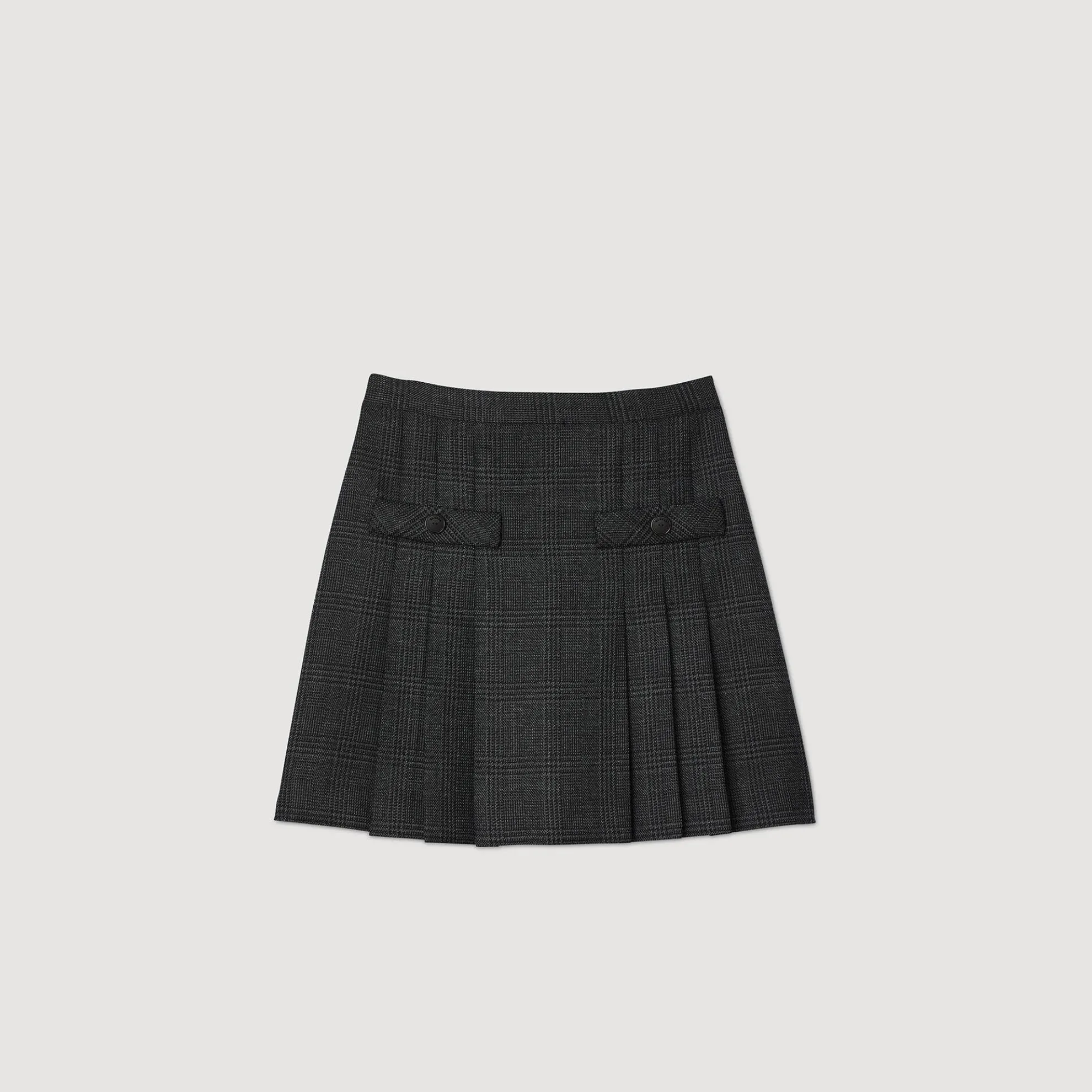 Korte geplooide ruitjesrok met paspelzakken met knopen.