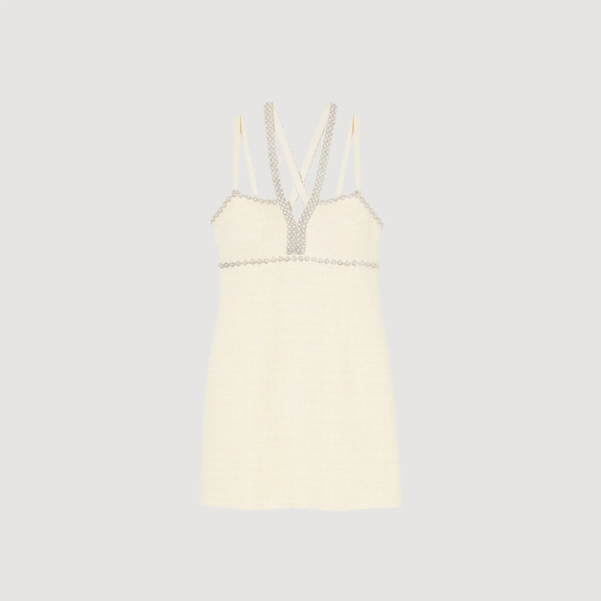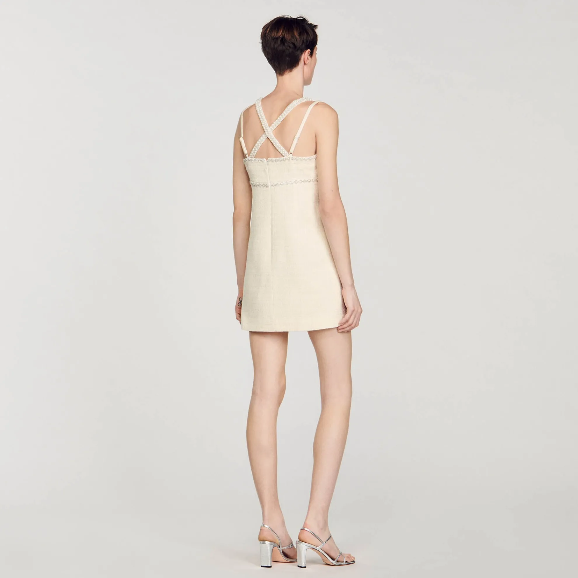 Korte jurk in effen tweed, met dubbele gekruiste bandjes op de rug en een bustier versierd met parels.