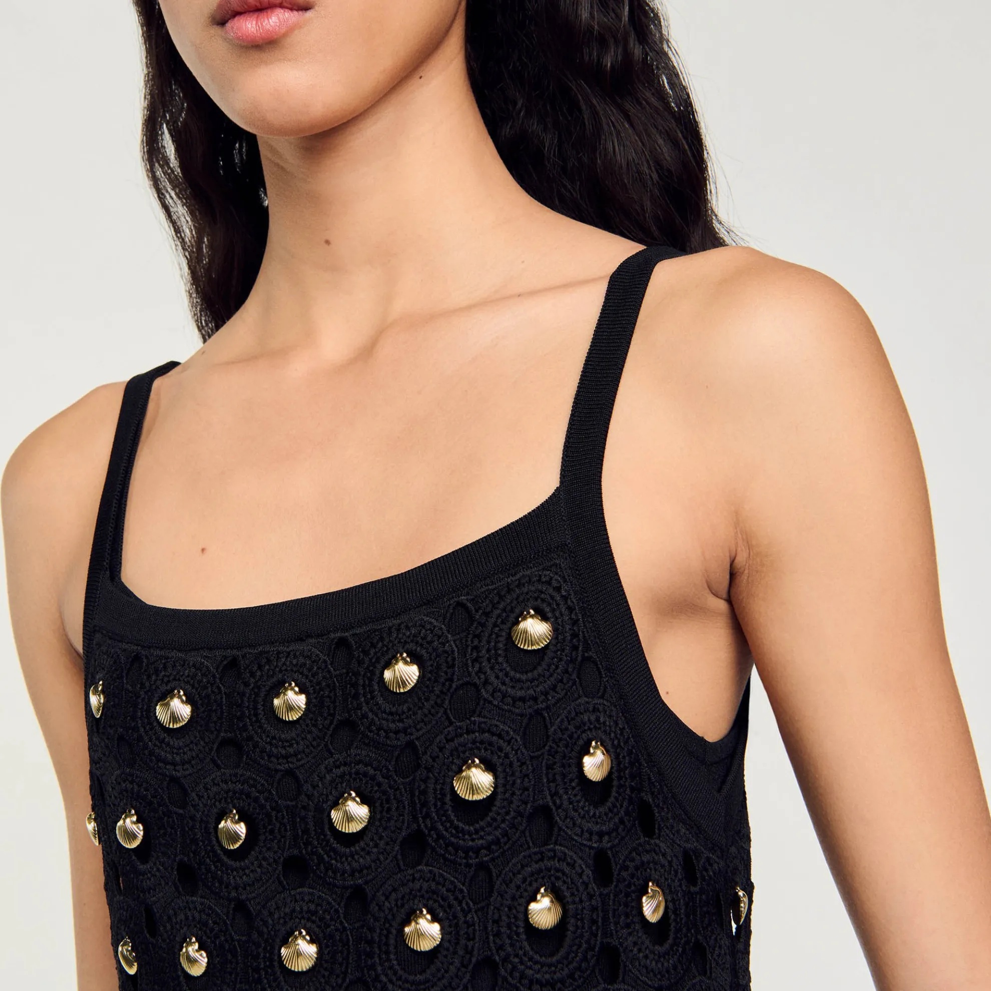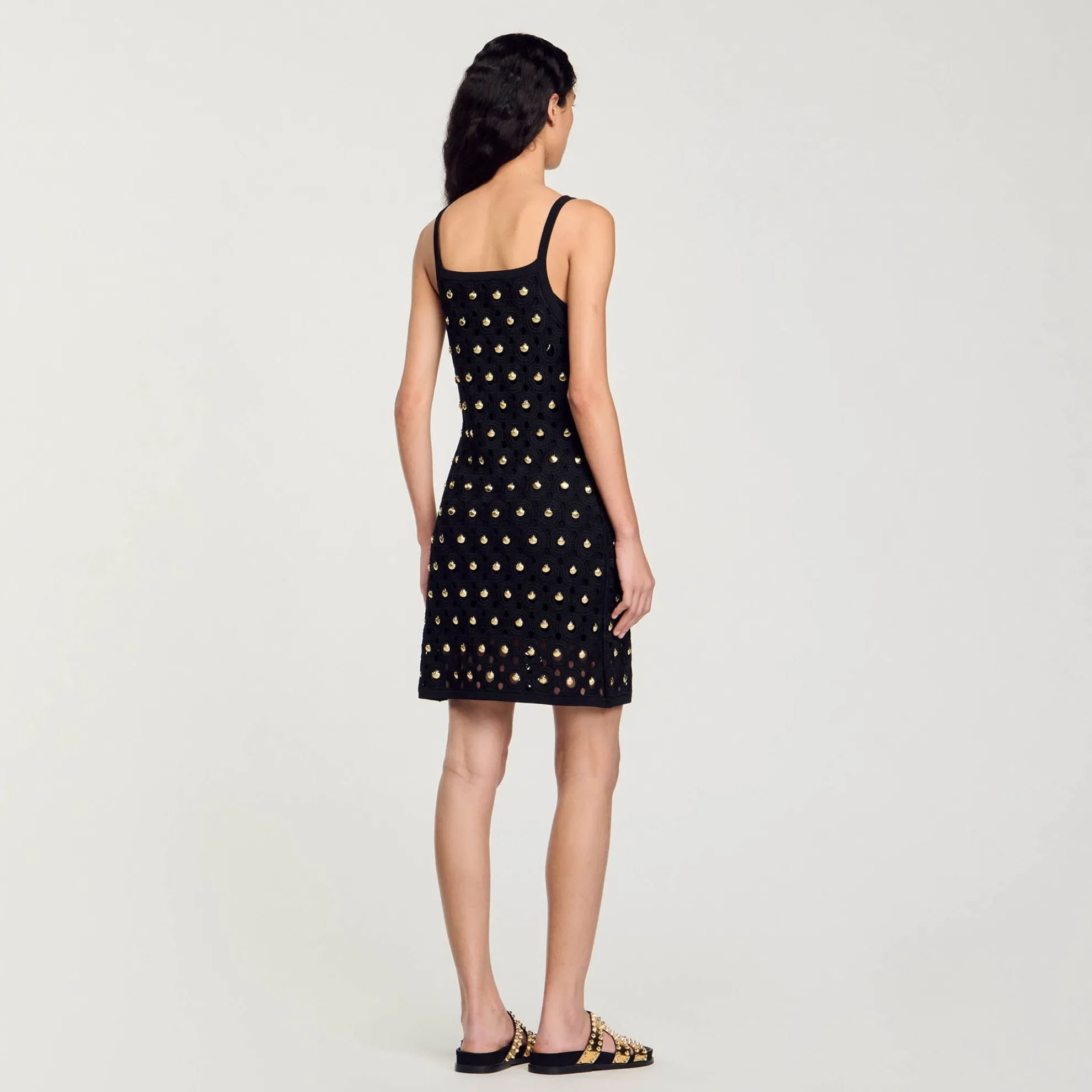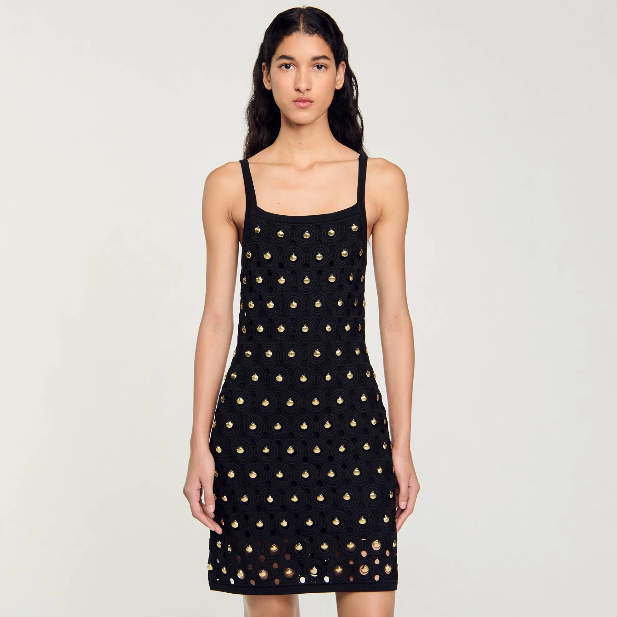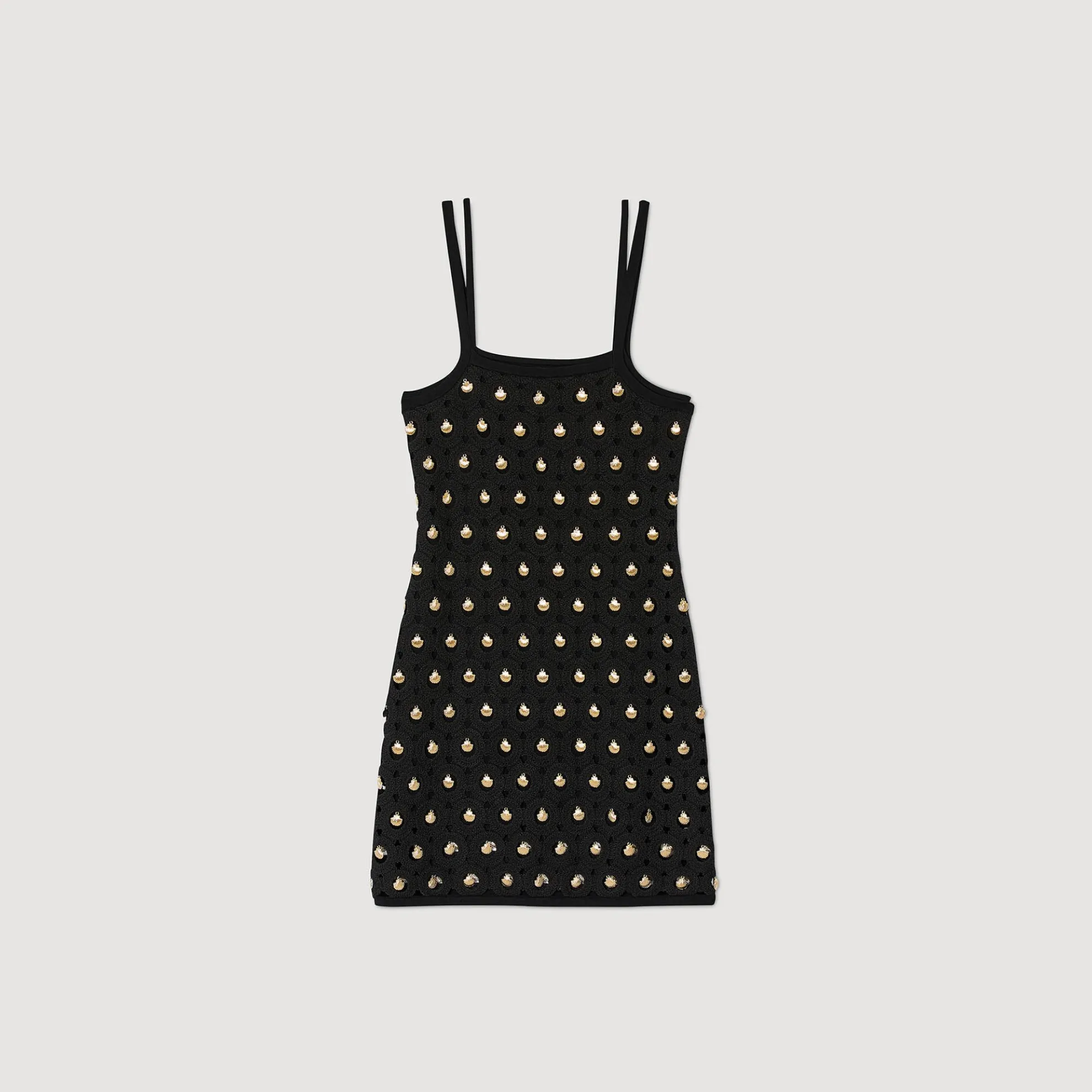 Korte jurk van geborduurd mesh met dunne schouderbandjes en met de hand gemaakte goudkleurige metalen schelpvormige kwastjes.