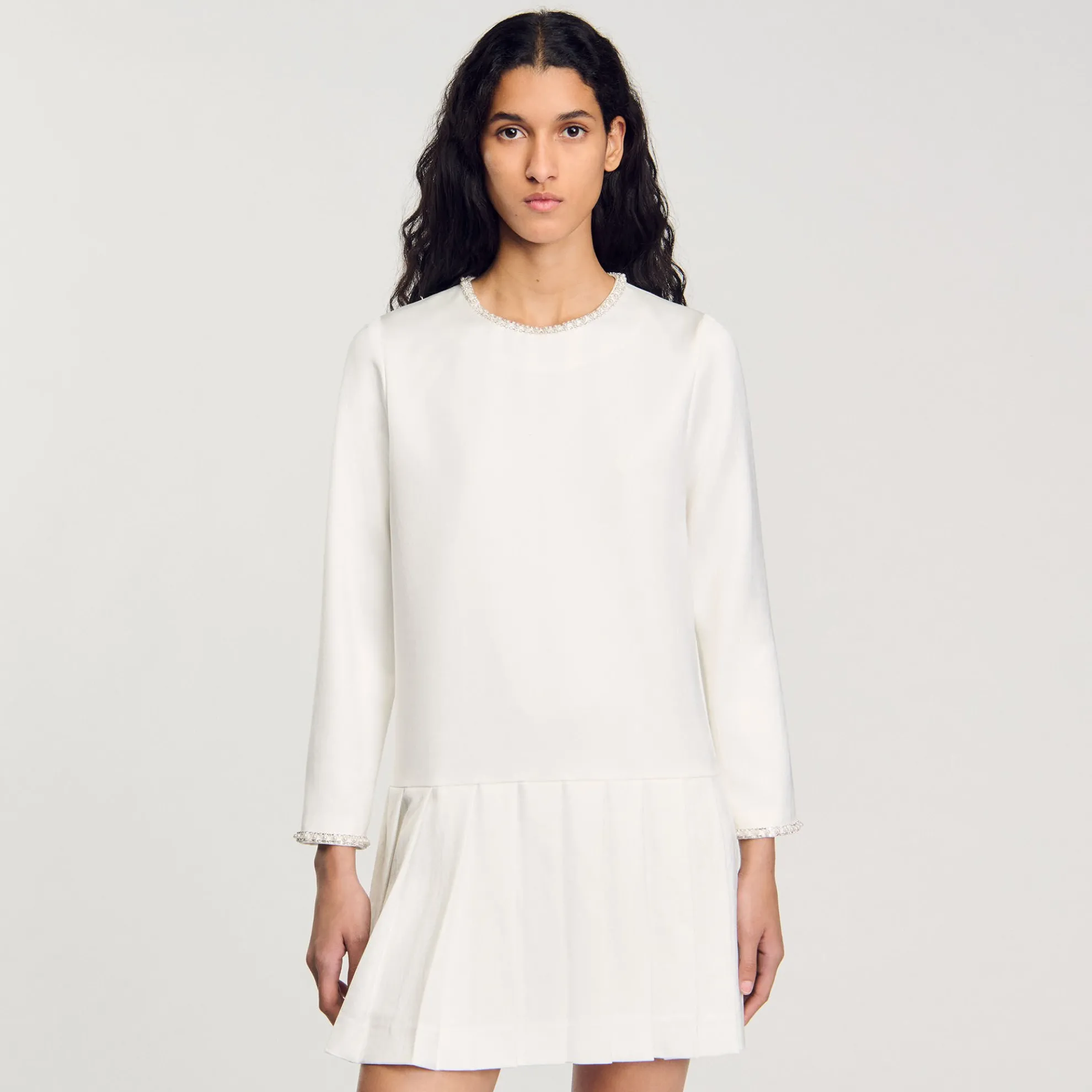 Korte, satijnen jurk met een ronde halslijn versierd met parels, lange mouwen en een geplooid rokgedeelte.