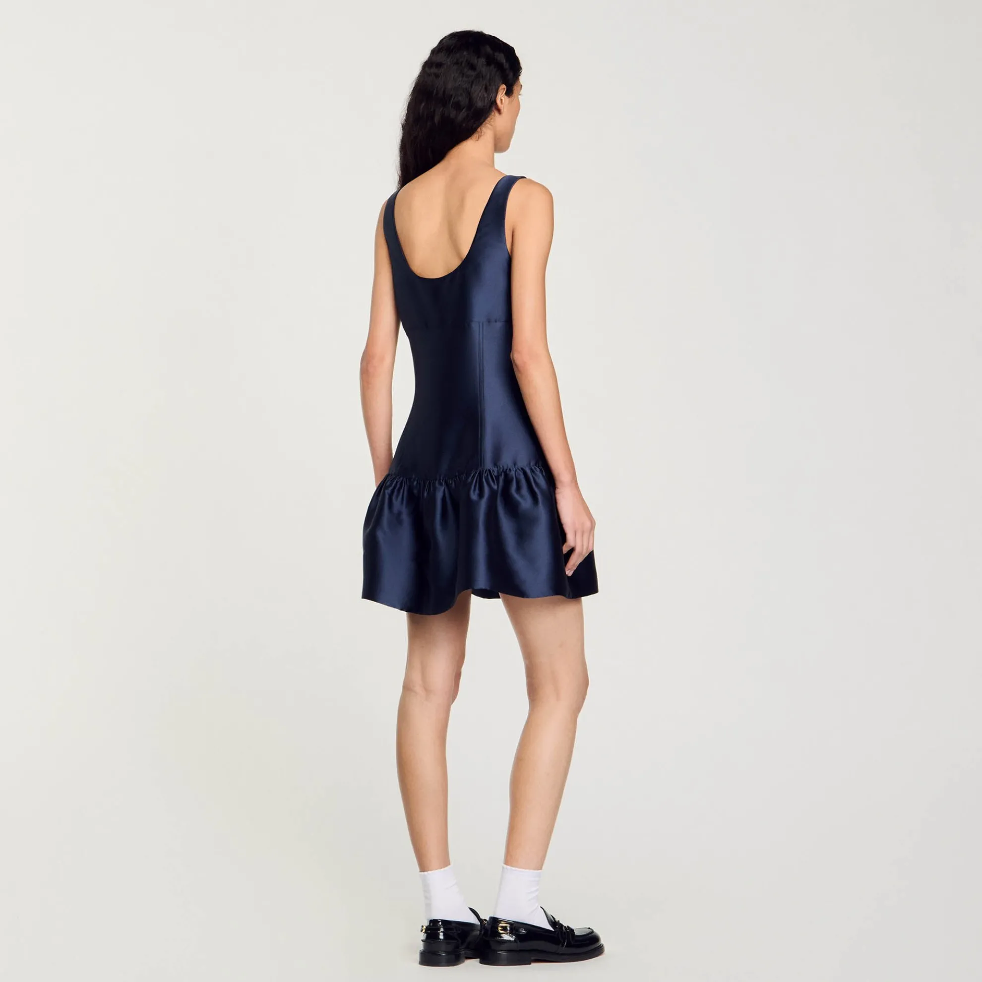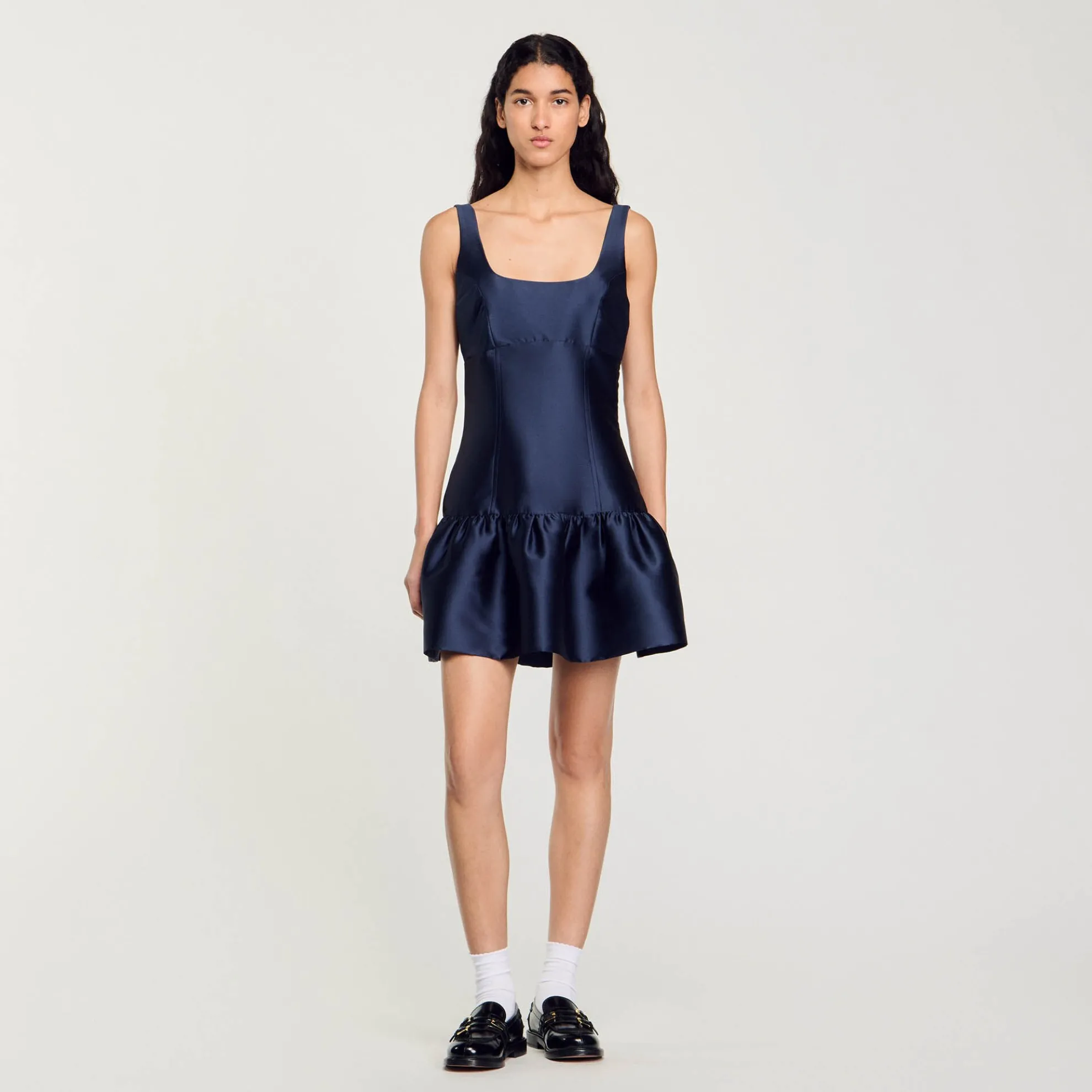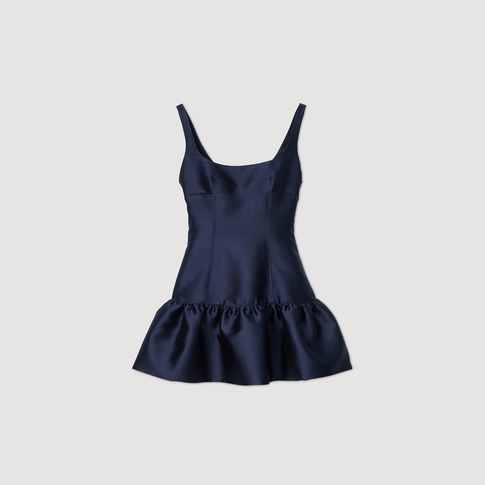 Korte jurk van zware satijnen stof met schouderbandjes, een aan de voorkant afgeronde vierkante halslijn en een volumineuze rok aan de onderkant.