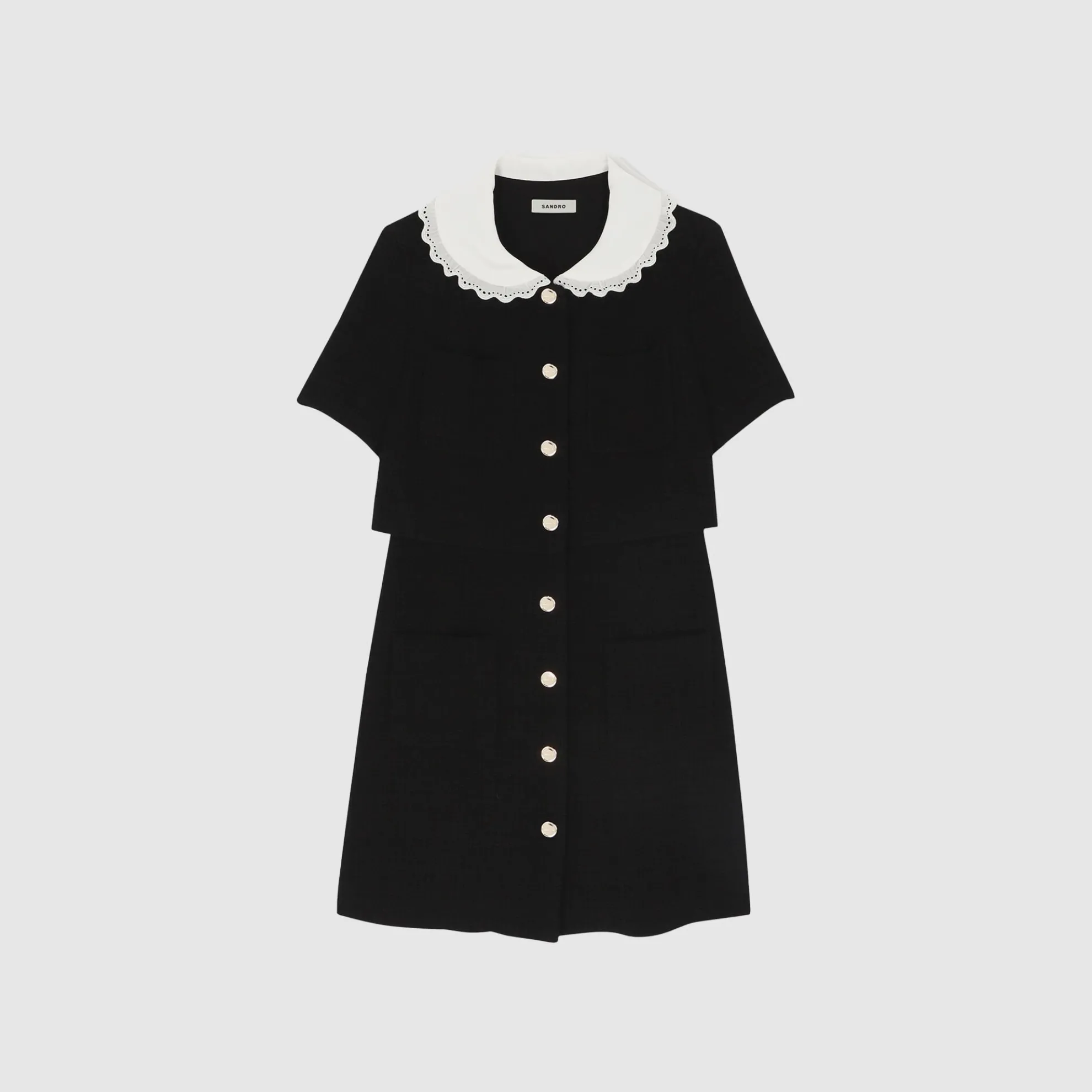 Damesjurk Sandro • Korte jurk van tweed • Trompe l’oeil jurk • Contrasterende Claudine-kraag met een bies op de rand • Opent aan de voorkant met een knopenlijst • Opgestikte borstzakken en zakken op de rok • Korte mouwen • Gevoerde jurk Het katoen in dit model is biologisch geteeld, waarbij geen pesticiden mogen worden gebruikt, de biodiversiteit behouden blijft en GGO’s verboden zijn. Sandro zet zich in voor een meer verantwoorde mode. In het kader van ons traceerbaarheidsproject dat we in samenwerking met Fairly Made toepassen, maken wij informatie bekend over de herkomst, de fabricage en de milieu-impact van onze kleding. De volledige fabricage en verwerking van deze jurk zijn uitgevoerd in Bulgarije, voornamelijk met biologisch katoen dat is geteeld in Griekenland.