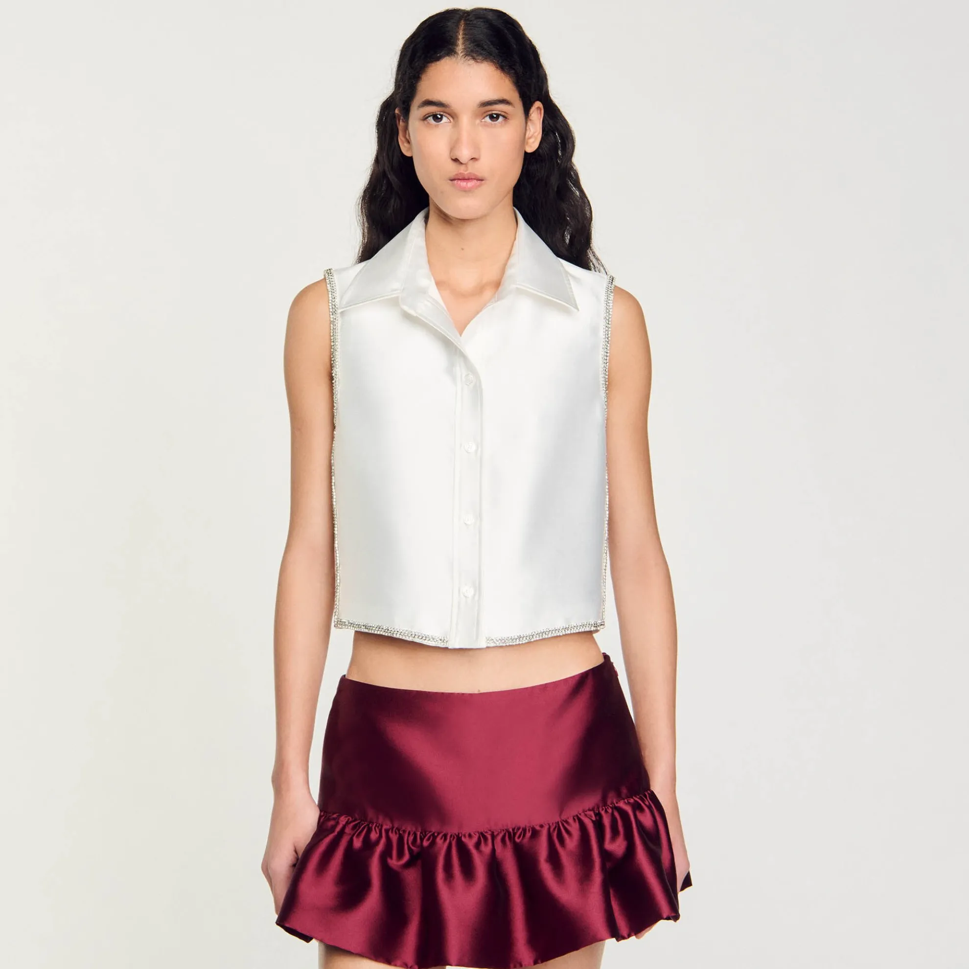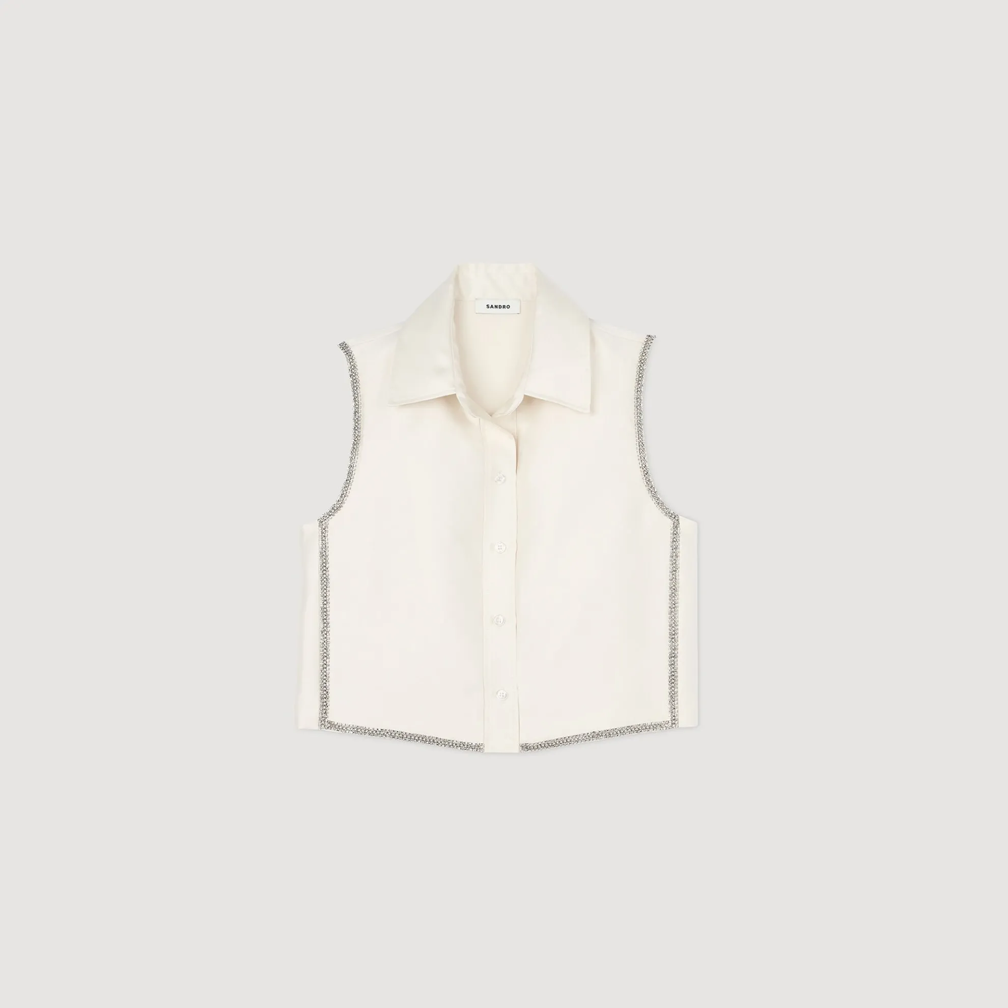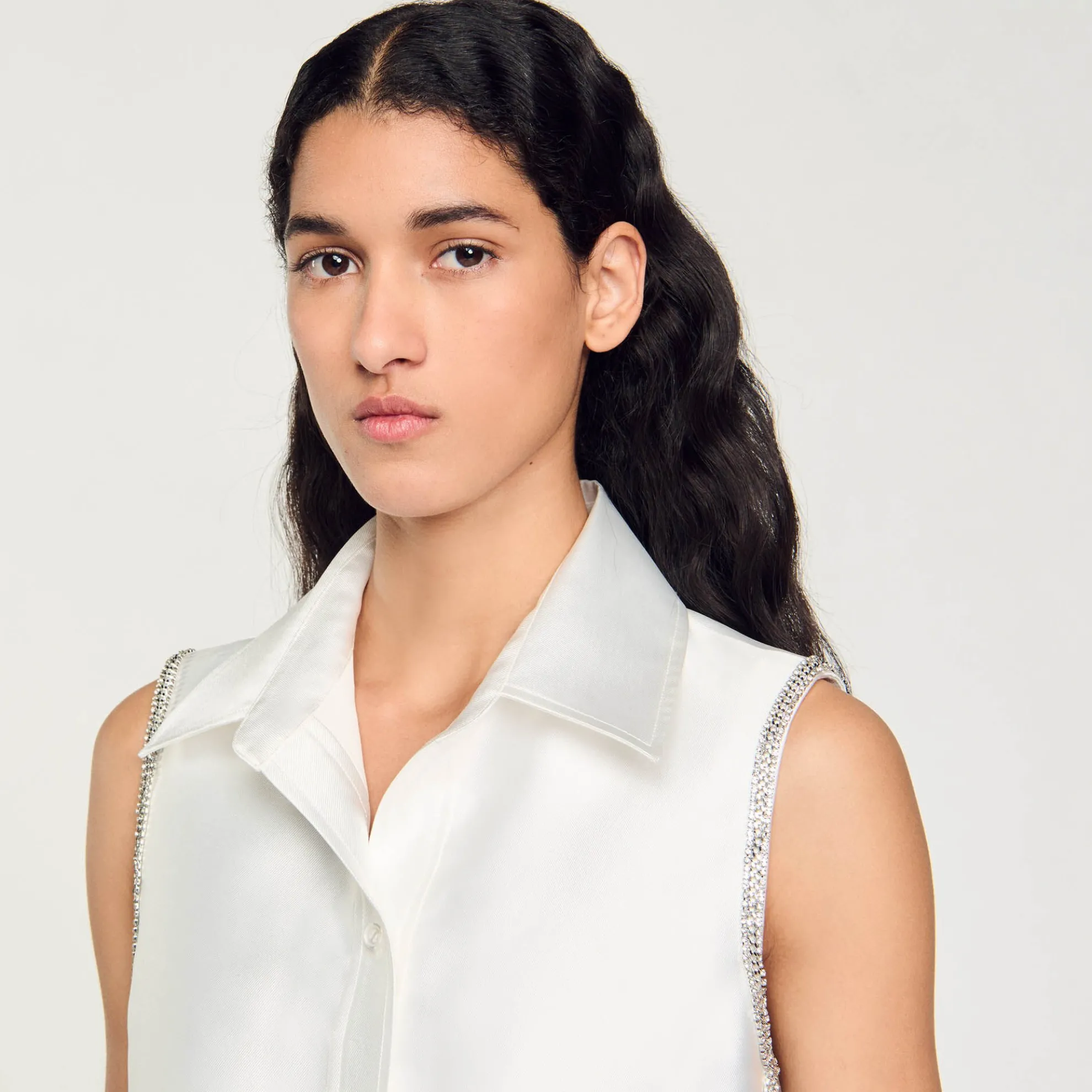 Korte mouwloze overhemdblouse van zwaar satijn met klassieke overhemdkraag, knoopsluiting en galon met stras.