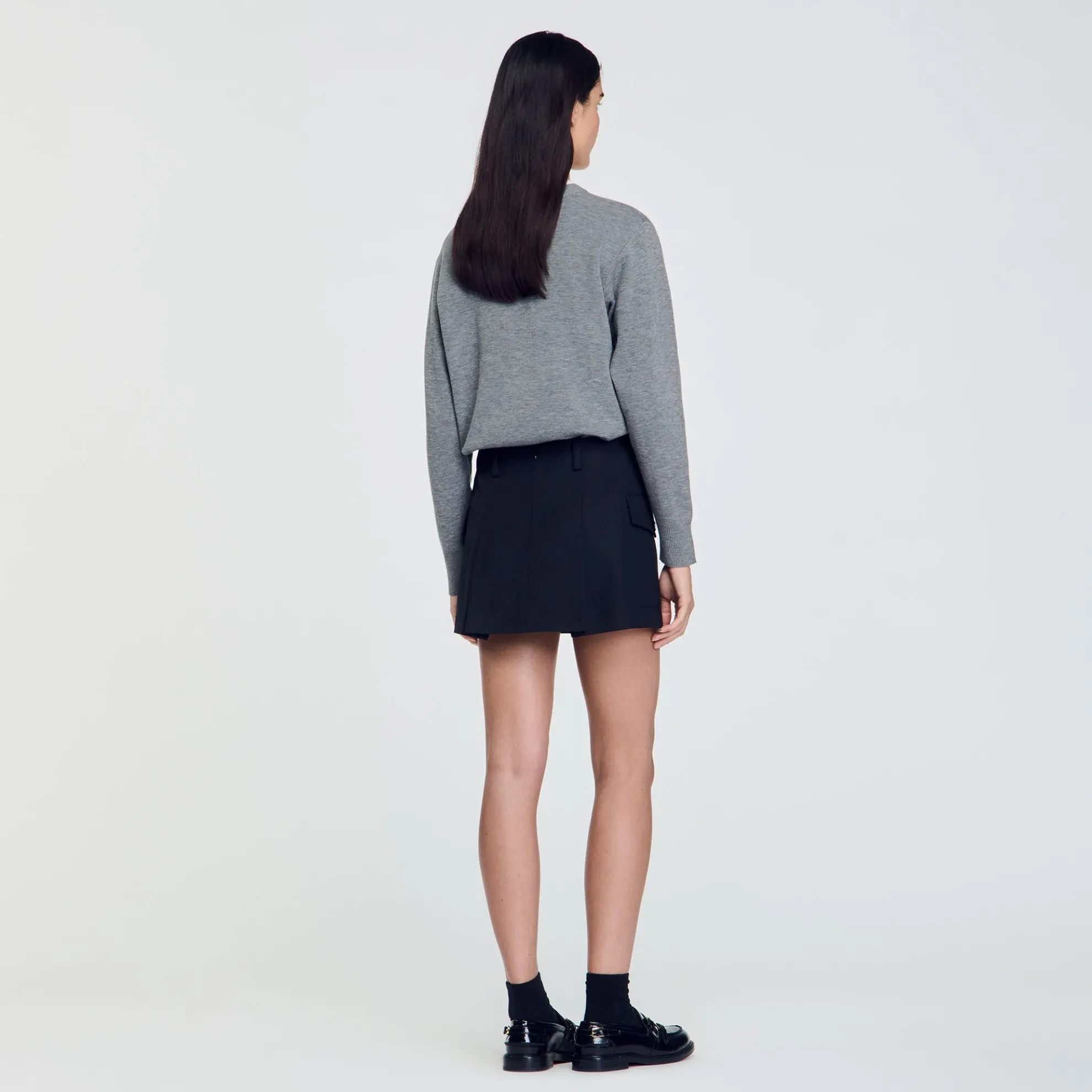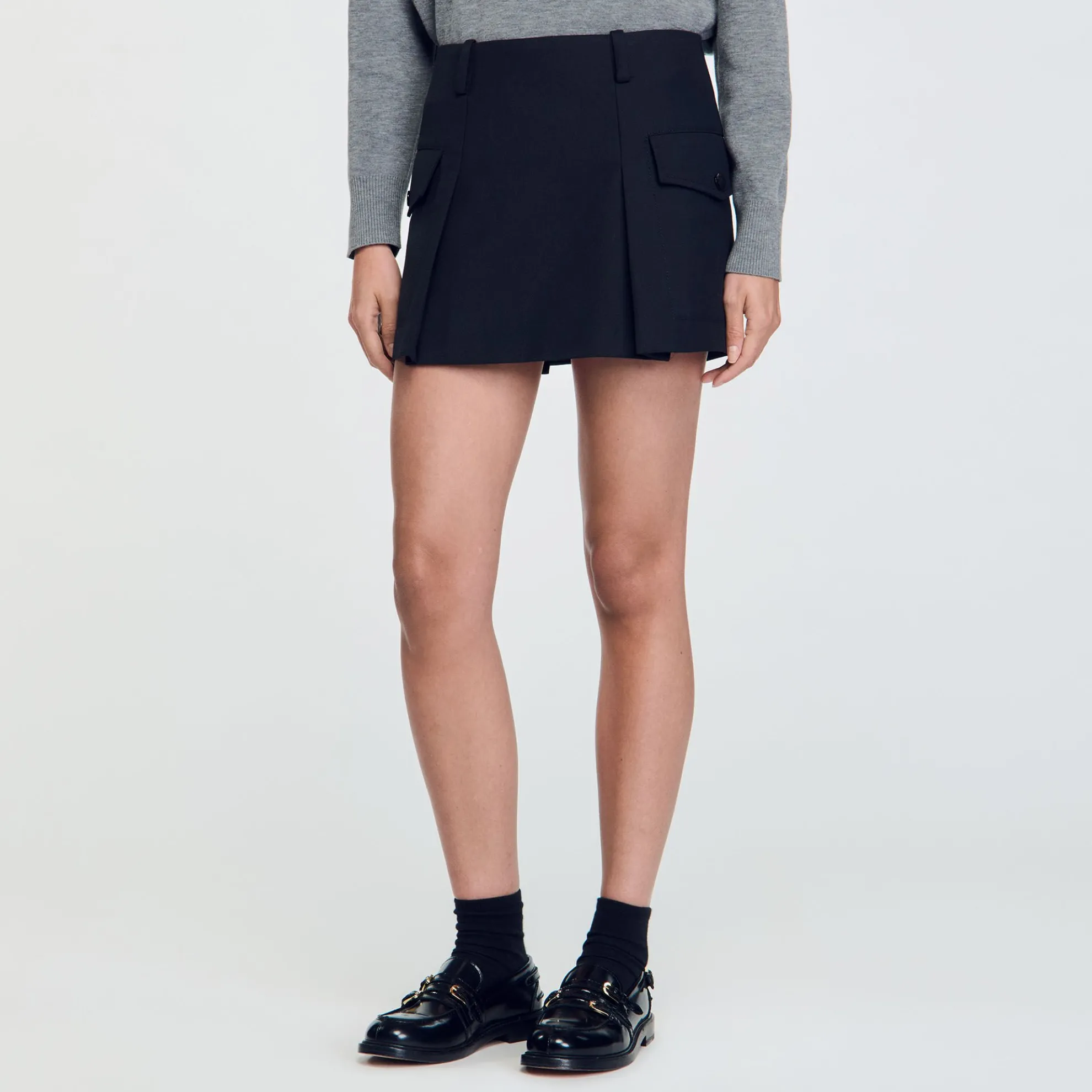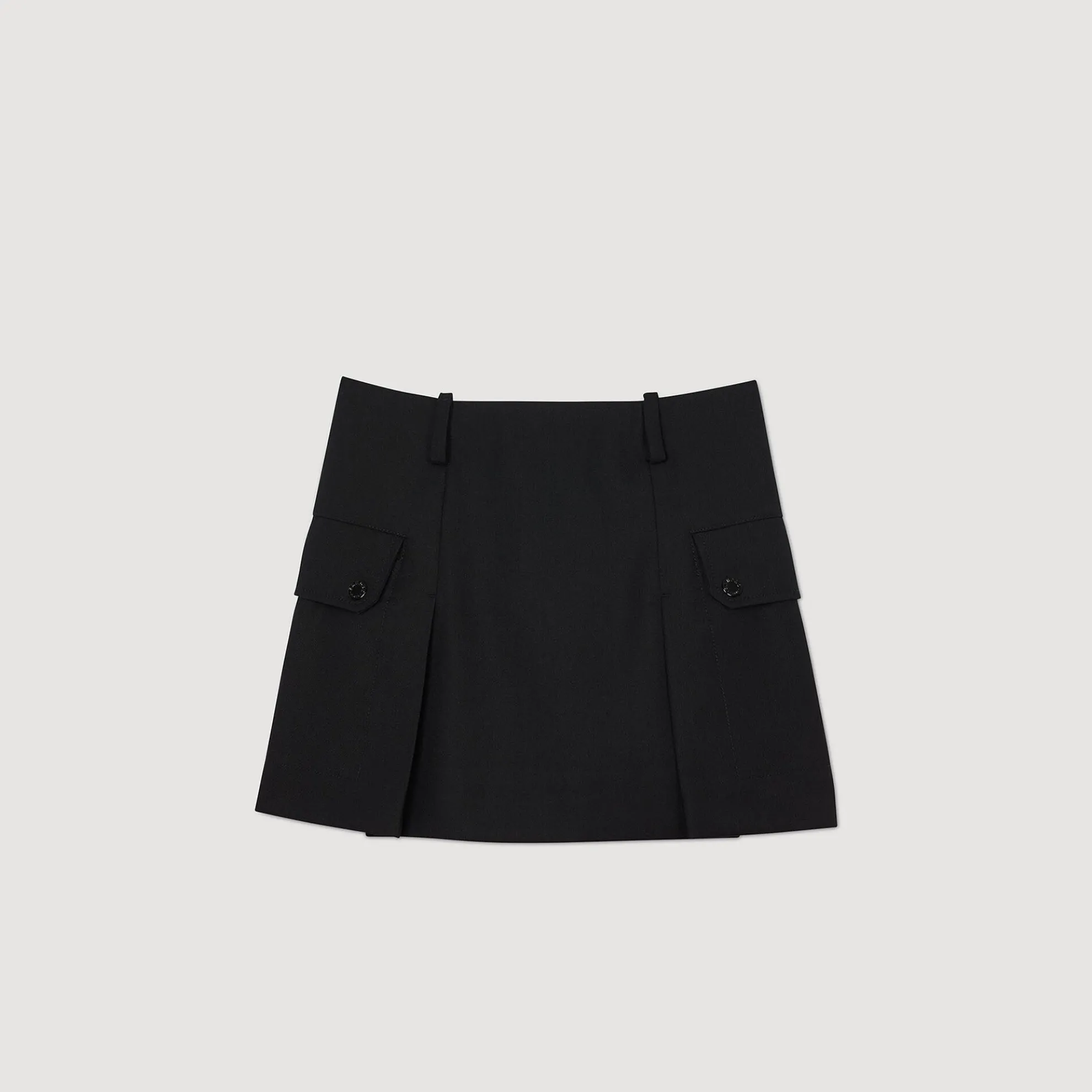 Korte rok met klepzakken aan de zijkanten en riemlussen in de taille.