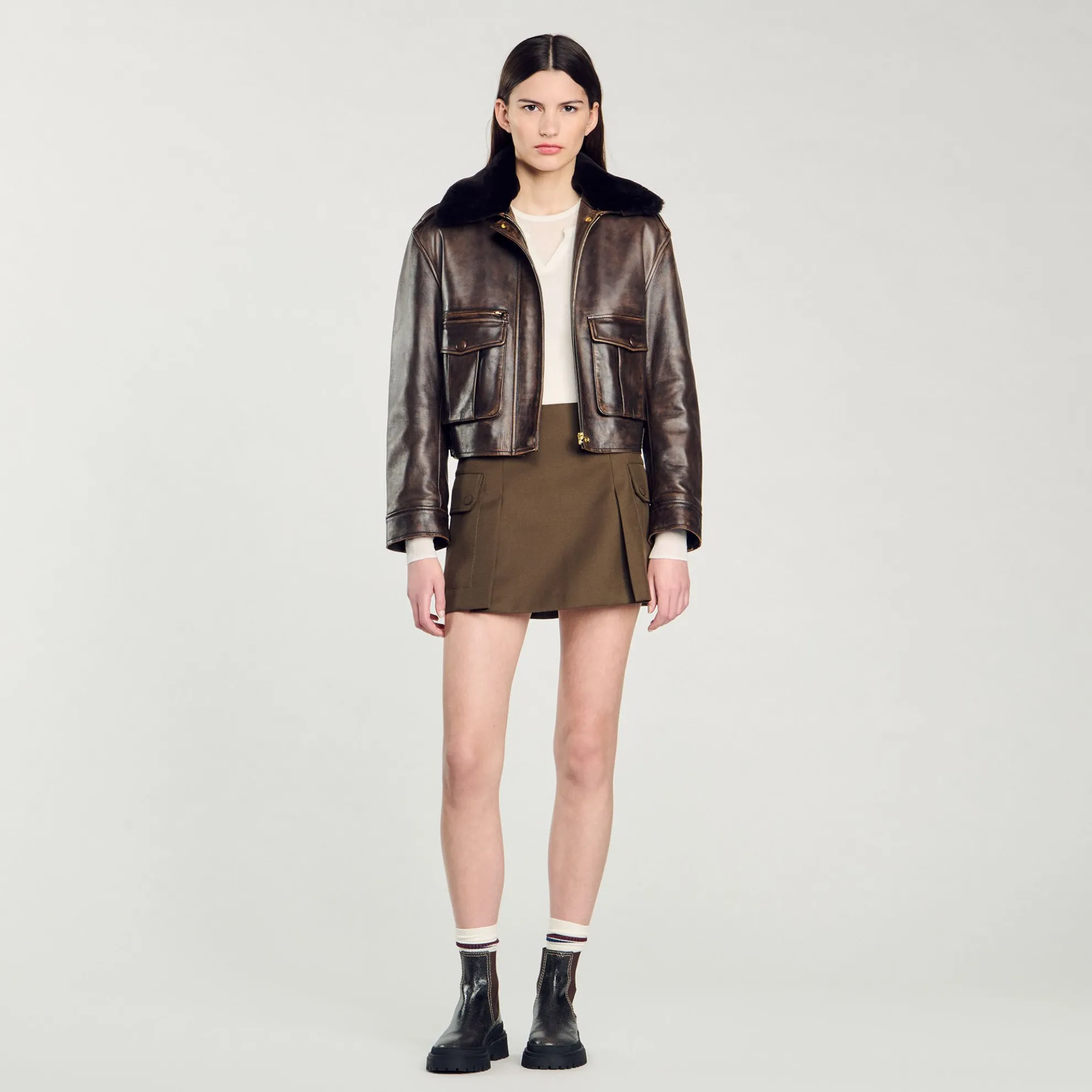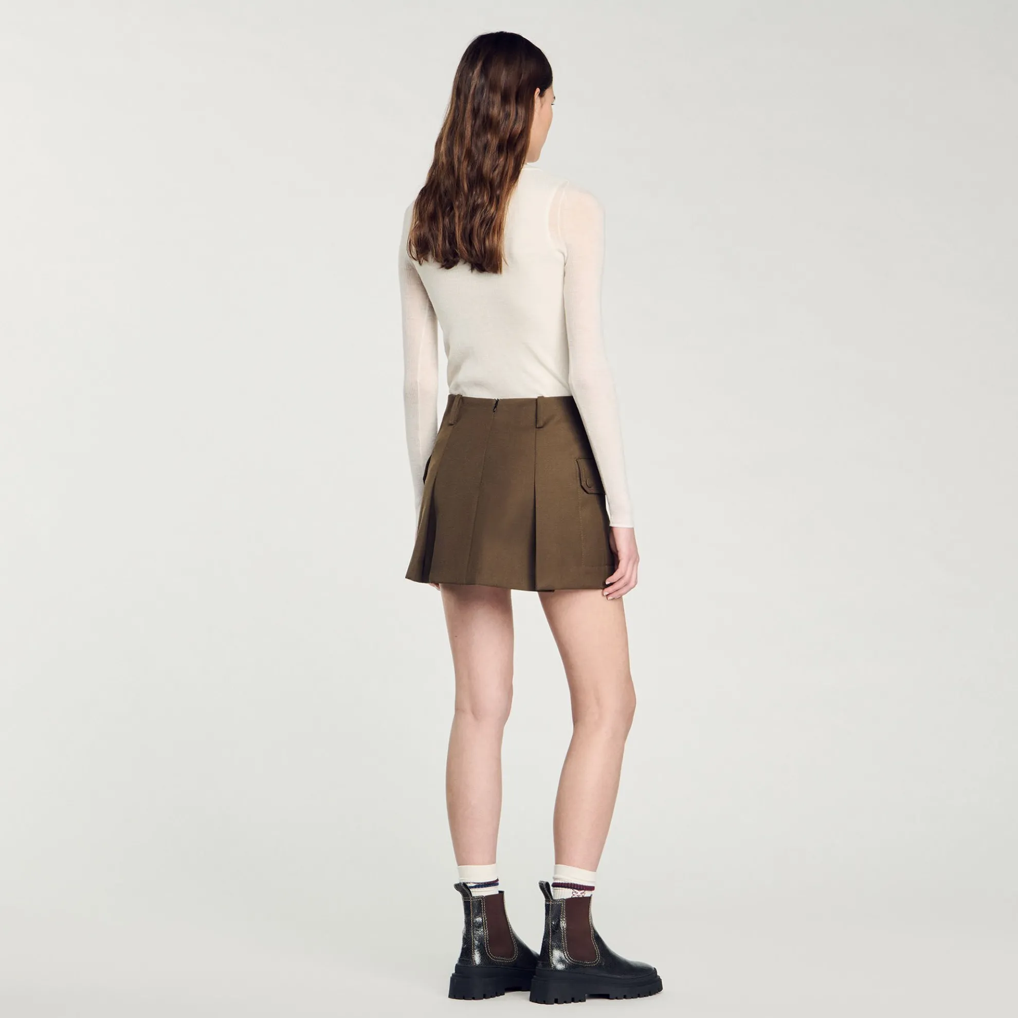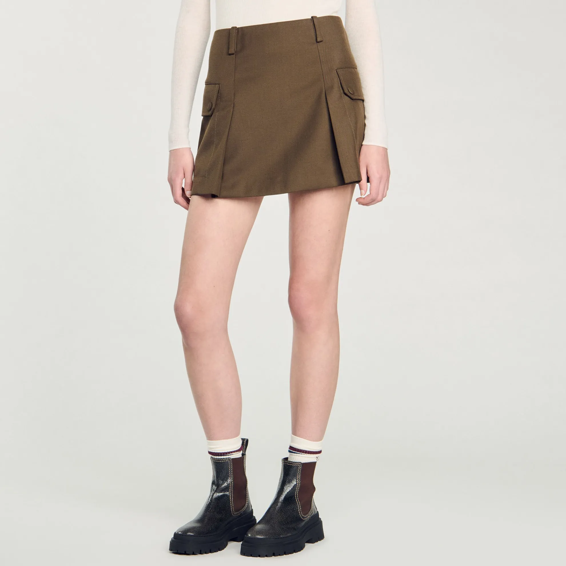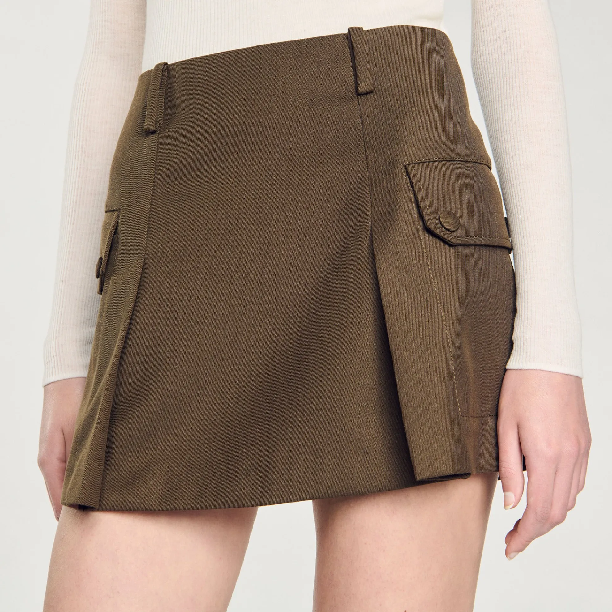 Korte rok met stolpplooien, grote klepzakken aan de zijkanten en riemlussen.