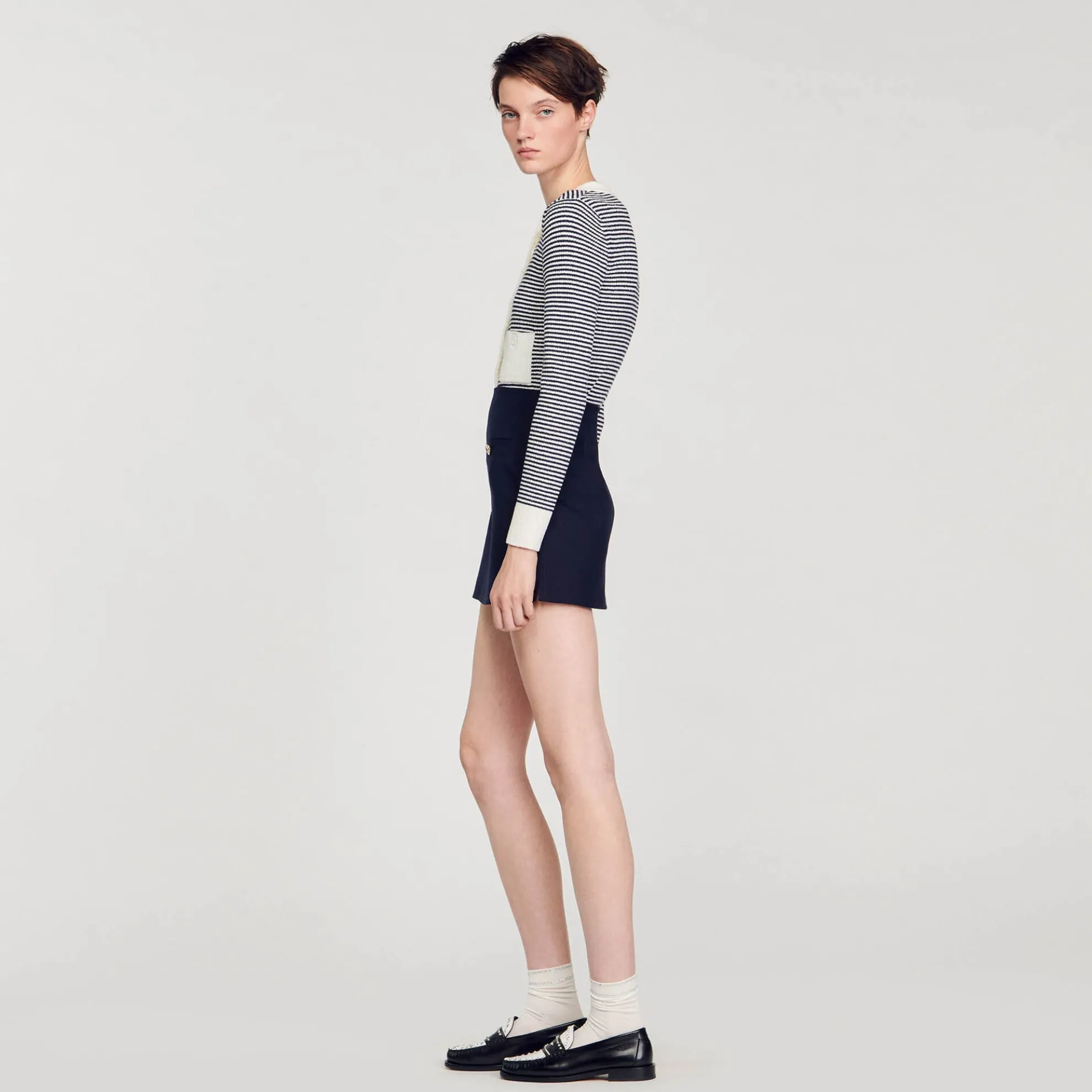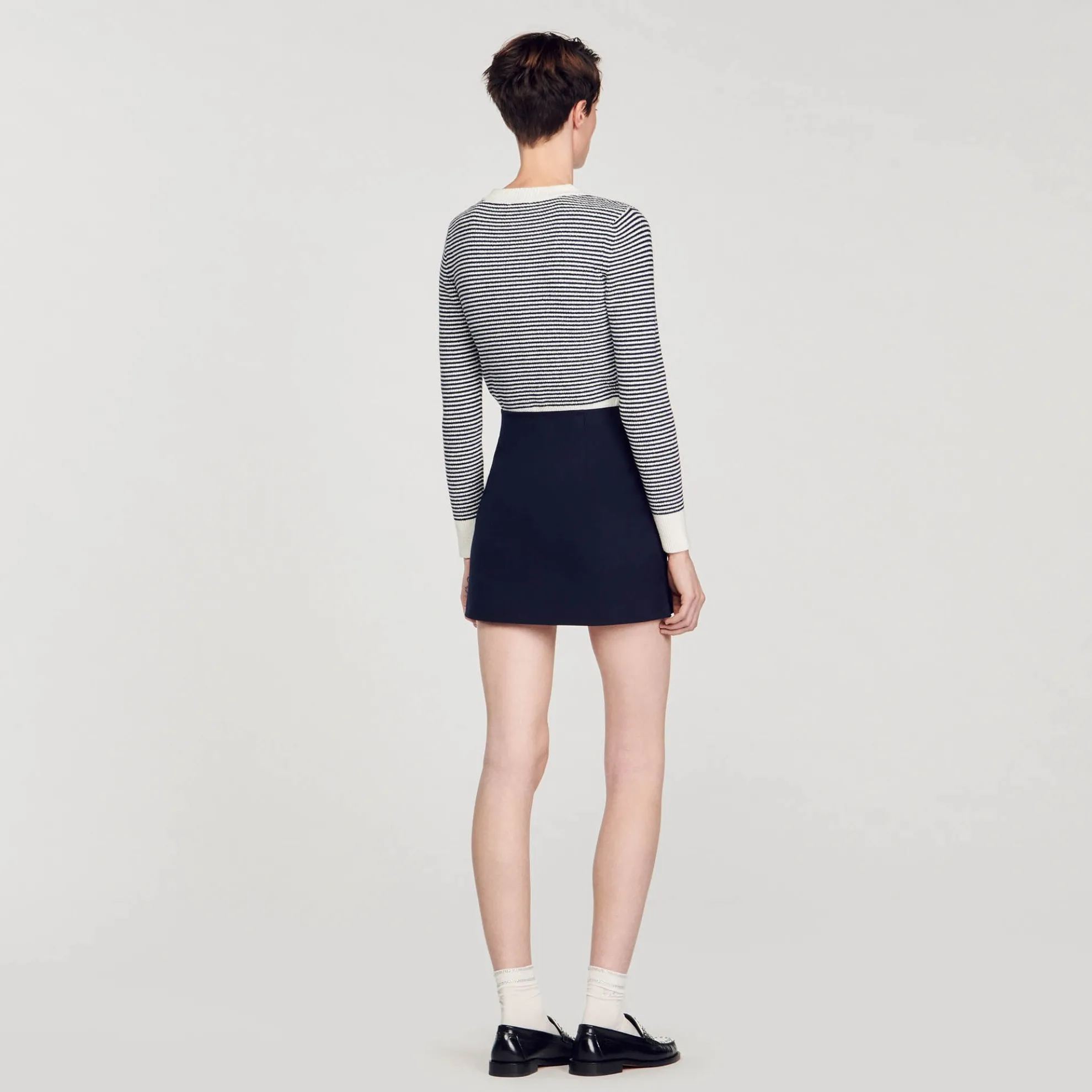 Korte rok van wollen keperstof met kleine zijsplitten en valse paspelzakken aan de voorkant met sierknopen.
