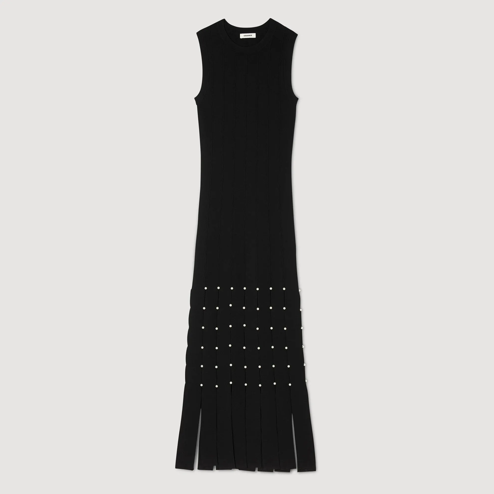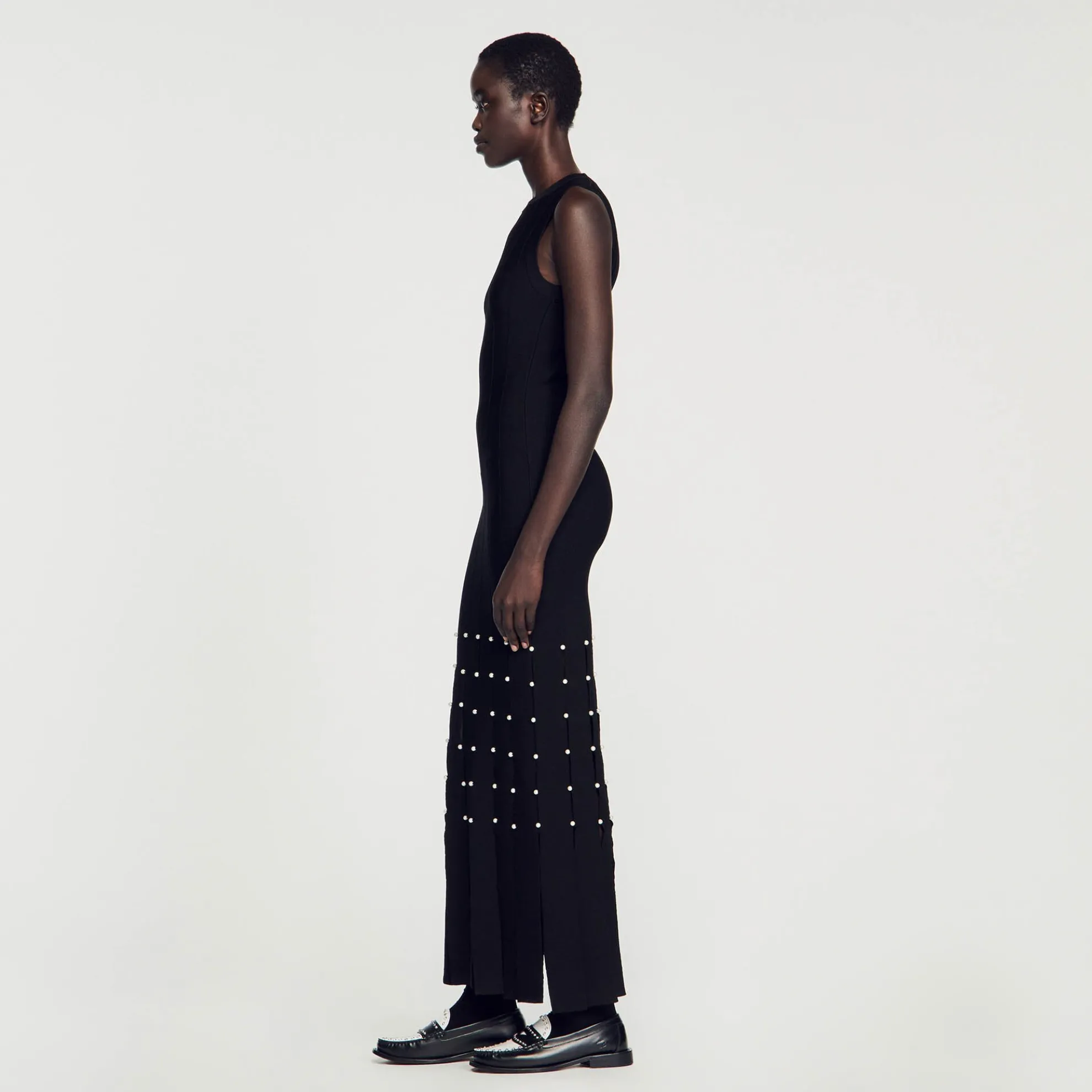 Mouwloze ribgebreide lange jurk met ronde hals, asymmetrische split aan de voorkant en met stras versierde opengewerkte details.