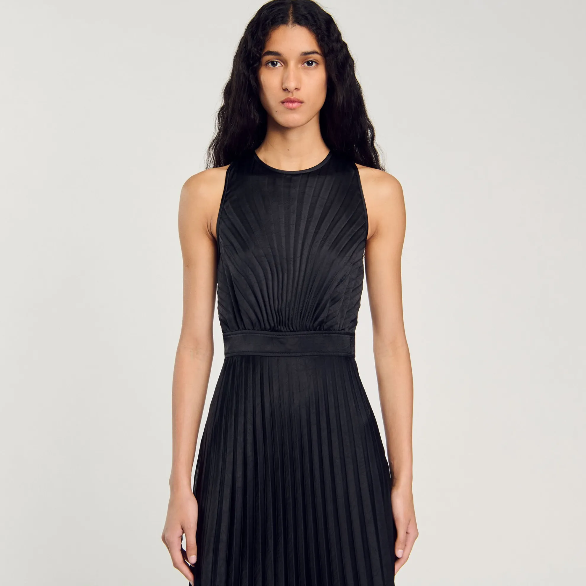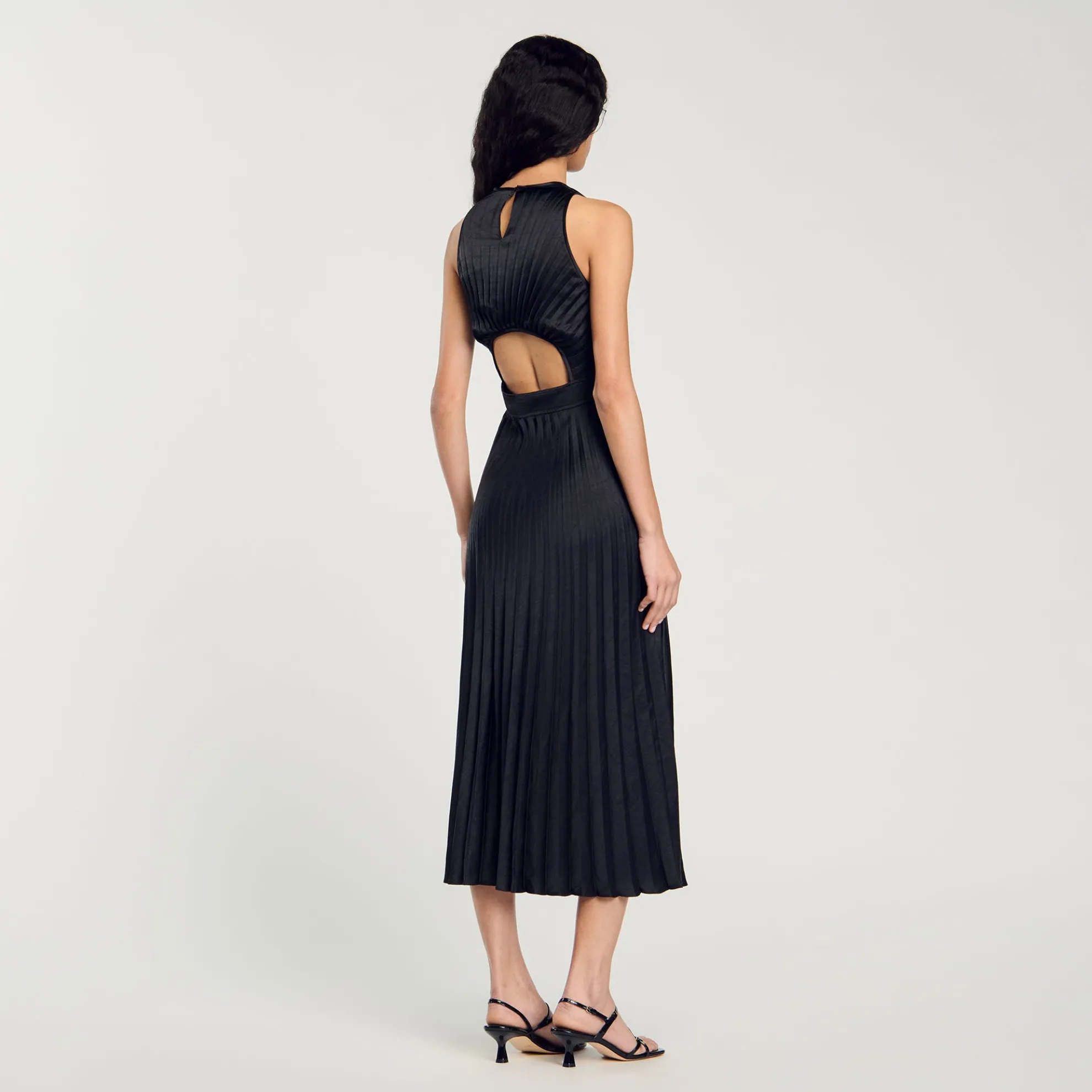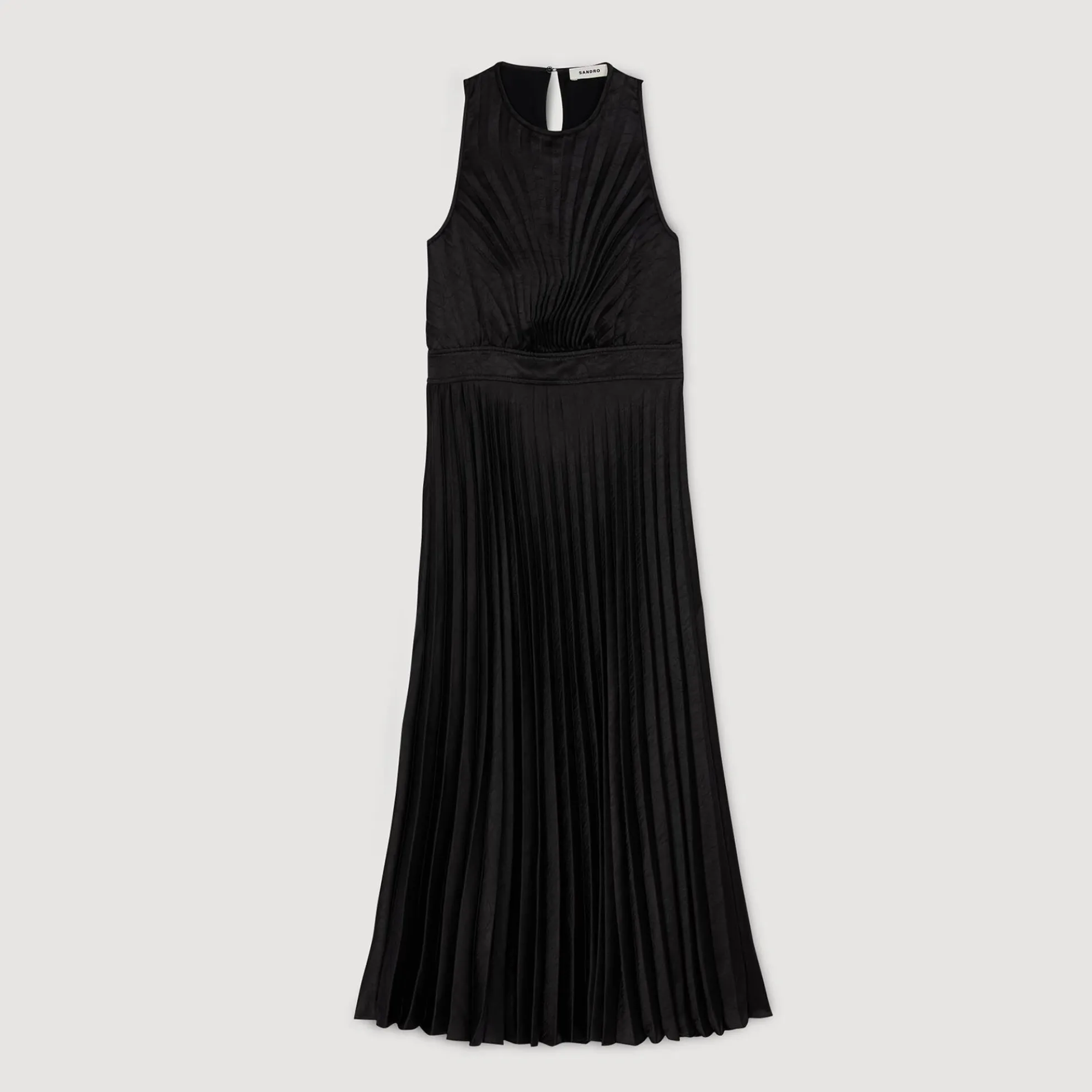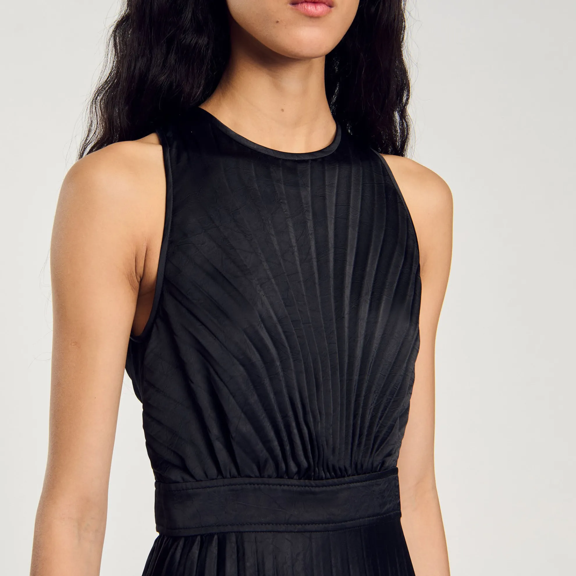 Lange soepelvallende jurk zonder mouwen met plissé plooien, een ronde hals, een opgestikte ceintuur in de taille en een cut-out in druppelvorm aan de voorkant.