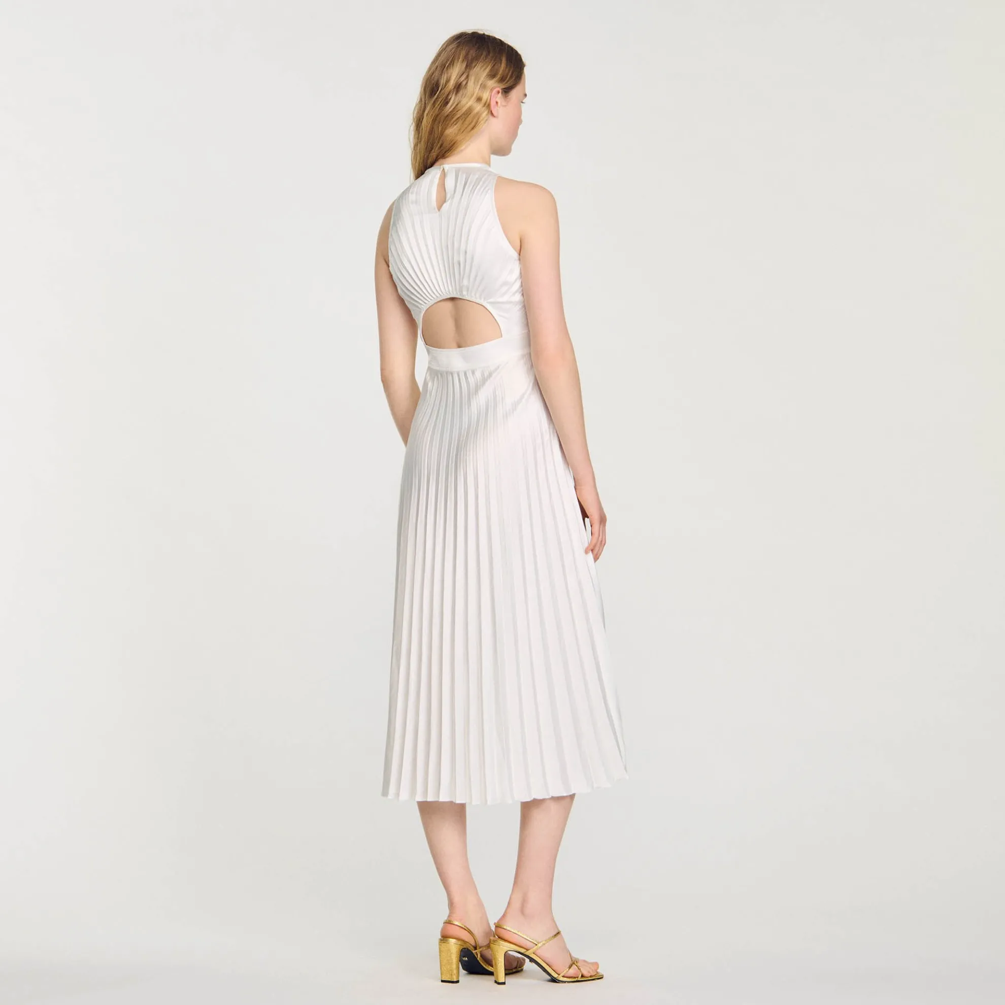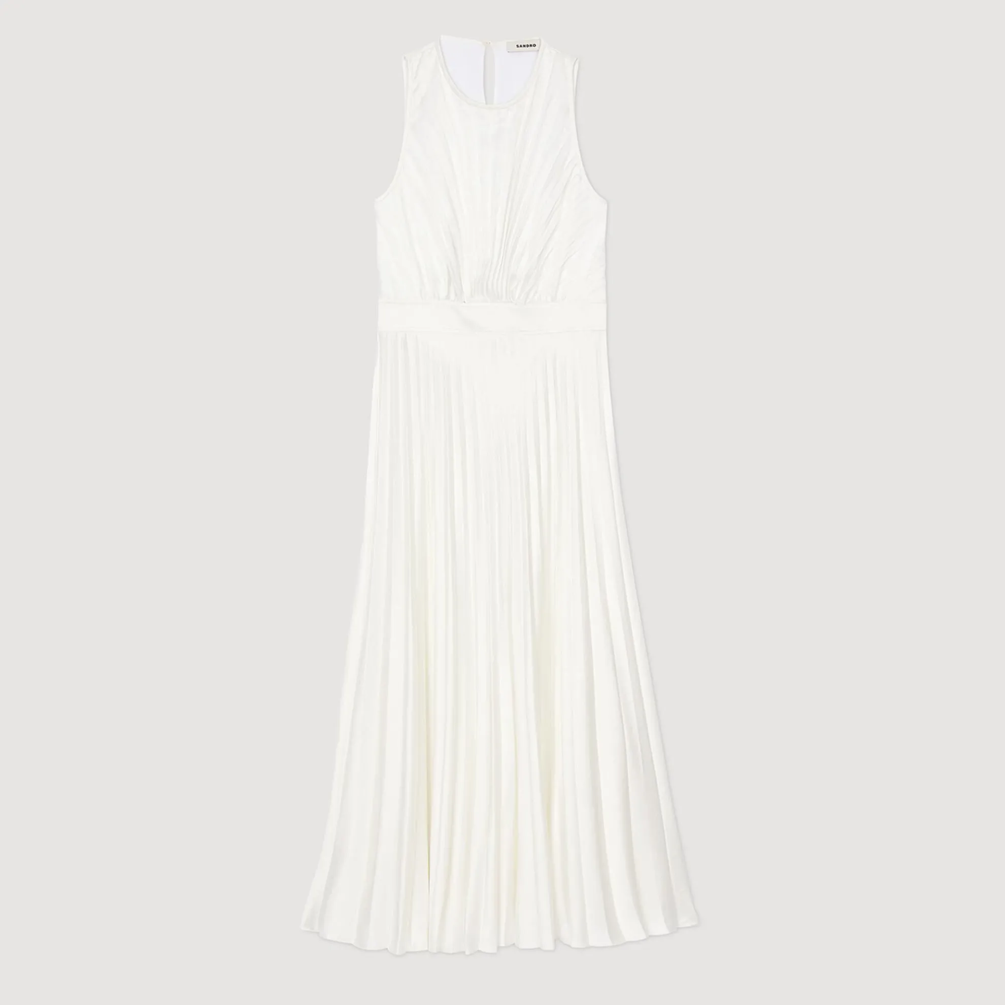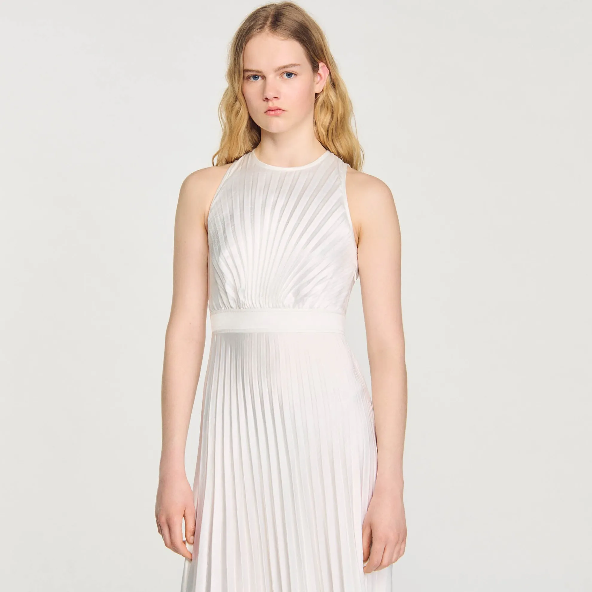 Lange soepelvallende jurk zonder mouwen met plissé plooien, een ronde hals, een opgestikte ceintuur in de taille en een cut-out in druppelvorm aan de voorkant.