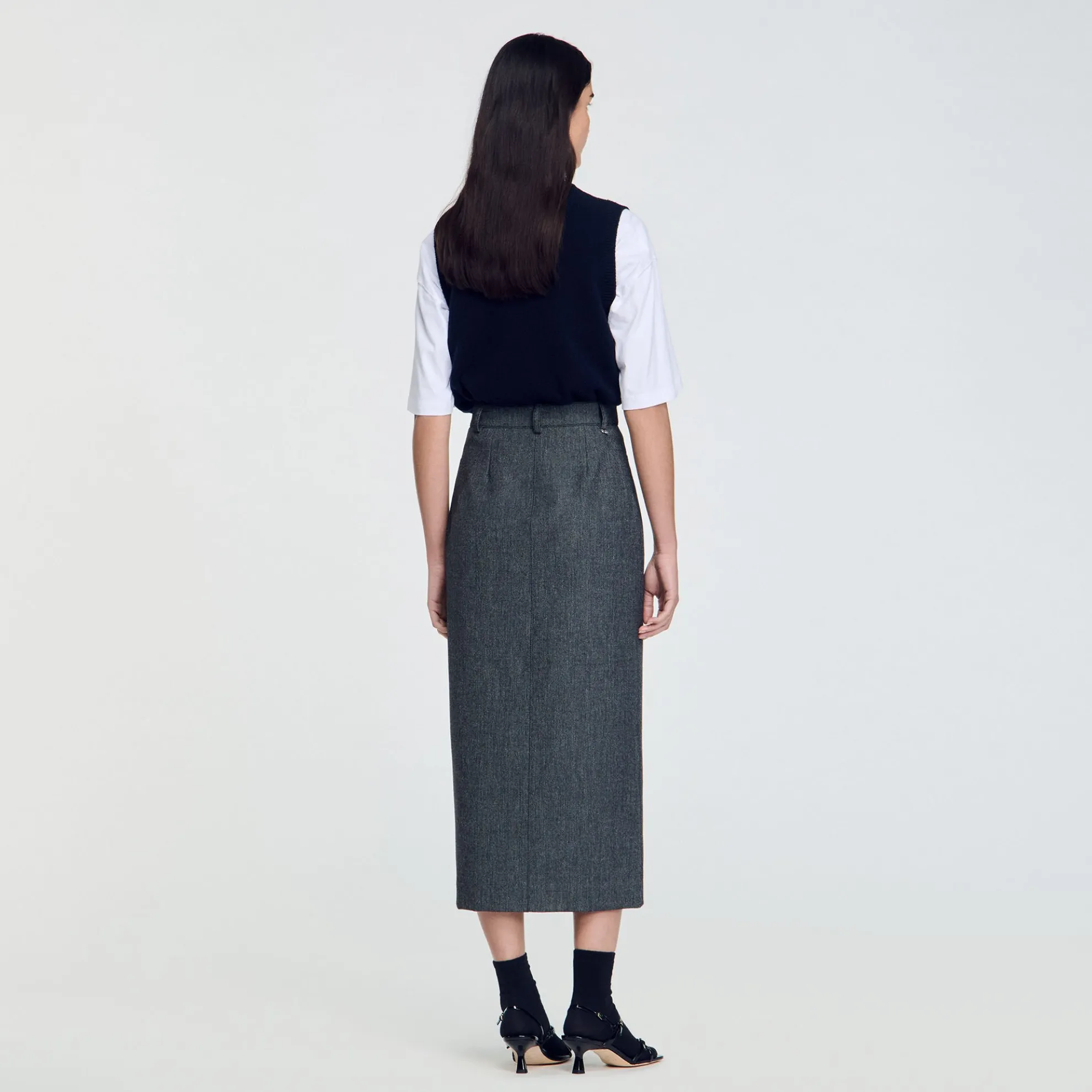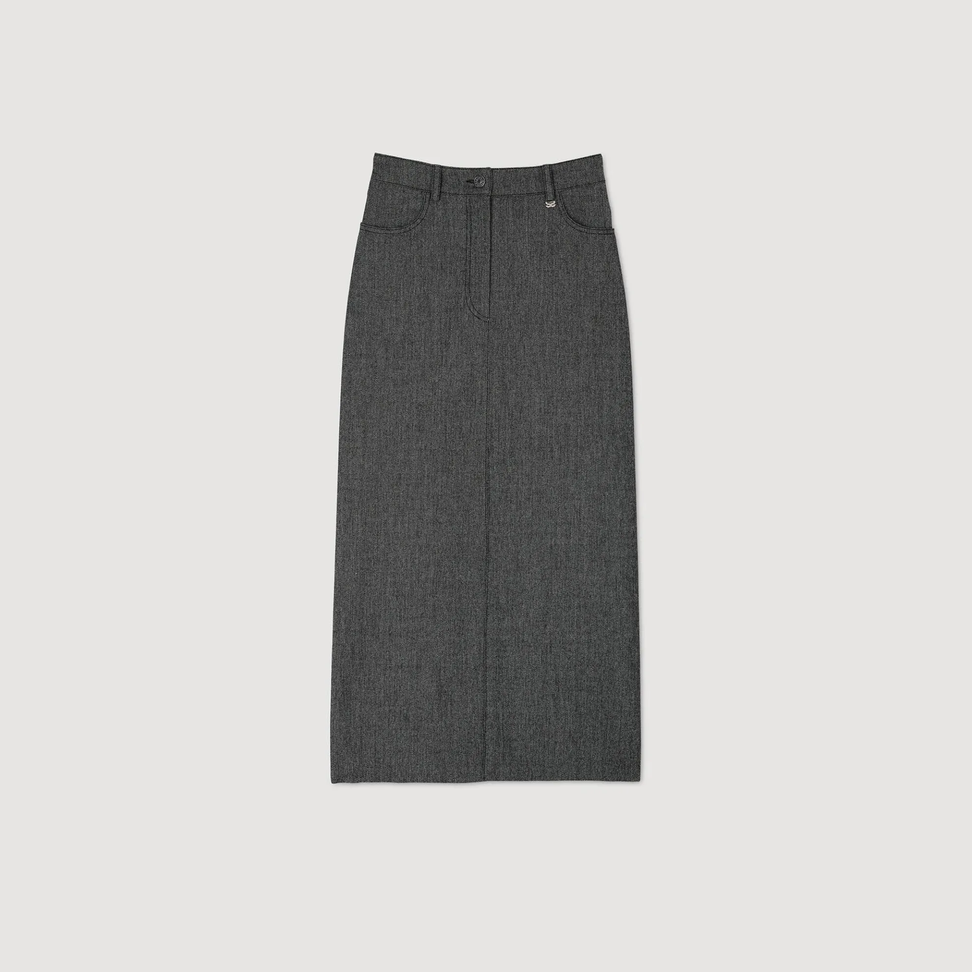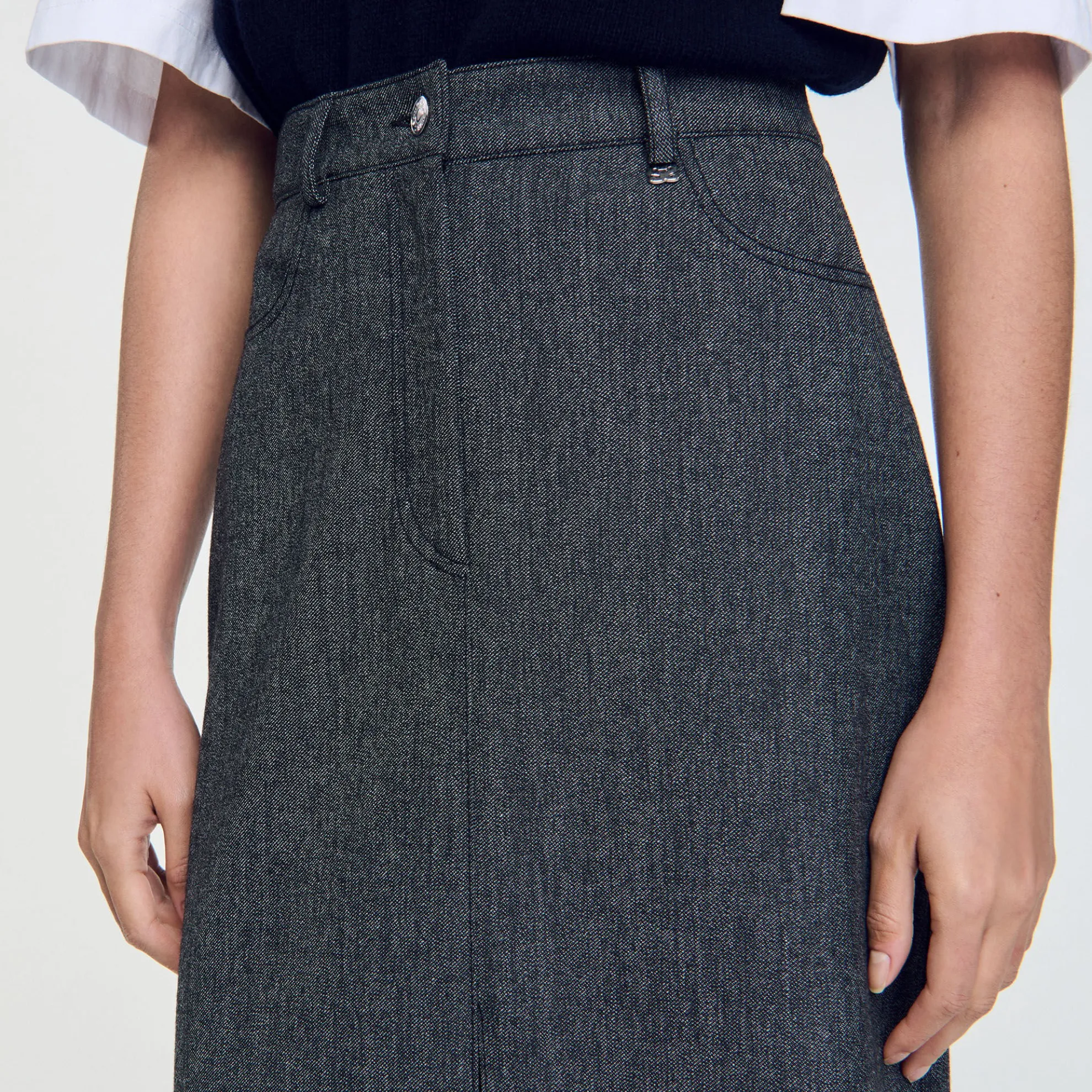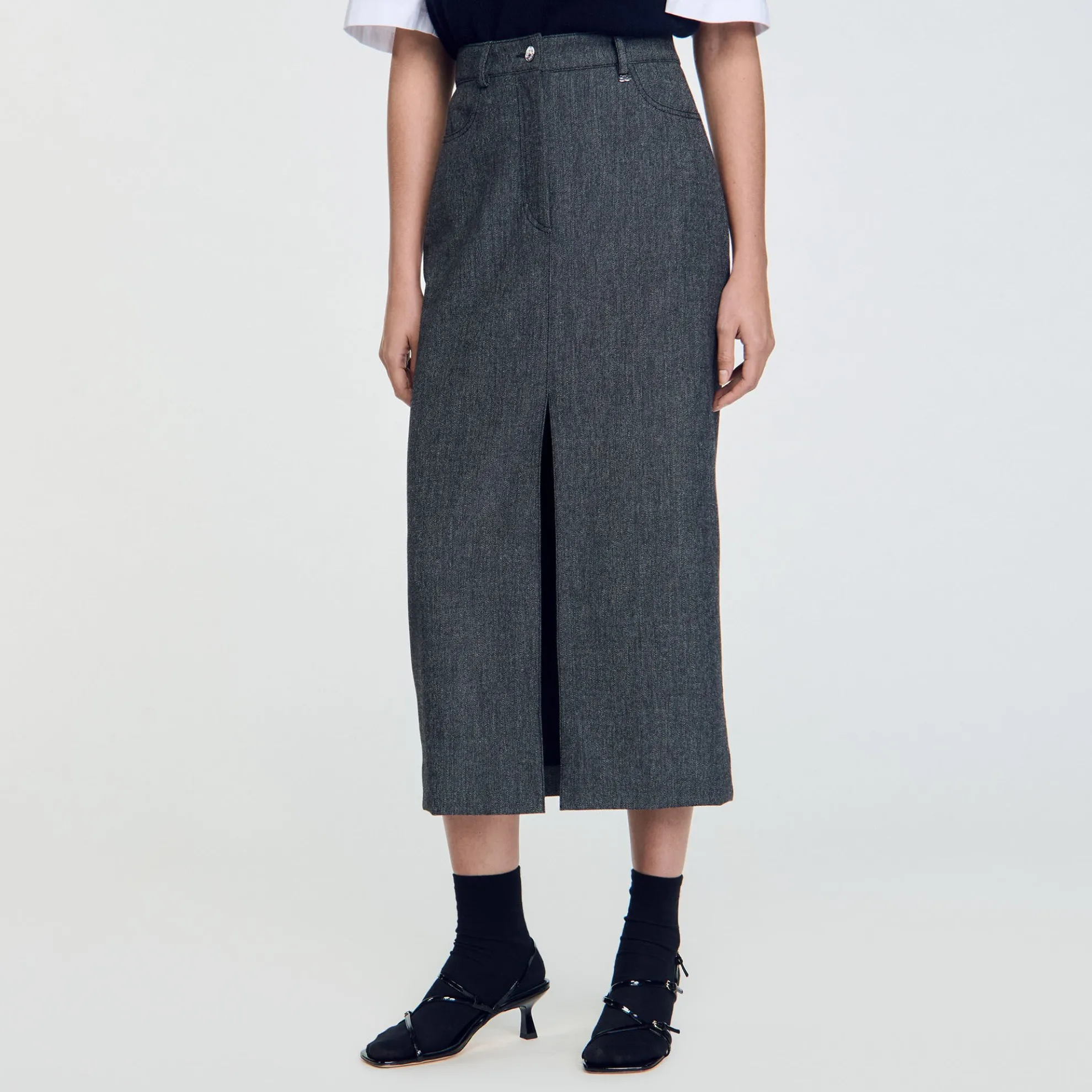 Lange rok met split en riemlussen in de taille versierd met kleine SANDRO kwastjes en een split aan de voorkant.