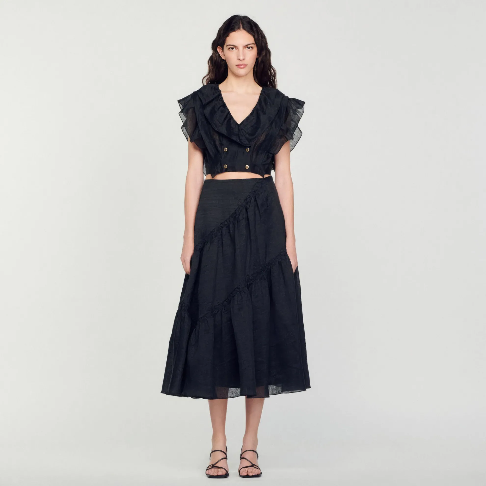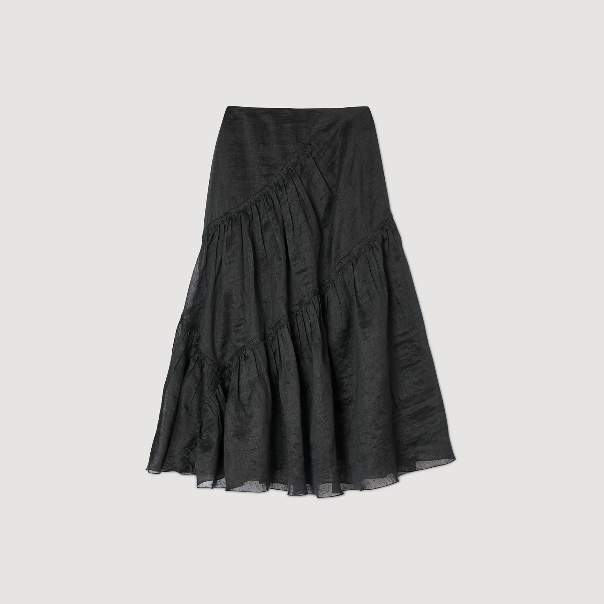 Lange, enigszins wijd uitlopende rok met volants en plooitjes, en een ritssluiting aan de zijkant.