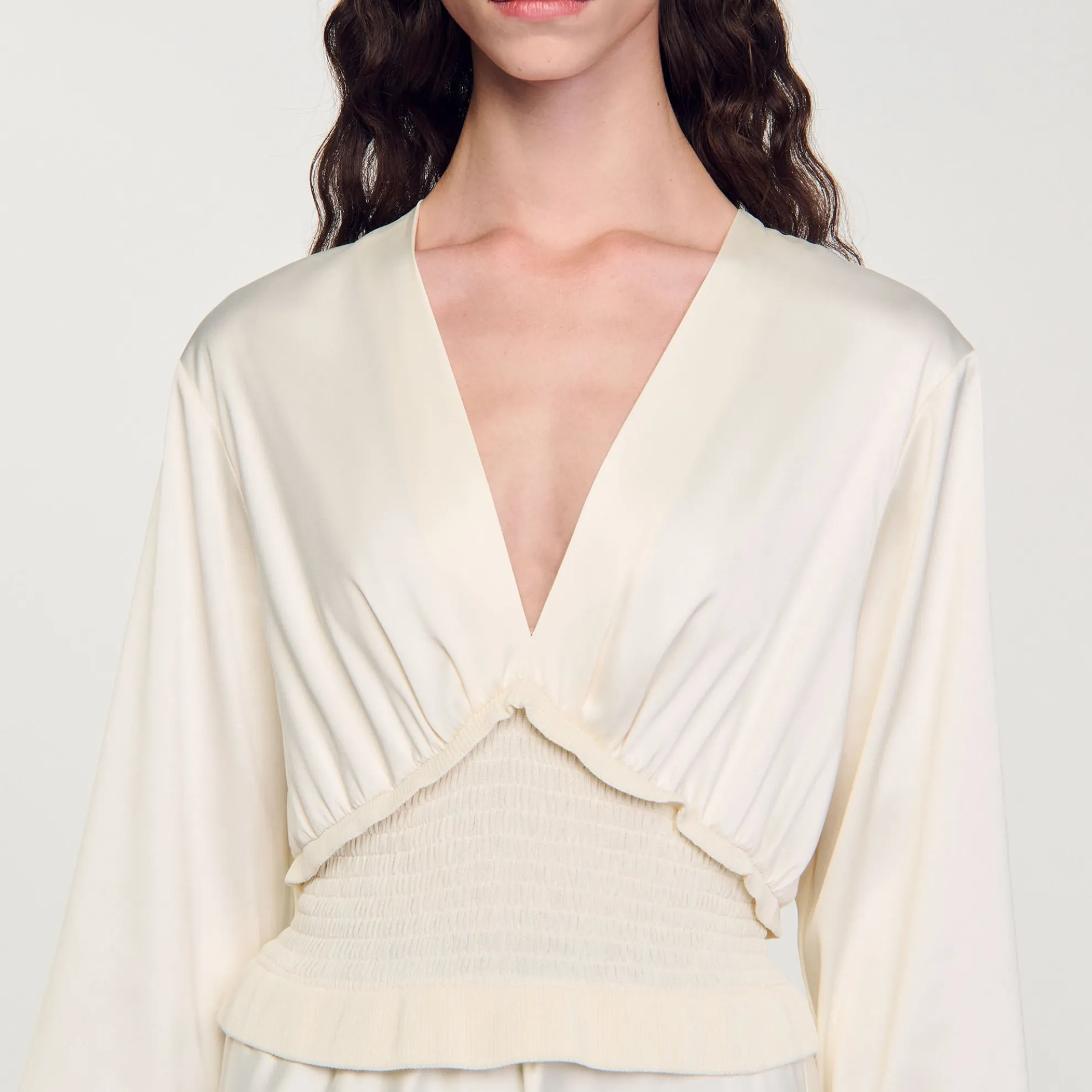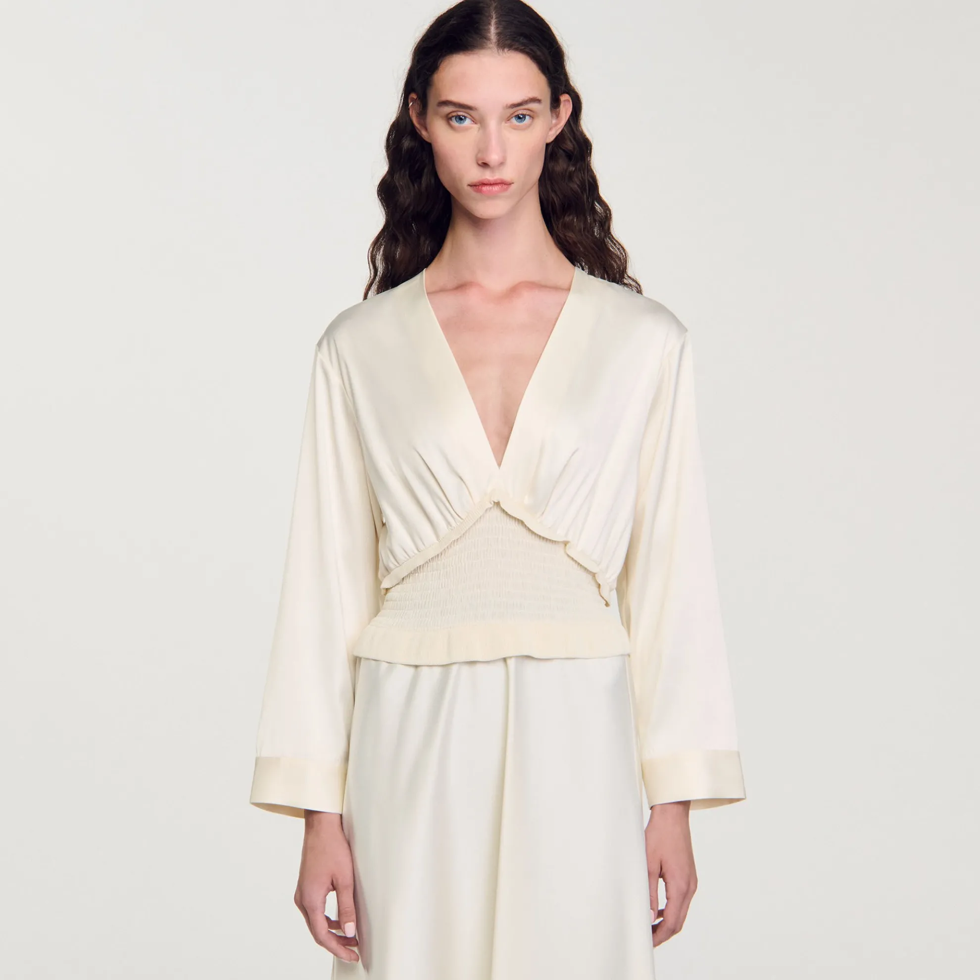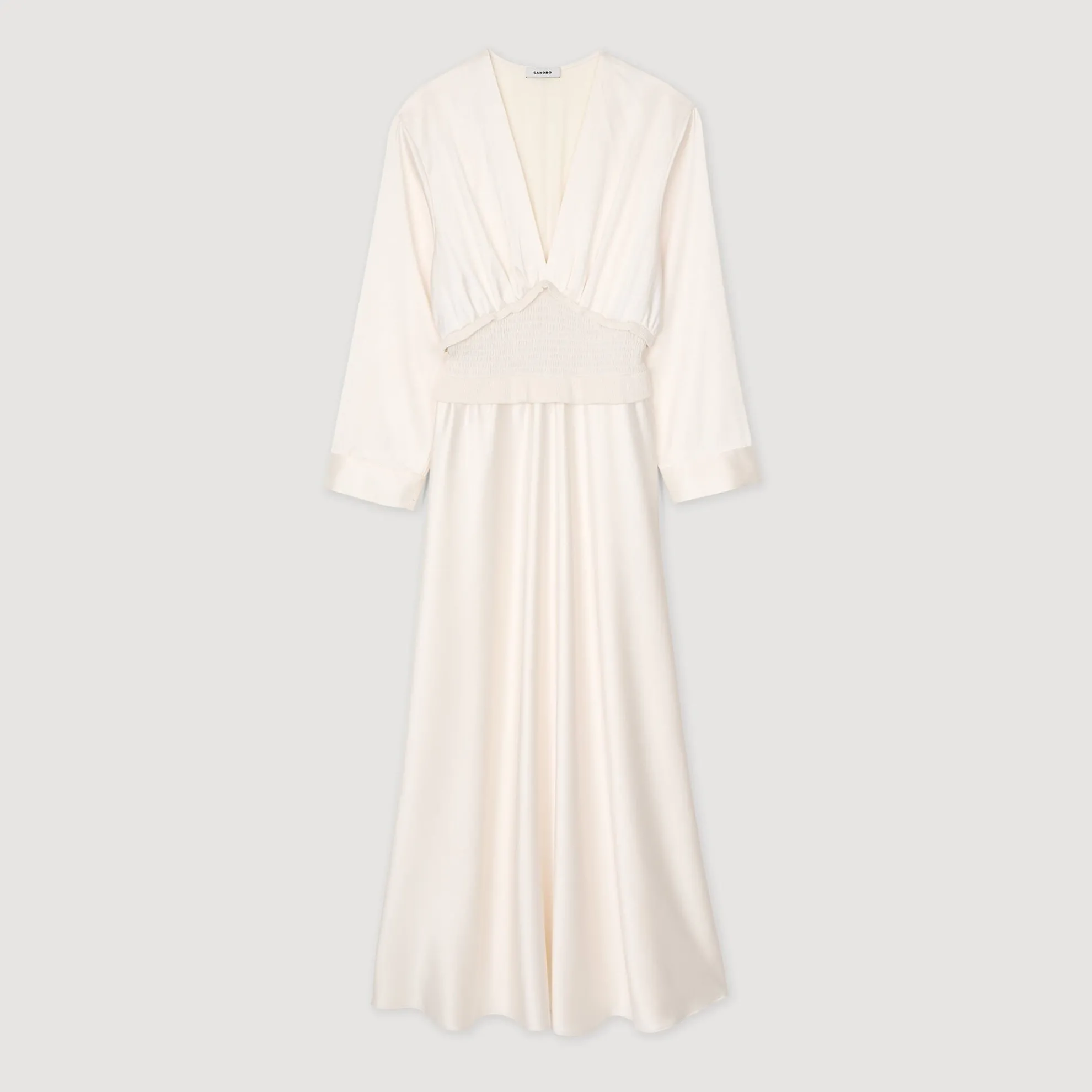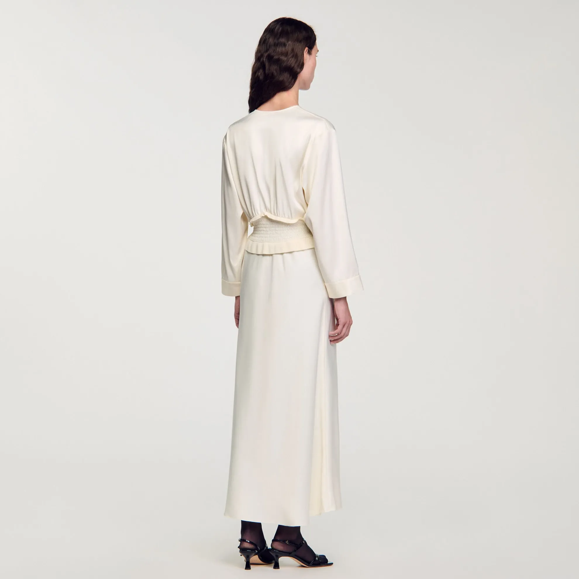 Lange soepelvallende satijnen jurk, uitlopend aan de onderkant, met een V-hals met plooien en ruches, een gesmokte band in de taille en lange mouwen.