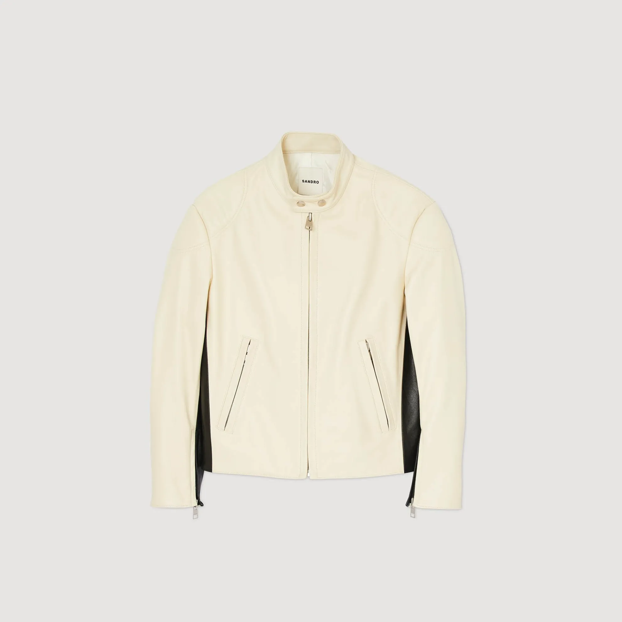 Leren bikerjack met contrasterende inzetstukken, ritssluiting, opstaande kraag met drukknoop, lange mouwen met manchetten met ritssluiting en zakken aan de voorkant.