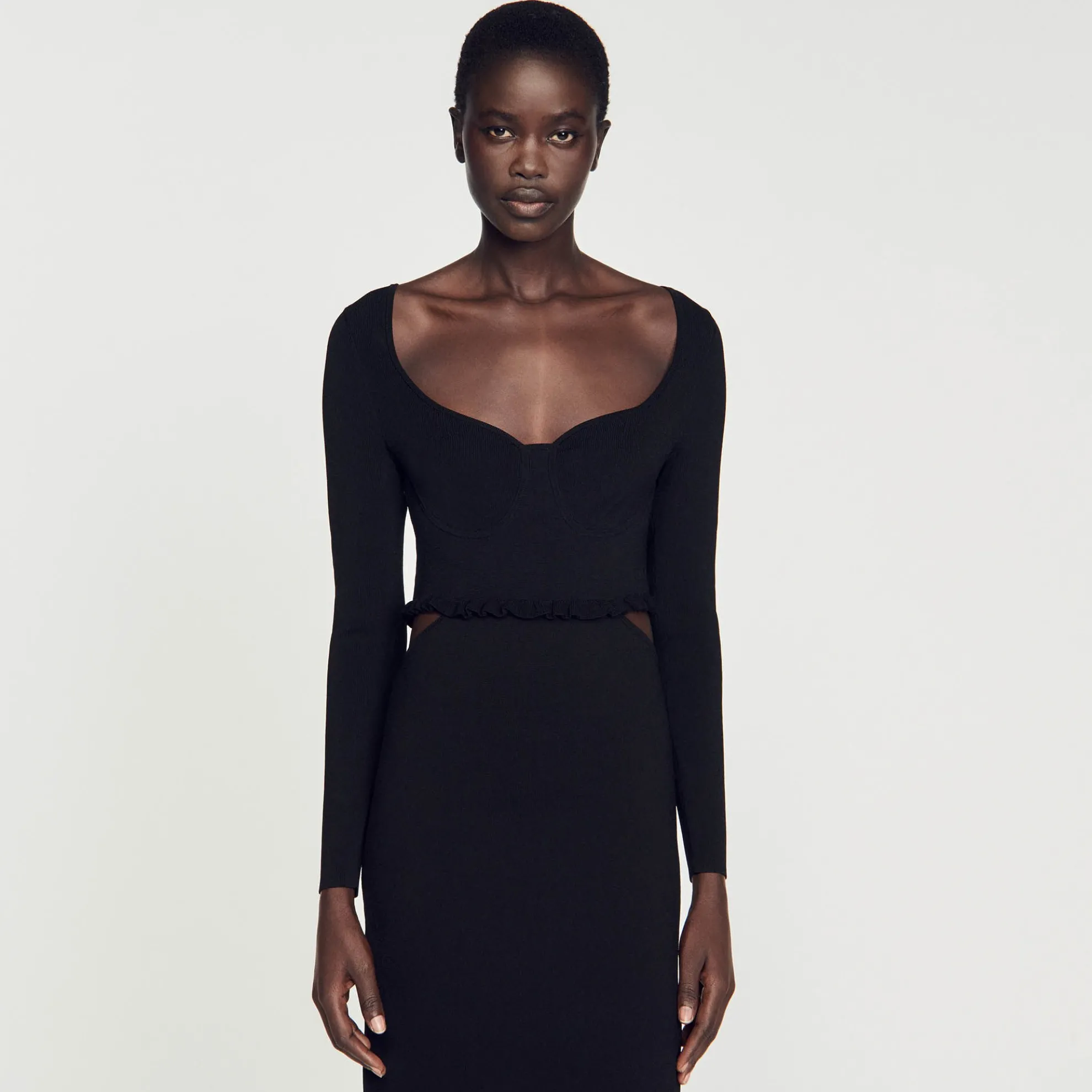 Ribgebreide midi-jurk met een hartvormige sweetheart halslijn, strapless bovenkant met volants, lange mouwen en uitgesnijdingen aan de zijkanten.